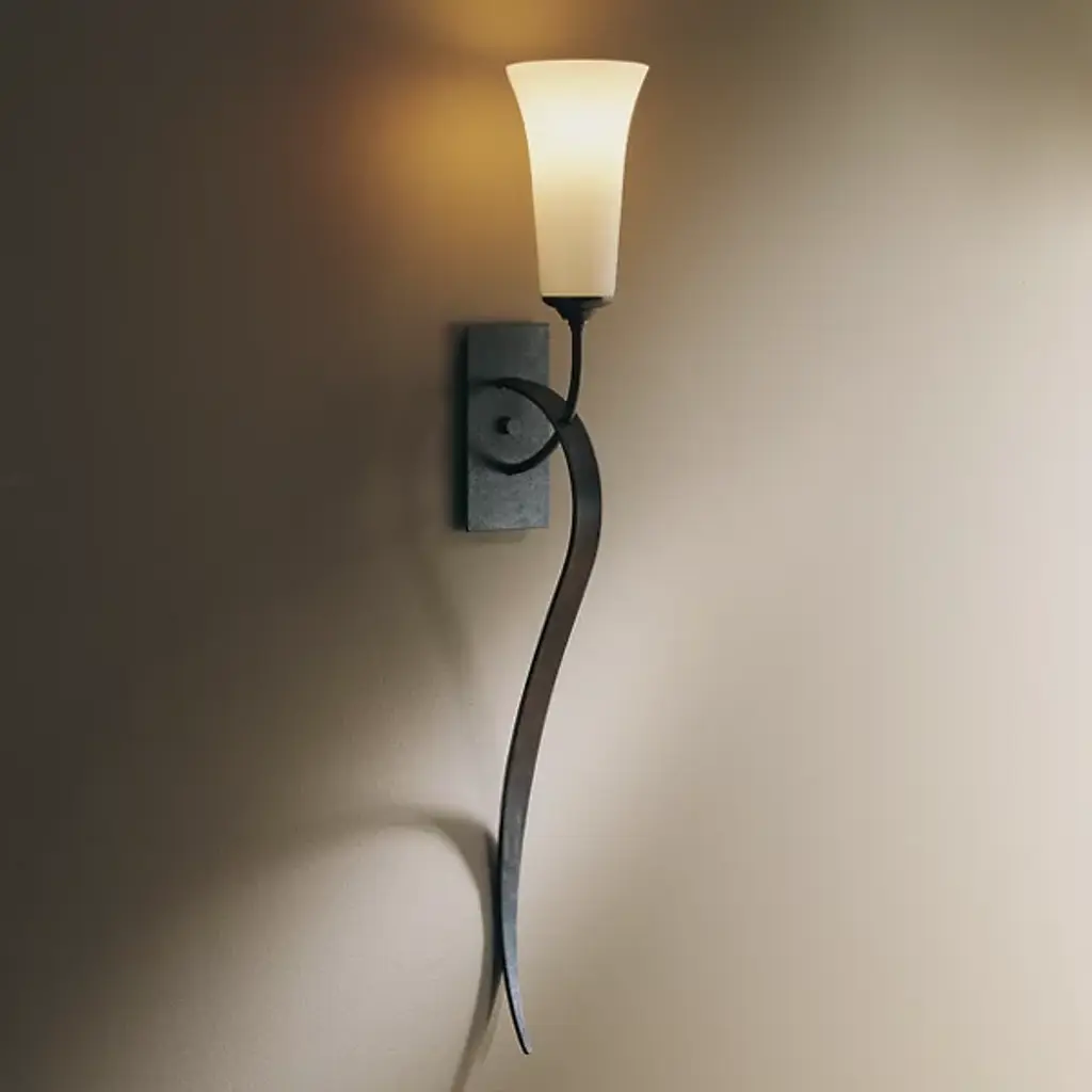 The Hubbardton Forge Sweeping Taper Wall Sconce With Glass provides bright up-lighting in a dramatic design that celebrates the beauty of simple lines and expert craftsmanship. The lighting fixture features hand-forged wrought iron for durability while a slim, looped arm holds up a bell-shaped glass diffuser that works with the internal incandescent lamping. The lamping and glass work in tandem to produce a warm, comforting aura of light that easily encompasses the immediate installation space. Can be used in areas like living rooms, hallways, and bedrooms.