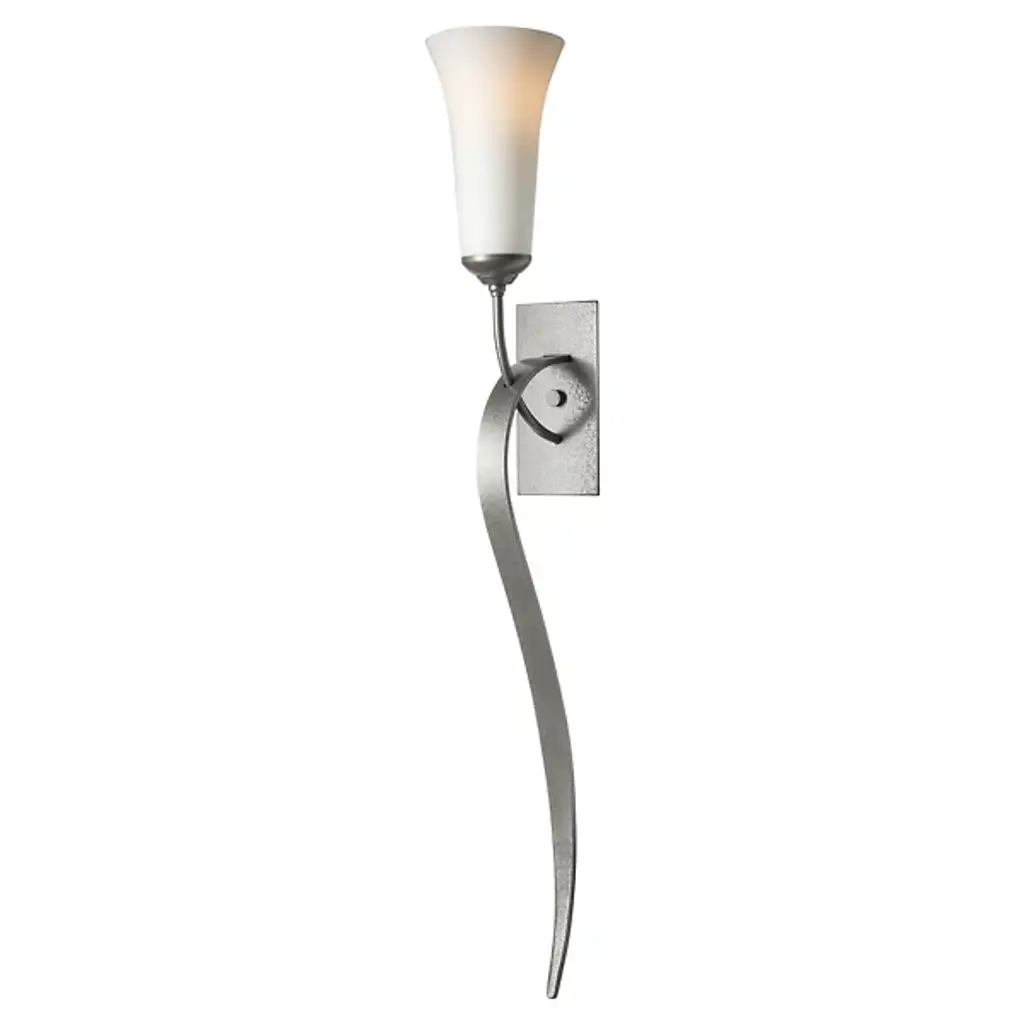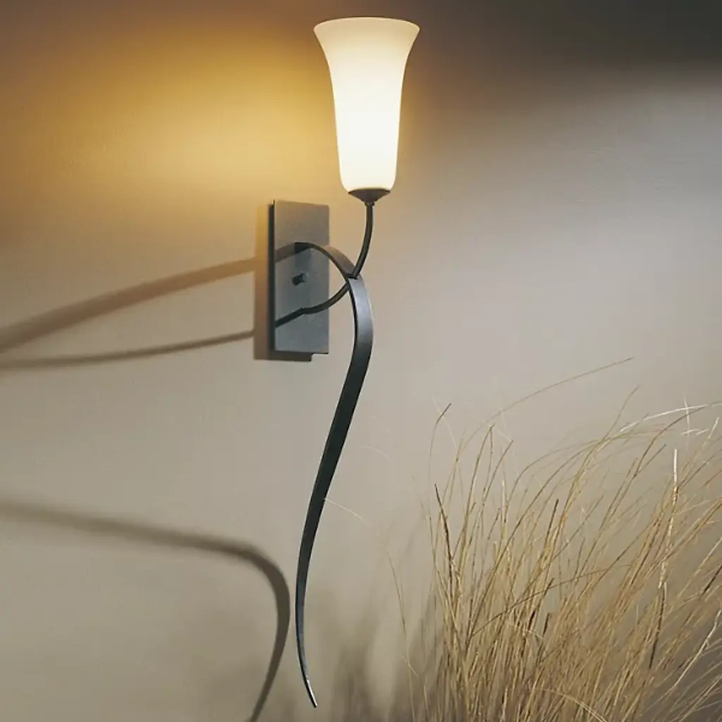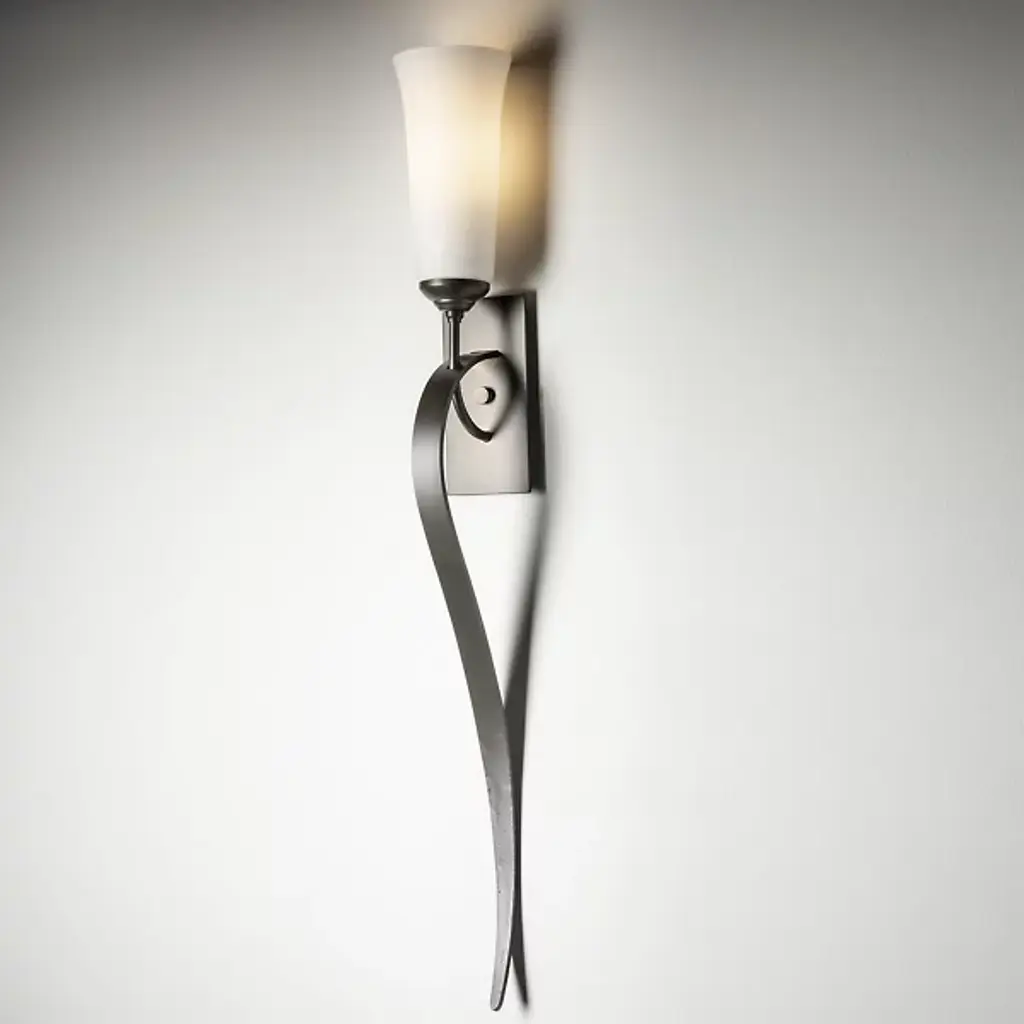 The Hubbardton Forge Sweeping Taper Wall Sconce With Glass provides bright up-lighting in a dramatic design that celebrates the beauty of simple lines and expert craftsmanship. The lighting fixture features hand-forged wrought iron for durability while a slim, looped arm holds up a bell-shaped glass diffuser that works with the internal incandescent lamping. The lamping and glass work in tandem to produce a warm, comforting aura of light that easily encompasses the immediate installation space. Can be used in areas like living rooms, hallways, and bedrooms.