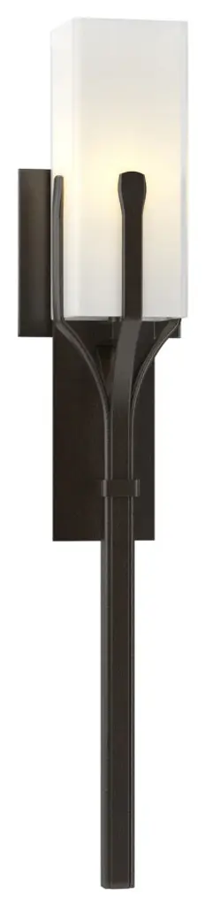 The Hubbardton Forge Sweeping Taper Wall Sconce With Glass provides bright up-lighting in a dramatic design that celebrates the beauty of simple lines and expert craftsmanship. The lighting fixture features hand-forged wrought iron for durability while a slim, looped arm holds up a bell-shaped glass diffuser that works with the internal incandescent lamping. The lamping and glass work in tandem to produce a warm, comforting aura of light that easily encompasses the immediate installation space. Can be used in areas like living rooms, hallways, and bedrooms.