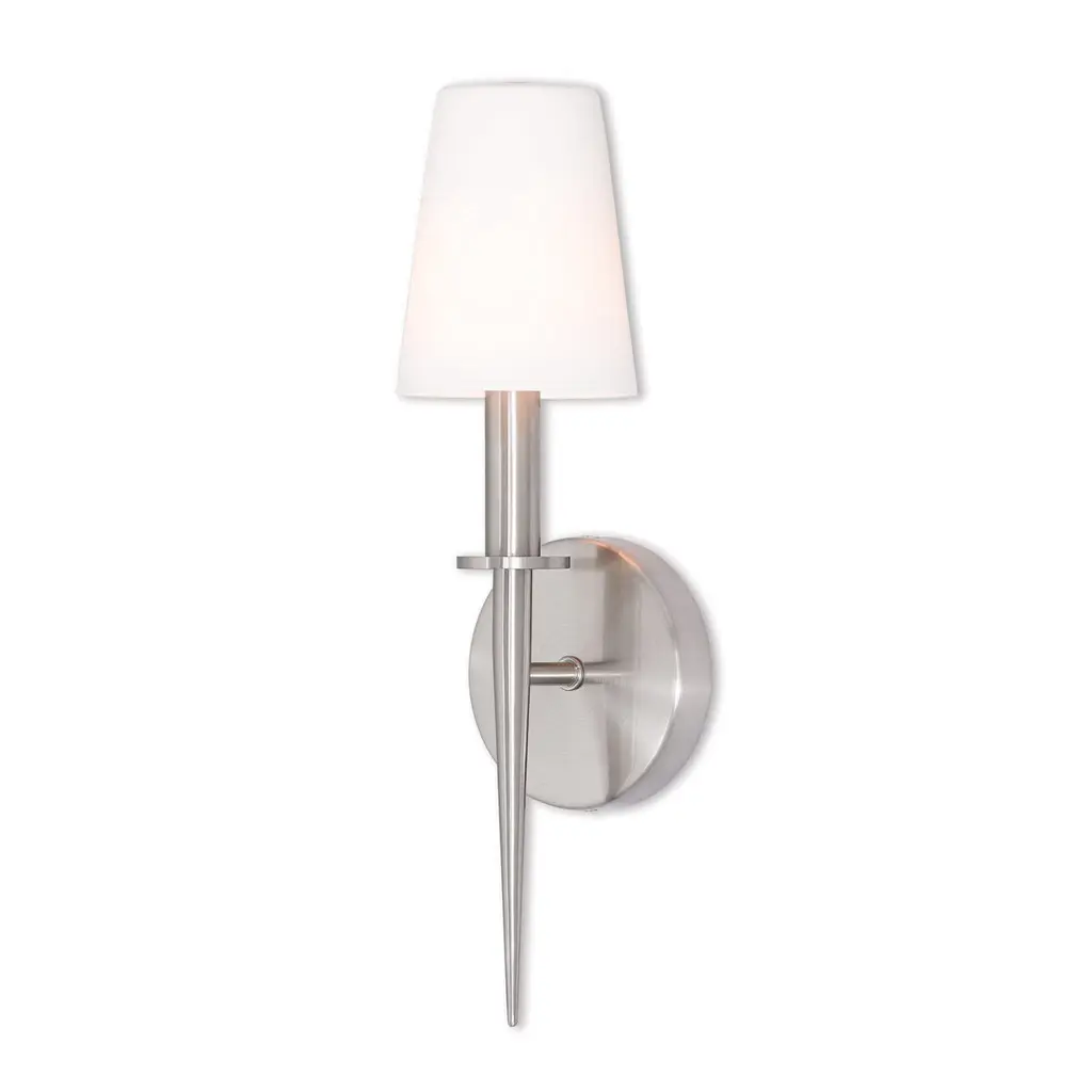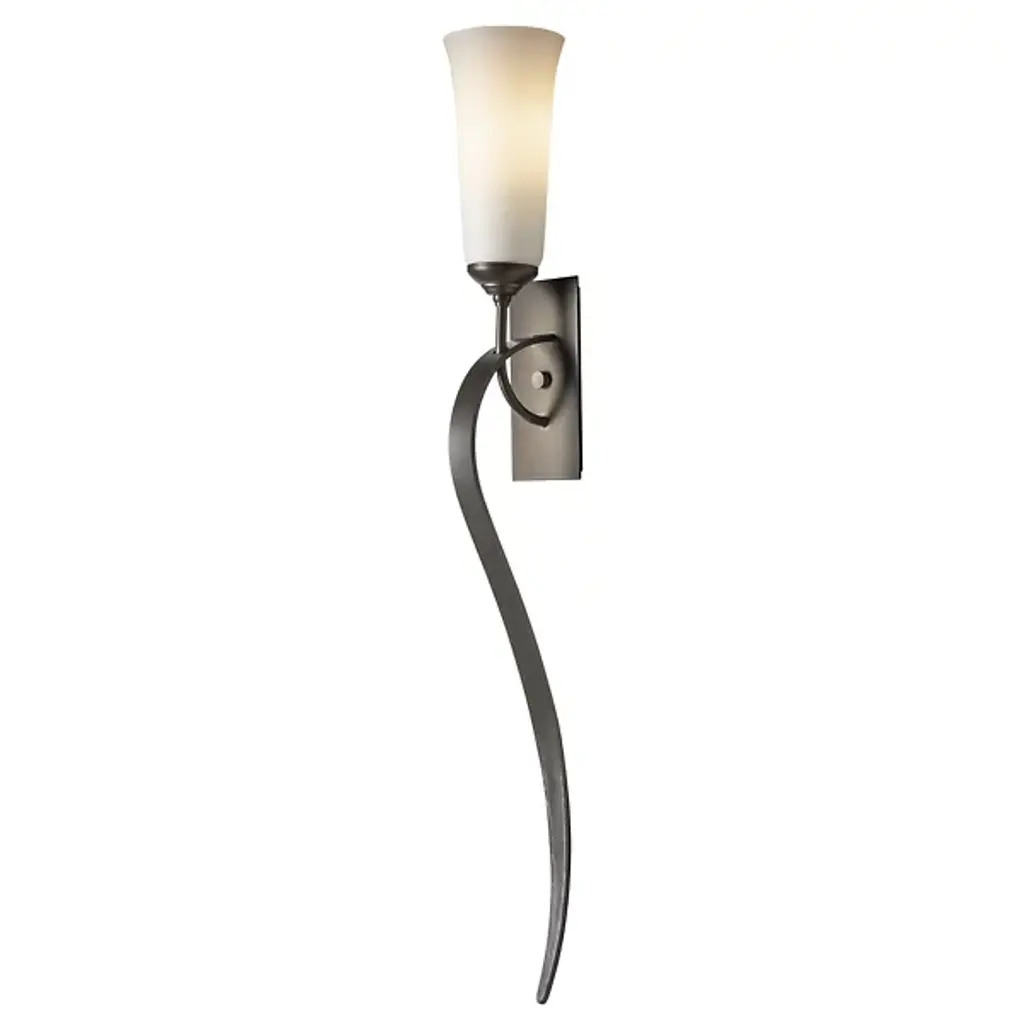 The Hubbardton Forge Sweeping Taper Wall Sconce With Glass provides bright up-lighting in a dramatic design that celebrates the beauty of simple lines and expert craftsmanship. The lighting fixture features hand-forged wrought iron for durability while a slim, looped arm holds up a bell-shaped glass diffuser that works with the internal incandescent lamping. The lamping and glass work in tandem to produce a warm, comforting aura of light that easily encompasses the immediate installation space. Can be used in areas like living rooms, hallways, and bedrooms.