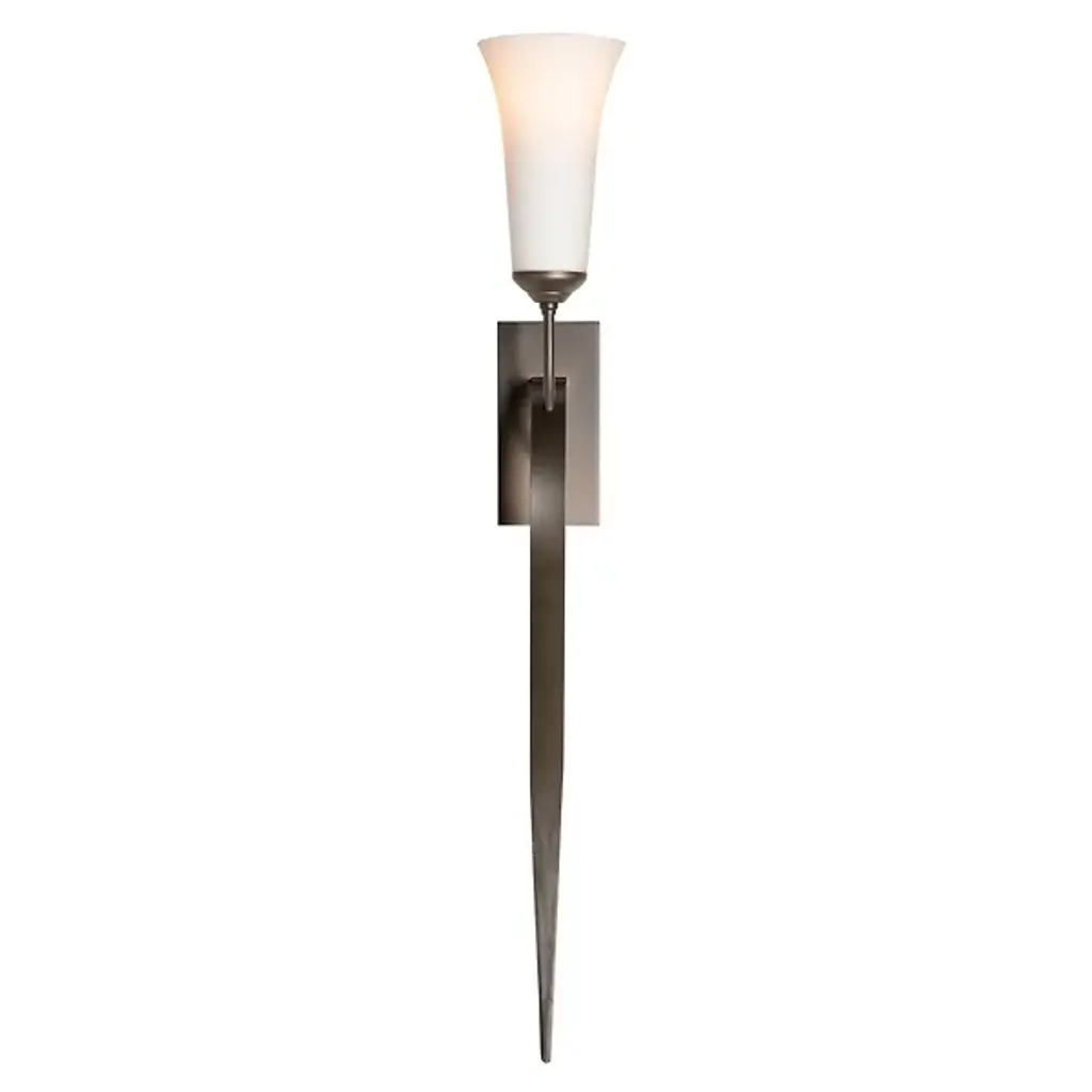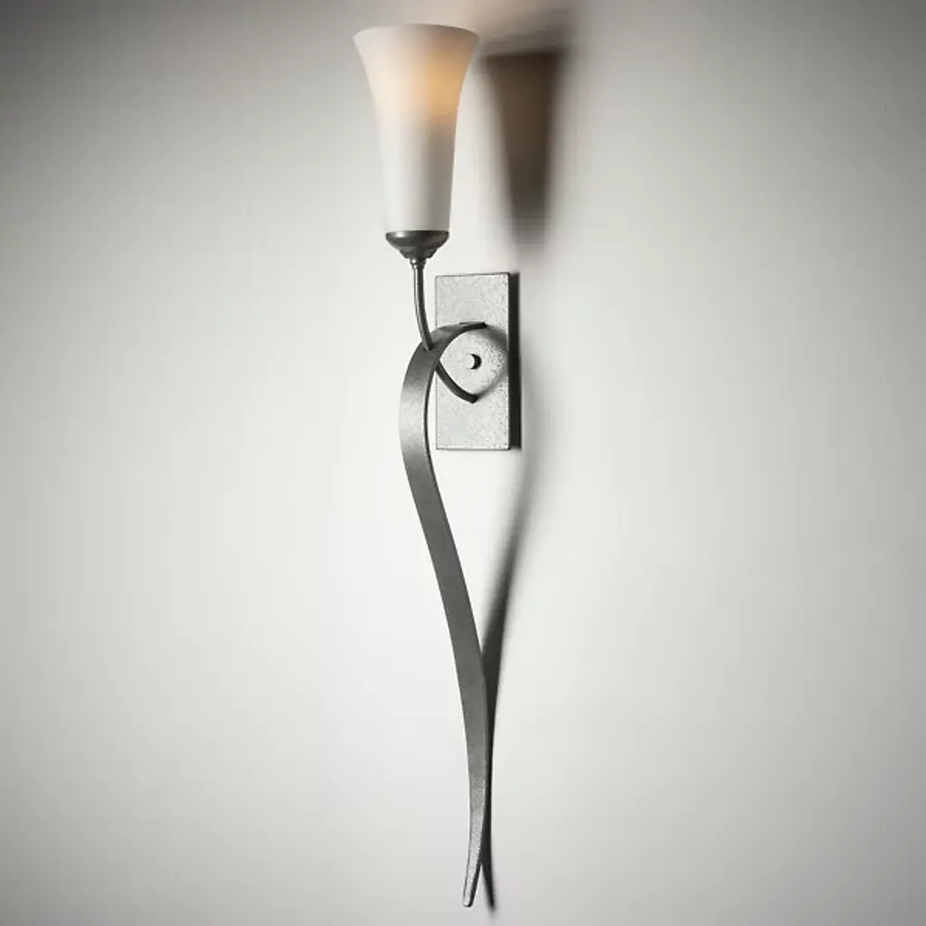 The Hubbardton Forge Sweeping Taper Wall Sconce With Glass provides bright up-lighting in a dramatic design that celebrates the beauty of simple lines and expert craftsmanship. The lighting fixture features hand-forged wrought iron for durability while a slim, looped arm holds up a bell-shaped glass diffuser that works with the internal incandescent lamping. The lamping and glass work in tandem to produce a warm, comforting aura of light that easily encompasses the immediate installation space. Can be used in areas like living rooms, hallways, and bedrooms.
