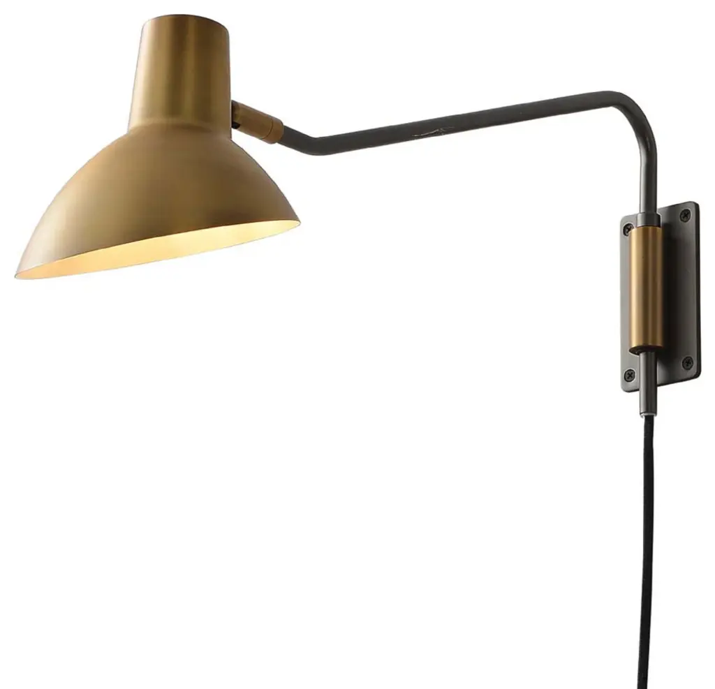 Blending together crisp lines and an adjustable swing arm, this 1-light wall sconce brightens up your space with a low-impact footprint. Crafted from metal, it features a slim rectangular backplate that holds the gently curving, angled arm. The angular dome shade features an oval silhouette that helps catch and direct the light of the 25W bulb (sold separately) down, making this lamp a great option for reading or task light. And since it plugs into the wall, this fixture is ideal for low-impact installation.