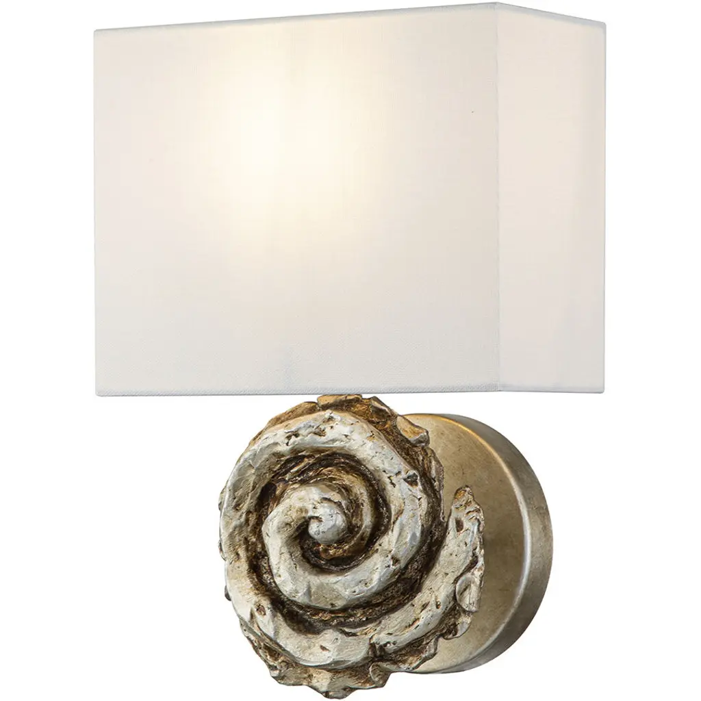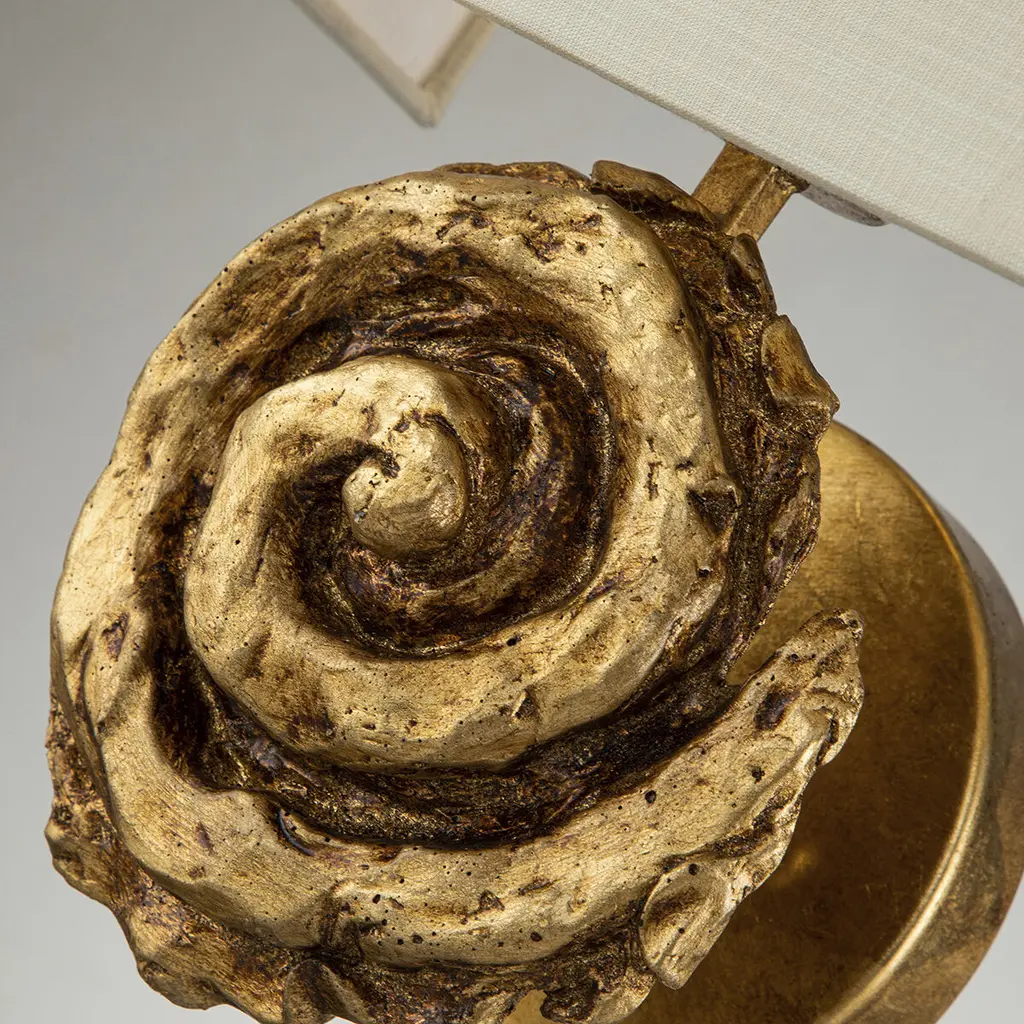 Swirl 1 Light Sconce in Gold Leaf. Unique sculpture of cornice like element is topped by a squared off linen shade. The sconce is ADA compliant as it only comes 4" off the wall.