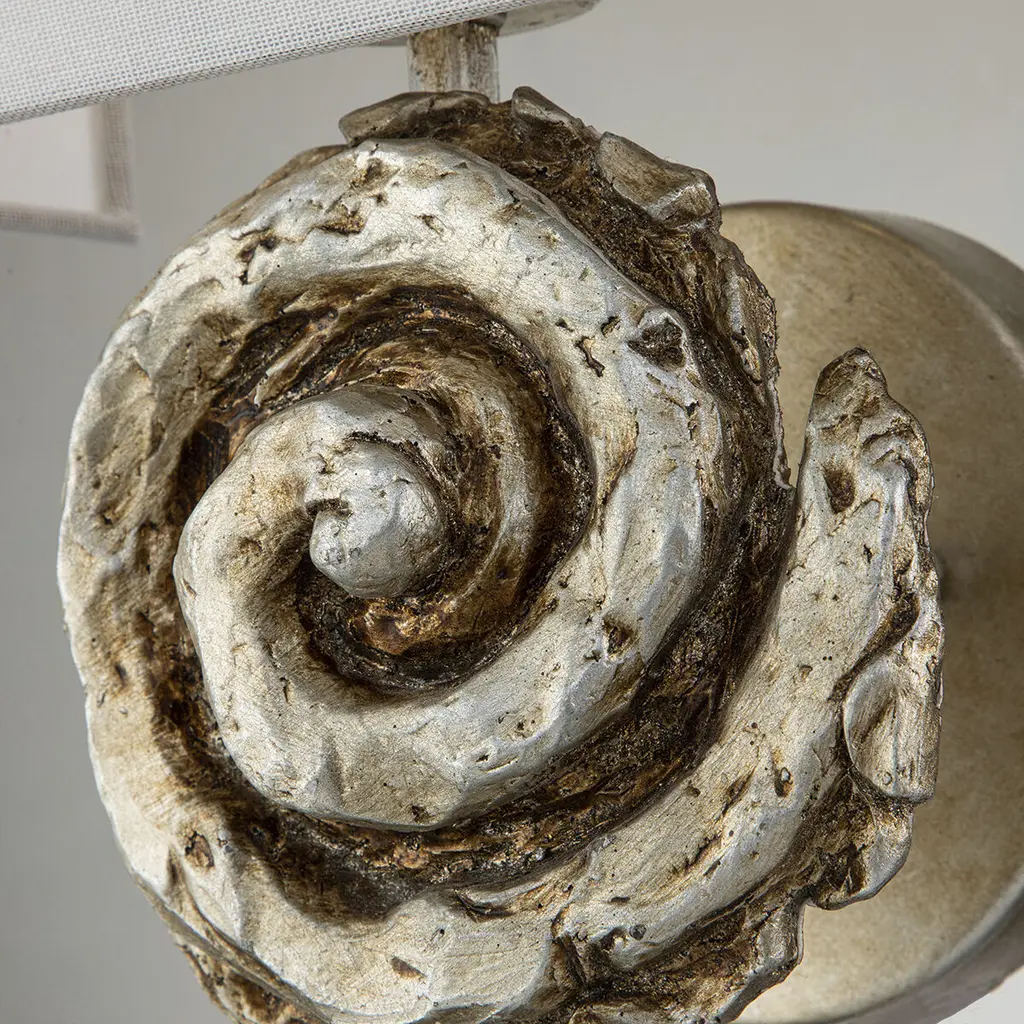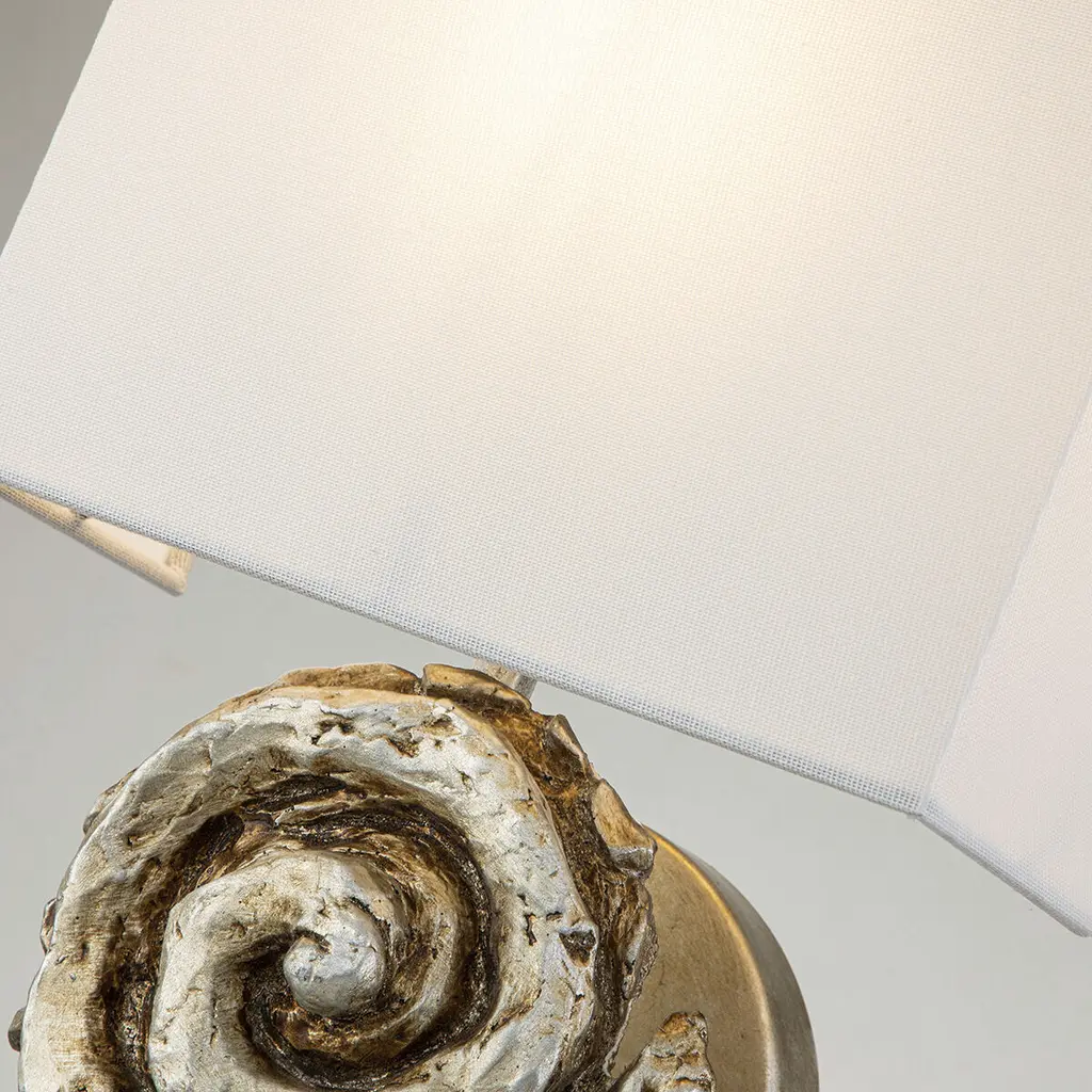 swirl 1 Light Sconce in Silver Leaf. Unique sculpture of cornice like element is topped by a squared off linen shade. The sconce is ADA compliant as it only comes 4" off the wall.