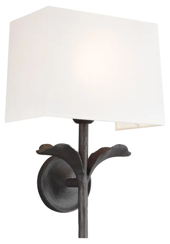 swirl 1 Light Sconce in Silver Leaf. Unique sculpture of cornice like element is topped by a squared off linen shade. The sconce is ADA compliant as it only comes 4" off the wall.