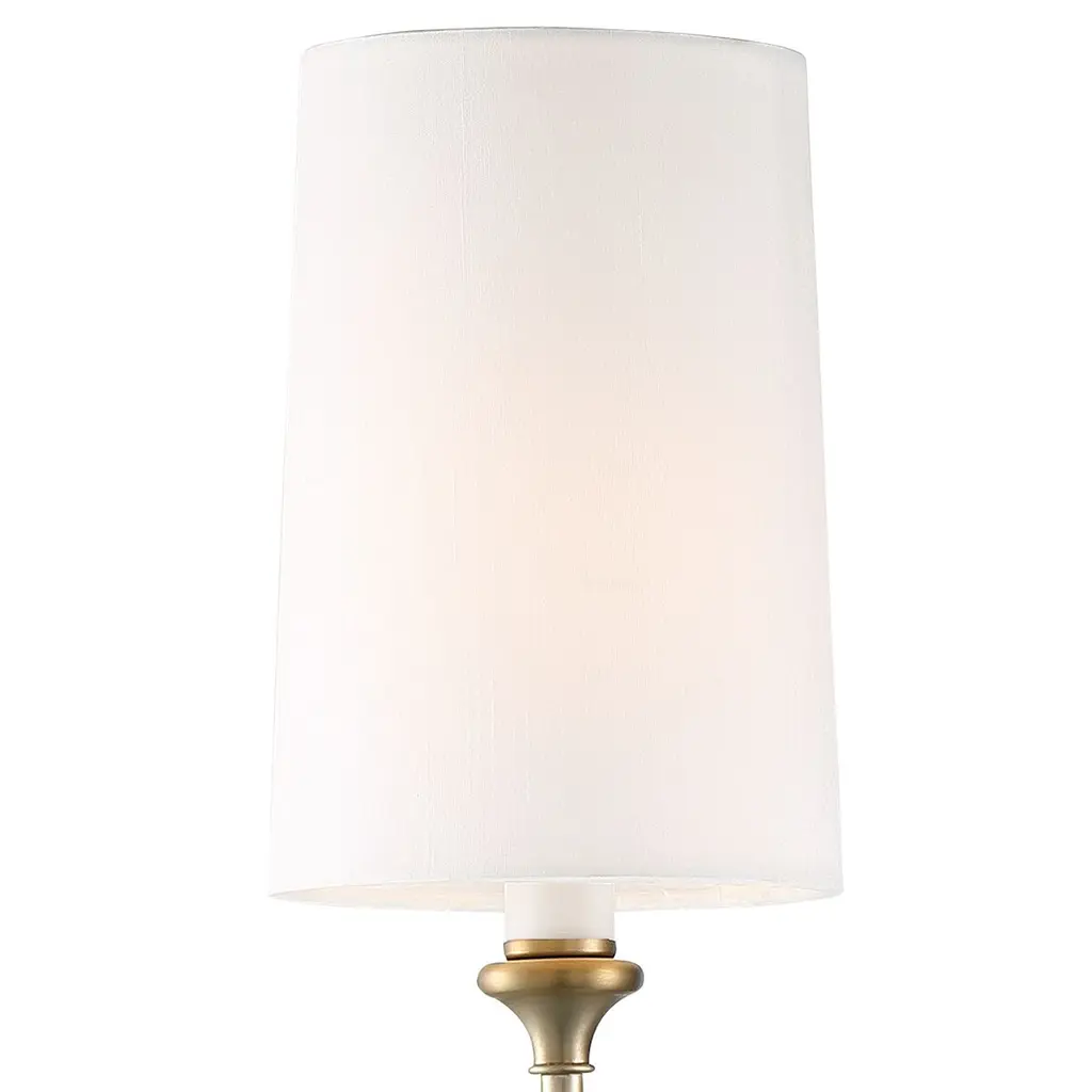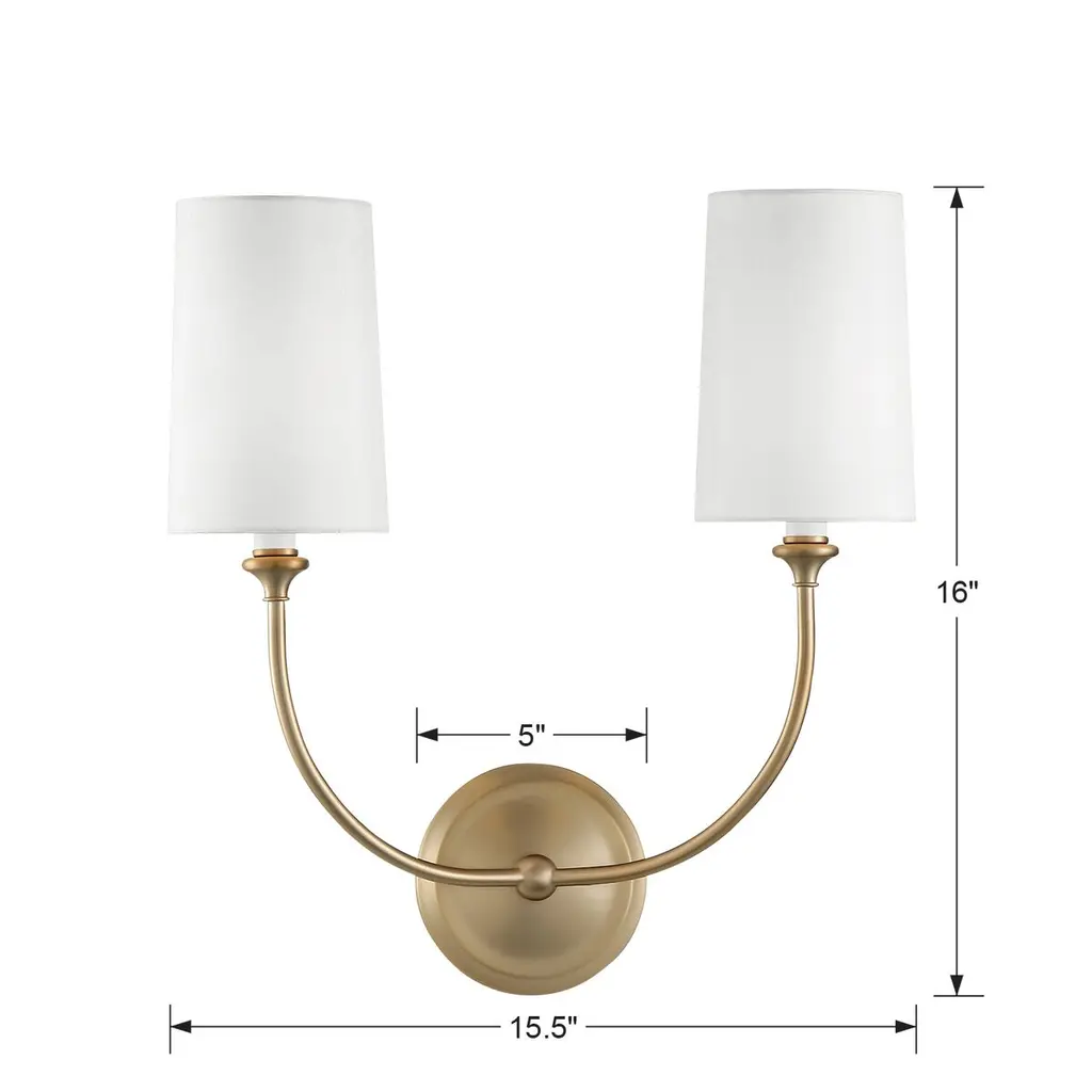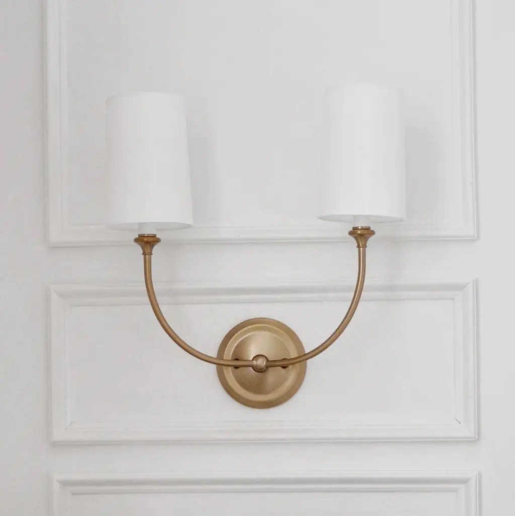 This elegantly proportioned two-arm sconce pairs a soft gold finish with white silk shades.