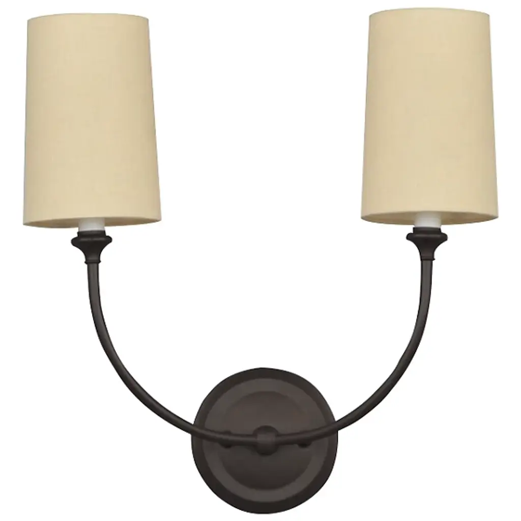 The Crystorama Sylvan 2 Light Wall Sconce from designer Libby Langdon features a single arcing rod that hosts two shades with their own light source. Projecting from a circular wall plate, the minimalist approach to the traditional wall sconce puts this piece in a whole new context. High style design is put into a more contemporary light, made with premium materials and manufacturing techniques.