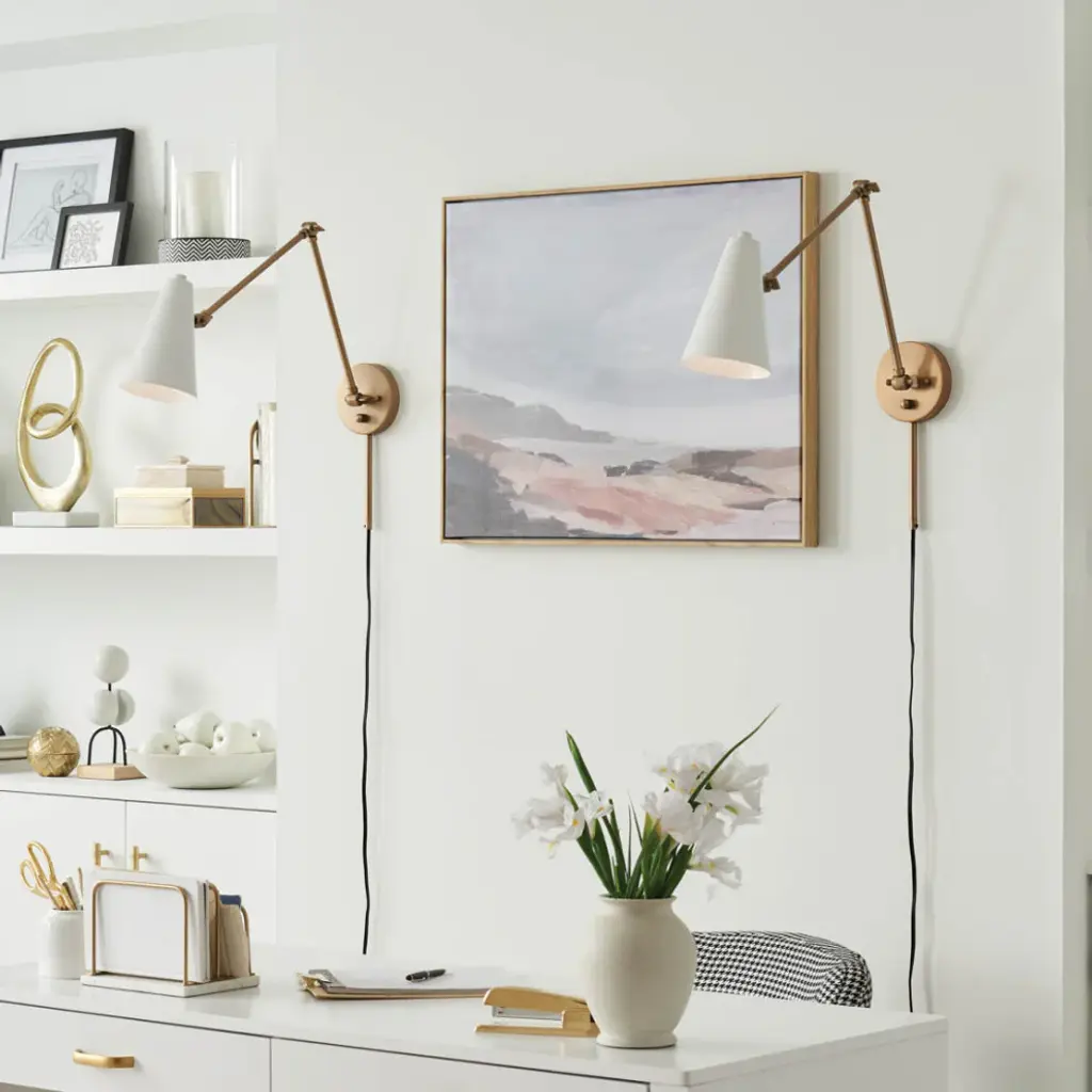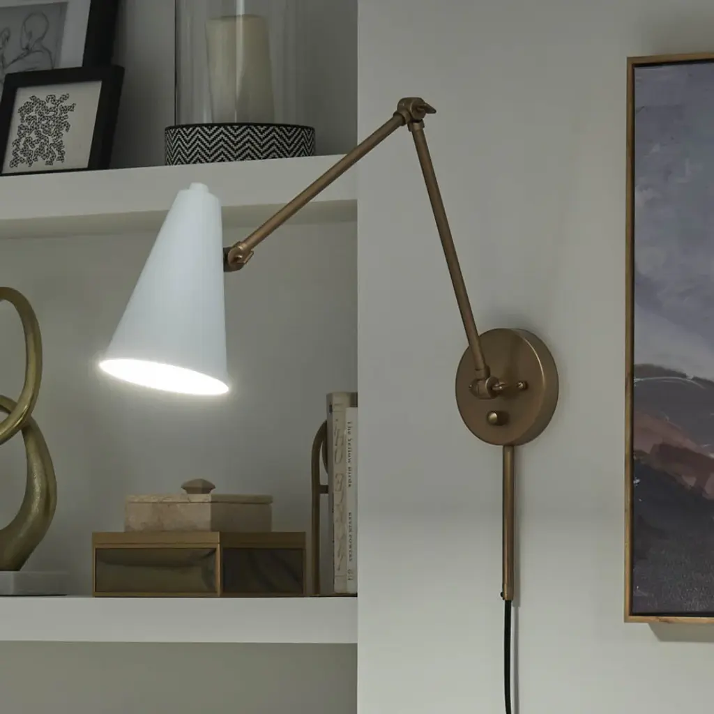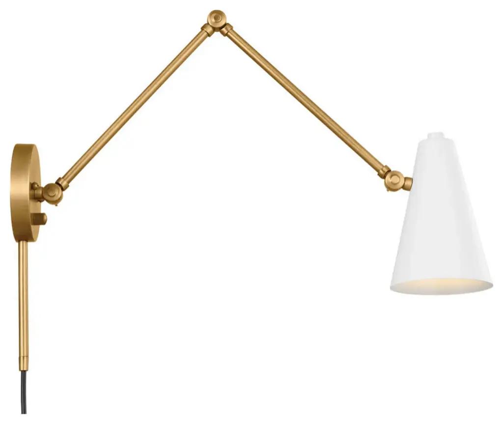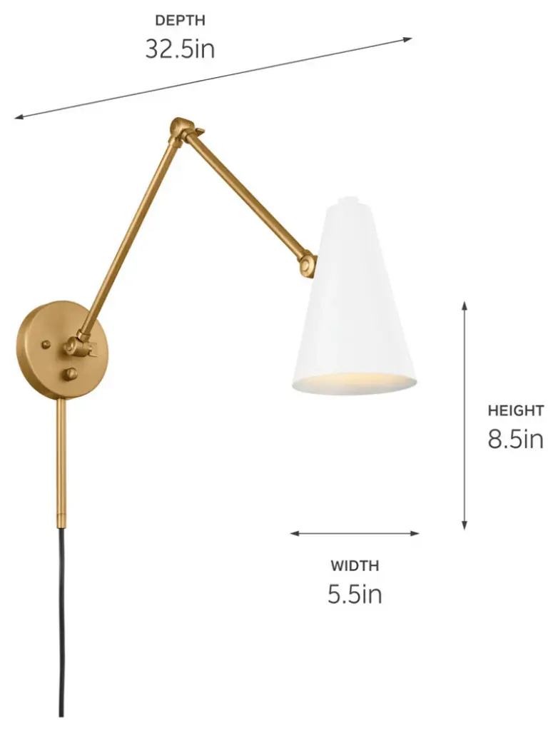 The Sylvia 1 light wall sconce makes a big impression in a soft voice. The shade is Black on the outside and White on the inside. It has an on/off switch and can swivel to direct light where you want. Straight arms extend in a Natural Brass finish, giving the entire fixture a luxurious feel. Sylvia is safety rated cETLus dry for indoor, dry spaces. To clean, simply wipe with a damp cloth.BulbType: E26 (Medium)NumberofBulbs: 1MaxWattage: 25.0 WBulbsIncluded?YorN: No