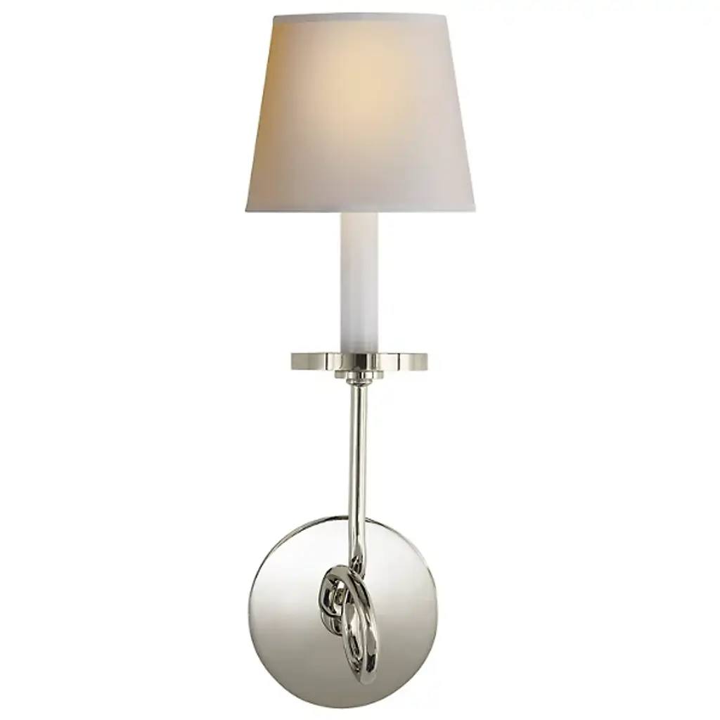 The Symmetric Twist Wall Sconce by Visual Comfort Signature, formerly known as Visual Comfort, mixes fanciful and function. With a playful curlicue and metallic finish, this sconce is mild-mannered with a touch of whimsy. Its Natural Paper shade evenly diffuses light to fill the space with a warm glow. The Symmetric Twist Single Wall Sconce's whimsical winding base is a delicate delight that suits any room.