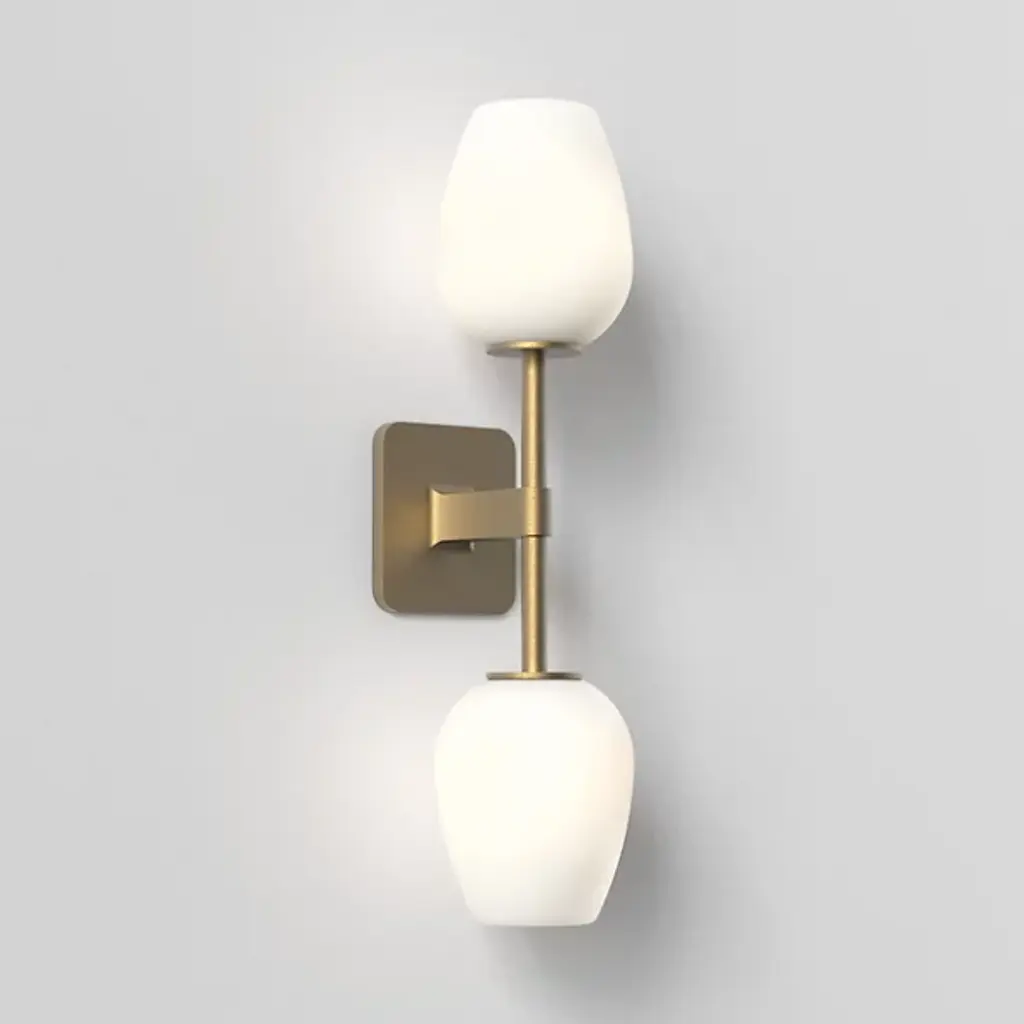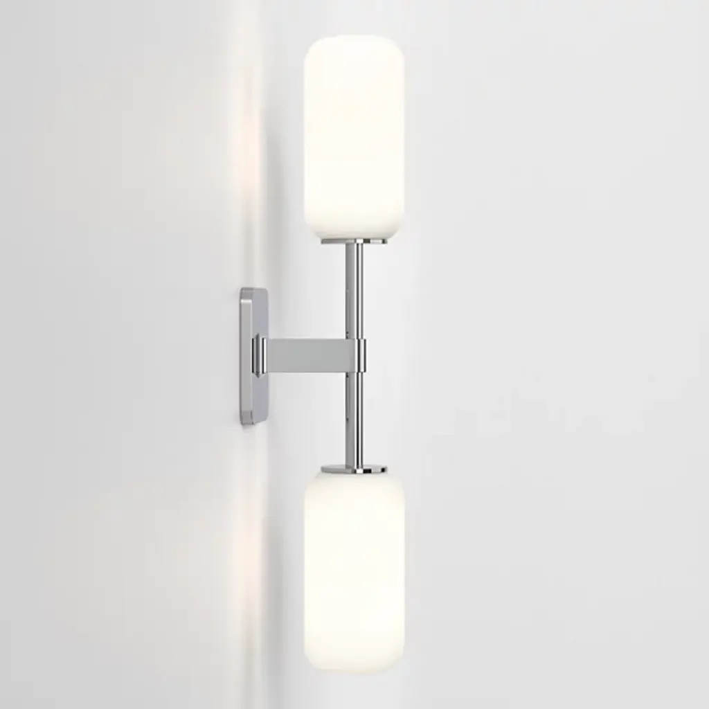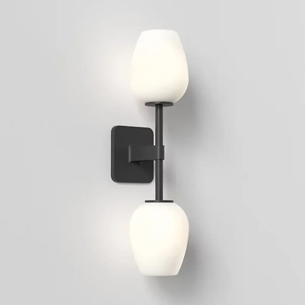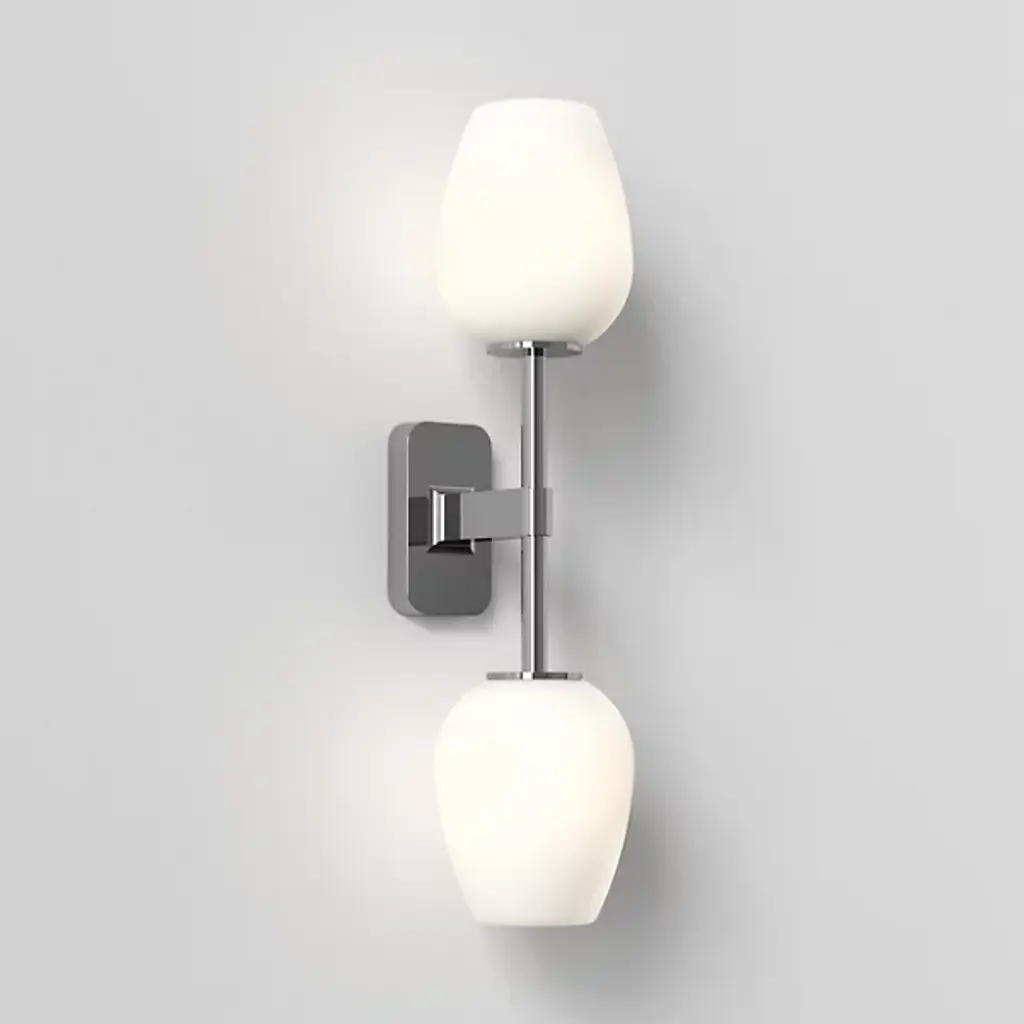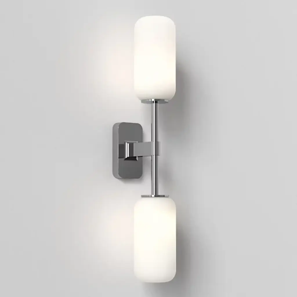 The Tacoma Twin Wall Sconce from Astro Lighting features a clean, symmetrical design that is rich in practical appeal. A beveled backplate anchors a slim stem, supporting translucent glass shades at each end that emit a warm, diffused light. Built with durable materials and damp-listed for use in moisture-prone areas, its balanced form and subtle glow make it a memorable addition to interiors, whether used alone above a mirror or in a matching set flanking it.