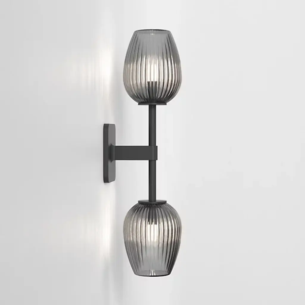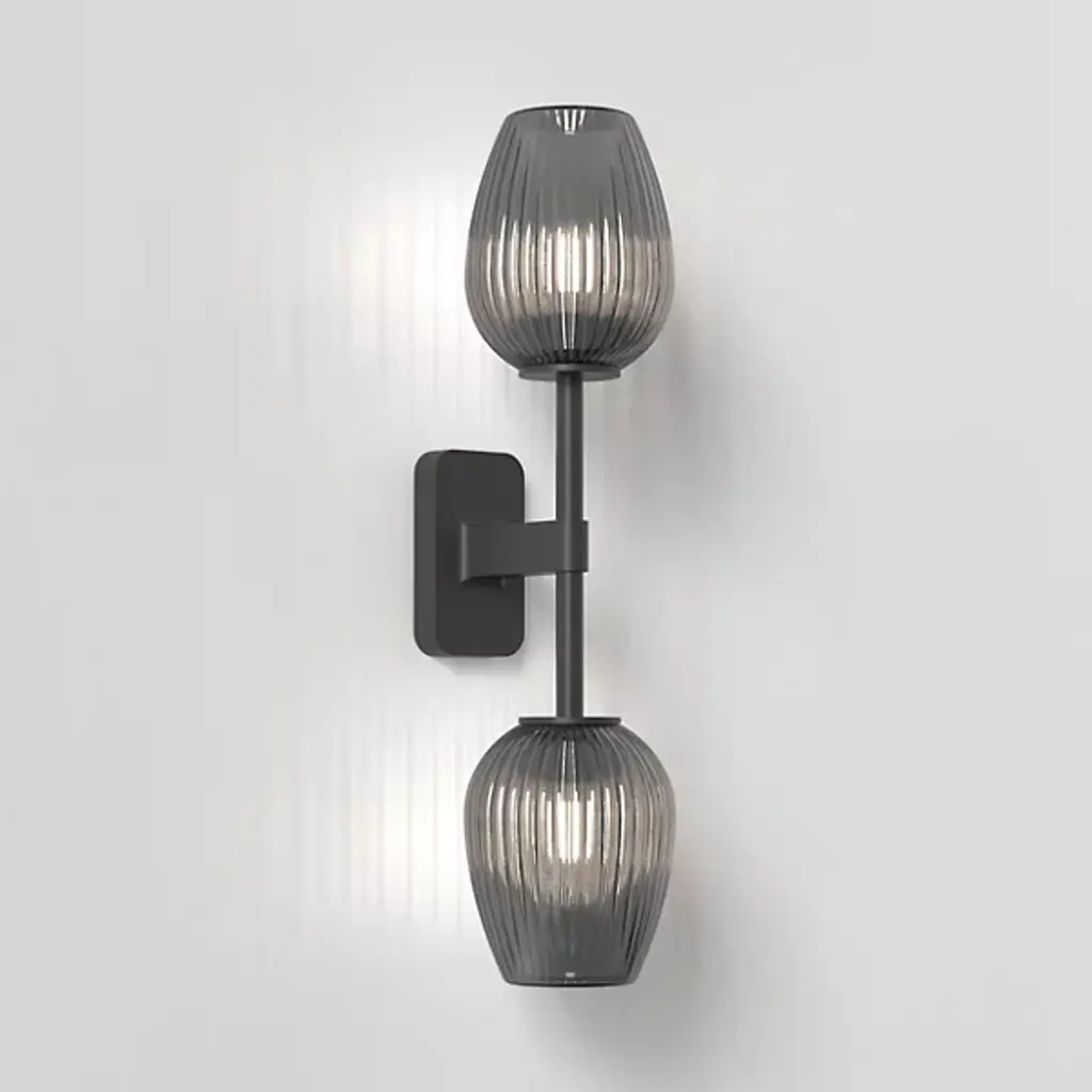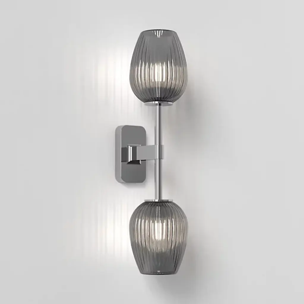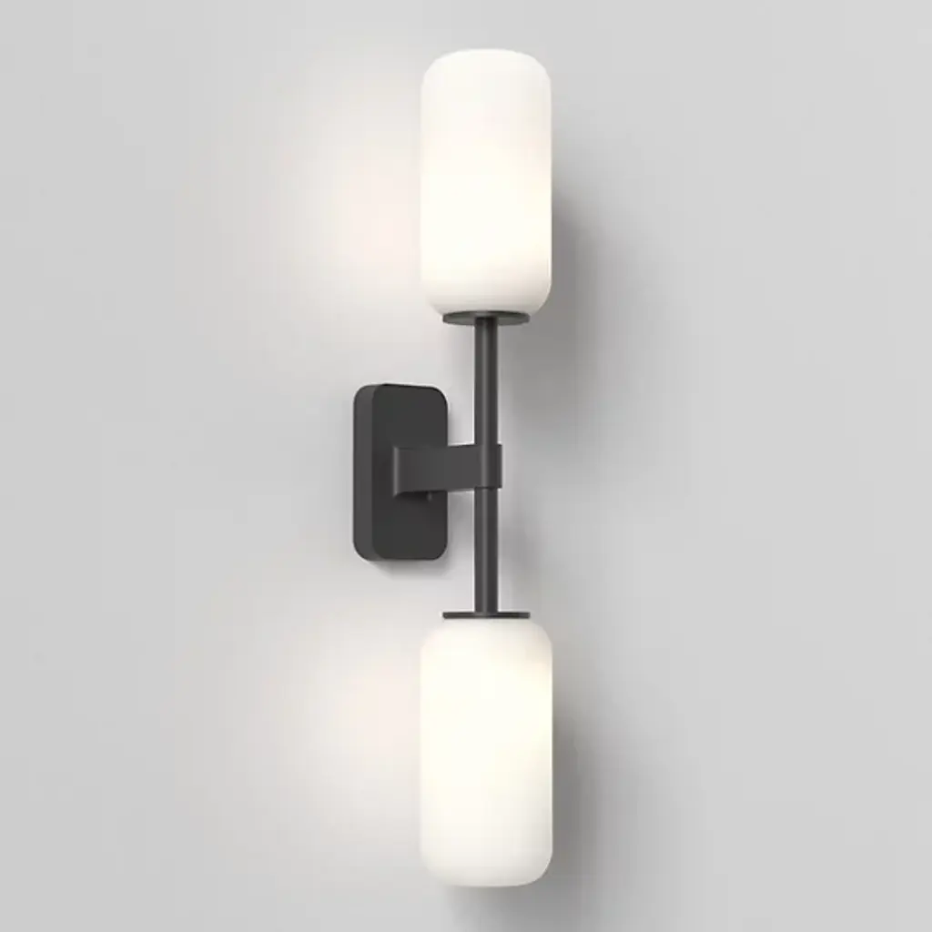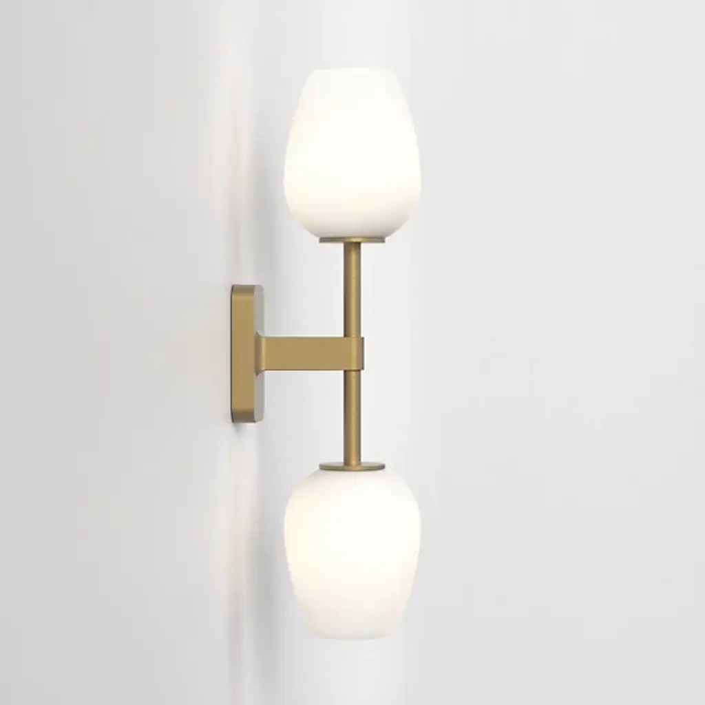 The Tacoma Twin Wall Sconce from Astro Lighting features a clean, symmetrical design that is rich in practical appeal. A beveled backplate anchors a slim stem, supporting translucent glass shades at each end that emit a warm, diffused light. Built with durable materials and damp-listed for use in moisture-prone areas, its balanced form and subtle glow make it a memorable addition to interiors, whether used alone above a mirror or in a matching set flanking it.