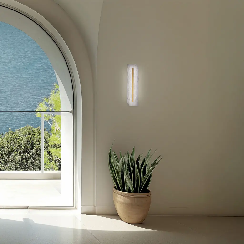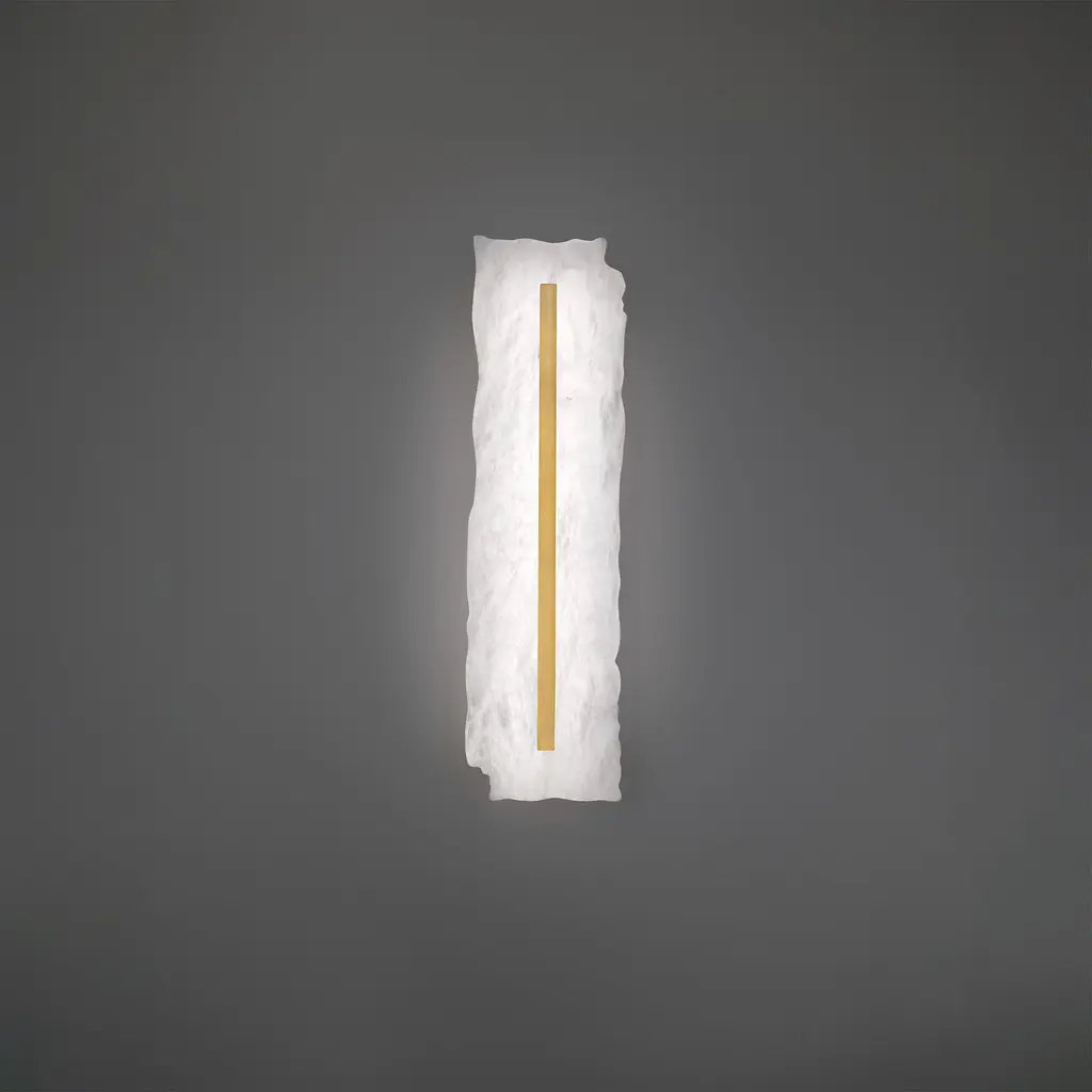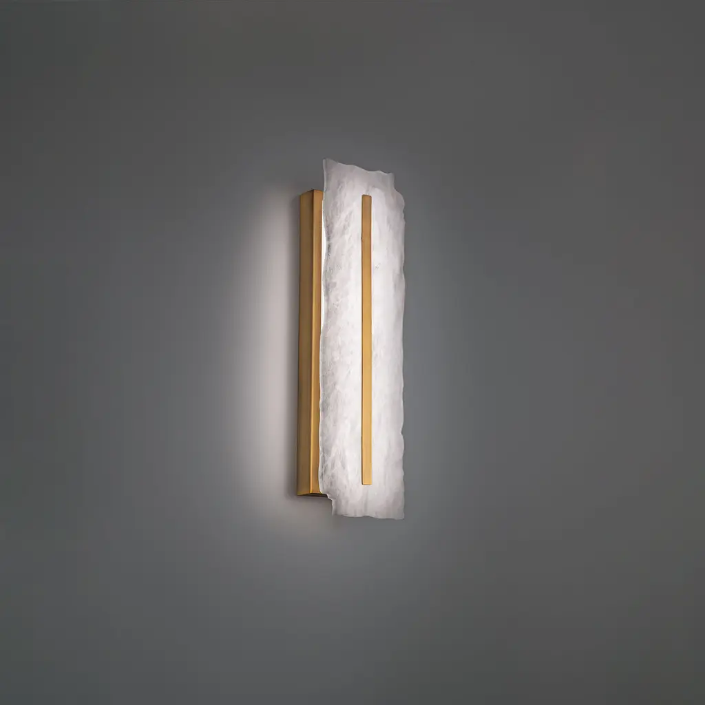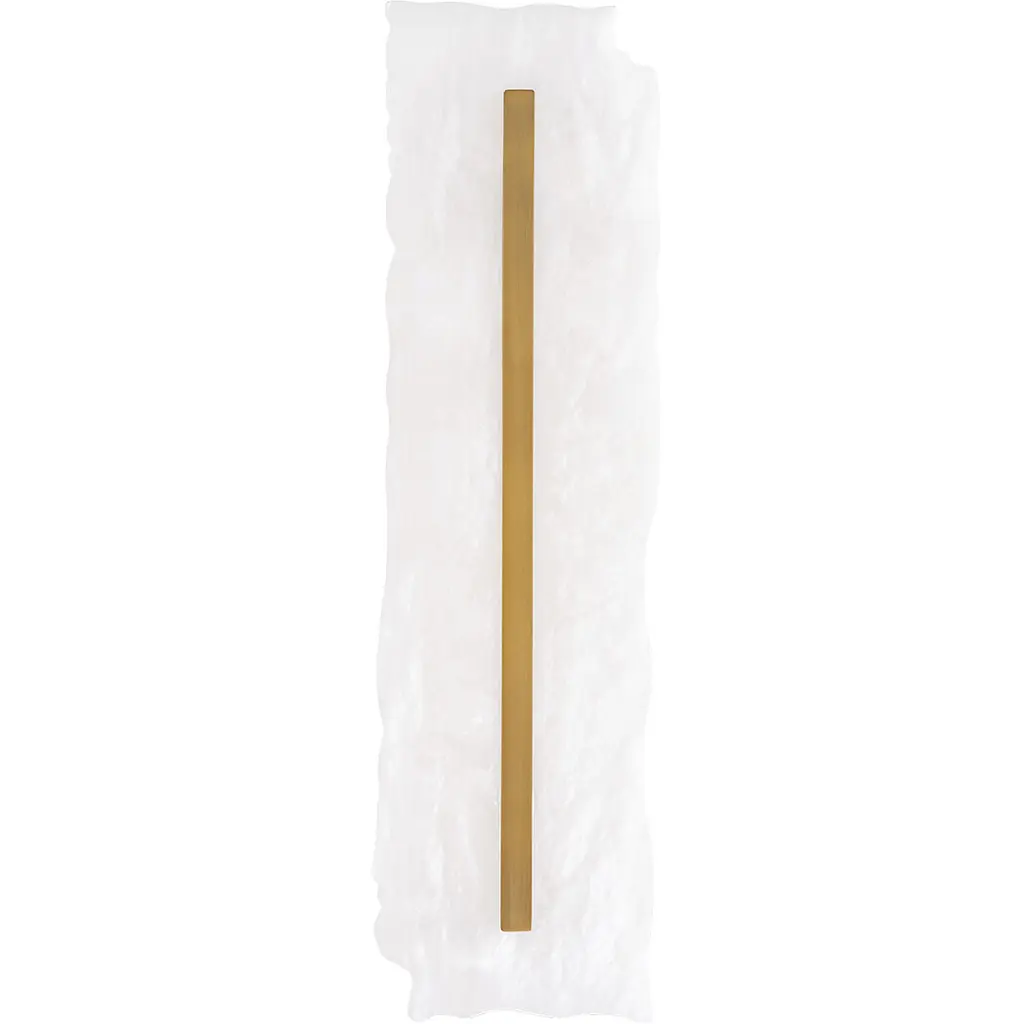 Ruffled transparent live-edge quartz adds multi-faceted elegance to the Taffeta wall sconce. A meticulously crafted quartz panel is secured by a sleek bar, allowing diffused 3000K LED light to filter through the translucent stone, creating a warm and inviting ambiance. This 18-inch luminaire is available in a choice of aged brass or antique nickel finishes and can be mounted horizontally or vertically to suit your space.