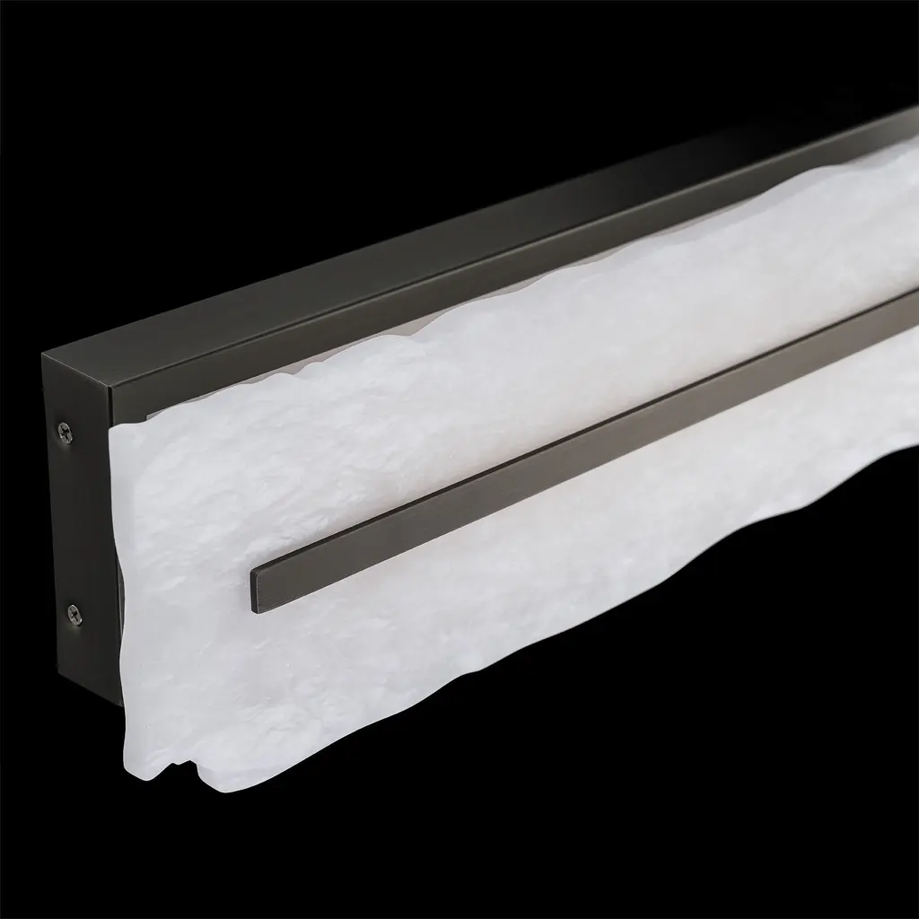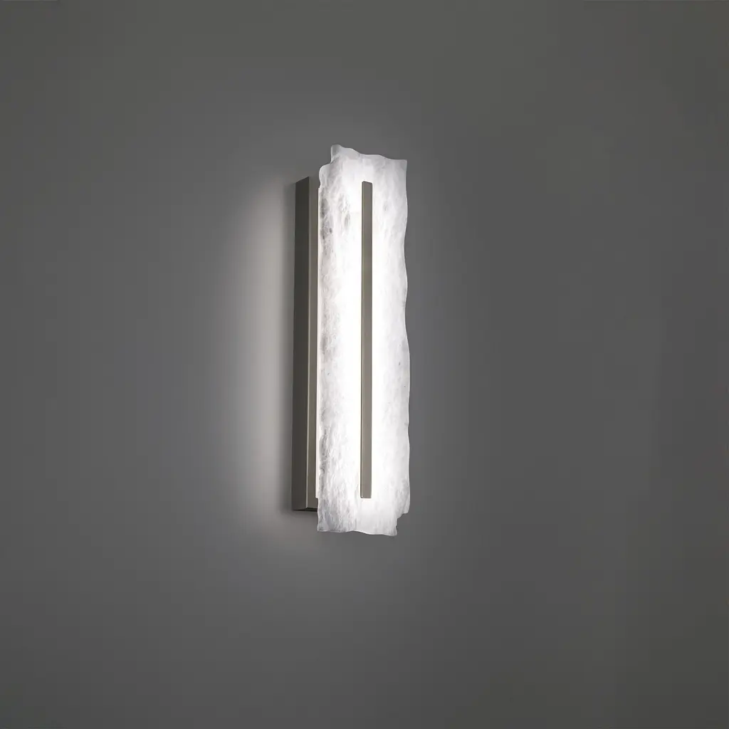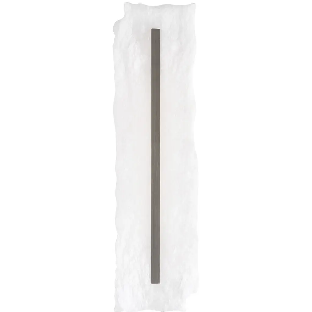 Ruffled transparent live-edge quartz adds multi-faceted elegance to the Taffeta wall sconce. A meticulously crafted quartz panel is secured by a sleek bar, allowing diffused 3000K LED light to filter through the translucent stone, creating a warm and inviting ambiance. This 18-inch luminaire is available in a choice of aged brass or antique nickel finishes and can be mounted horizontally or vertically to suit your space.
