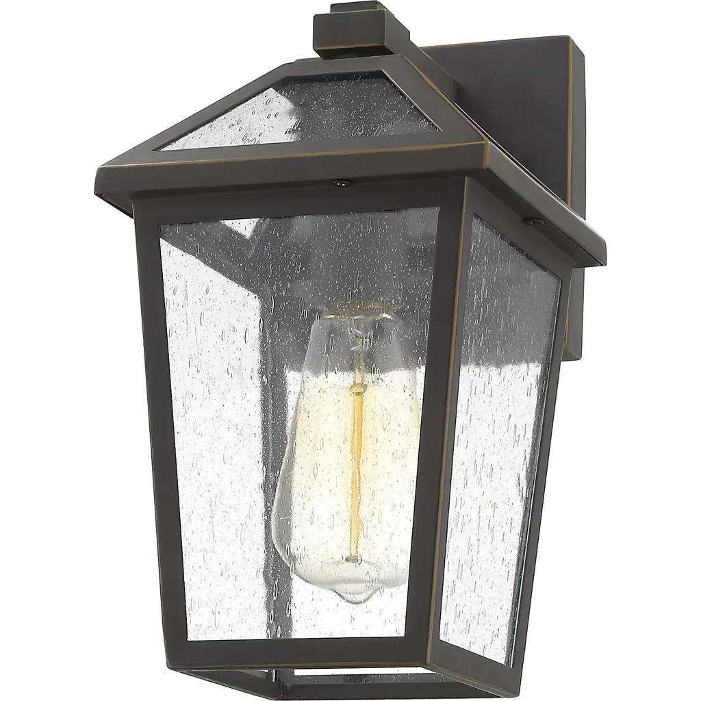 Add ambient lighting to an exterior front or back yard space with a classic fixture reflecting a charming village theme. Made from Rubbed Bronze metal and seedy glass panels, this single-light outdoor wall sconce delivers a stylish upgrade to complete a design-forward look on a structure or fence.