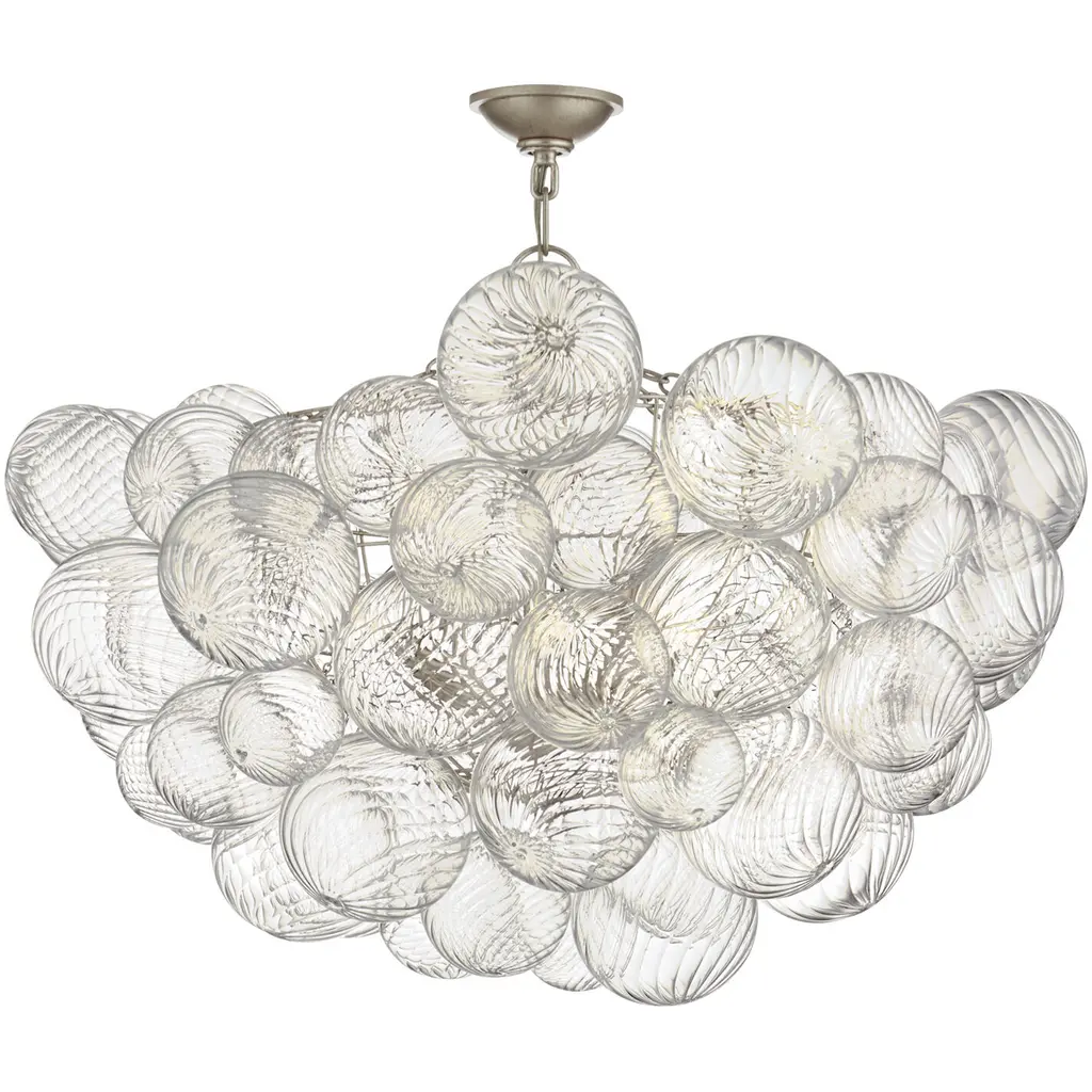 Artisanal glass elevates the Talia series by Julie Neill for a new take on the simple glass globe light fixture. Light shimmers through multiple swirled glass orbs attached to metal baskets, creating a whimsical flourish. Available in a range of sizes and configurations, the Talia series adds a dynamic mix of sparkling glass, rounded forms, and bright metals to any interior. Choose a chandelier for entryways and dining areas, flush-mounts or wall sconces for living spaces or bedrooms, and add a playful, feminine touch to any space.