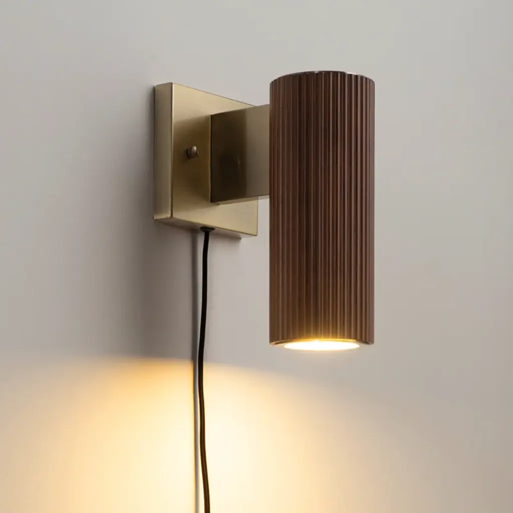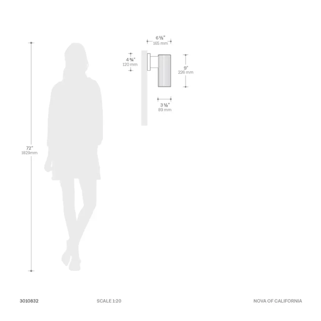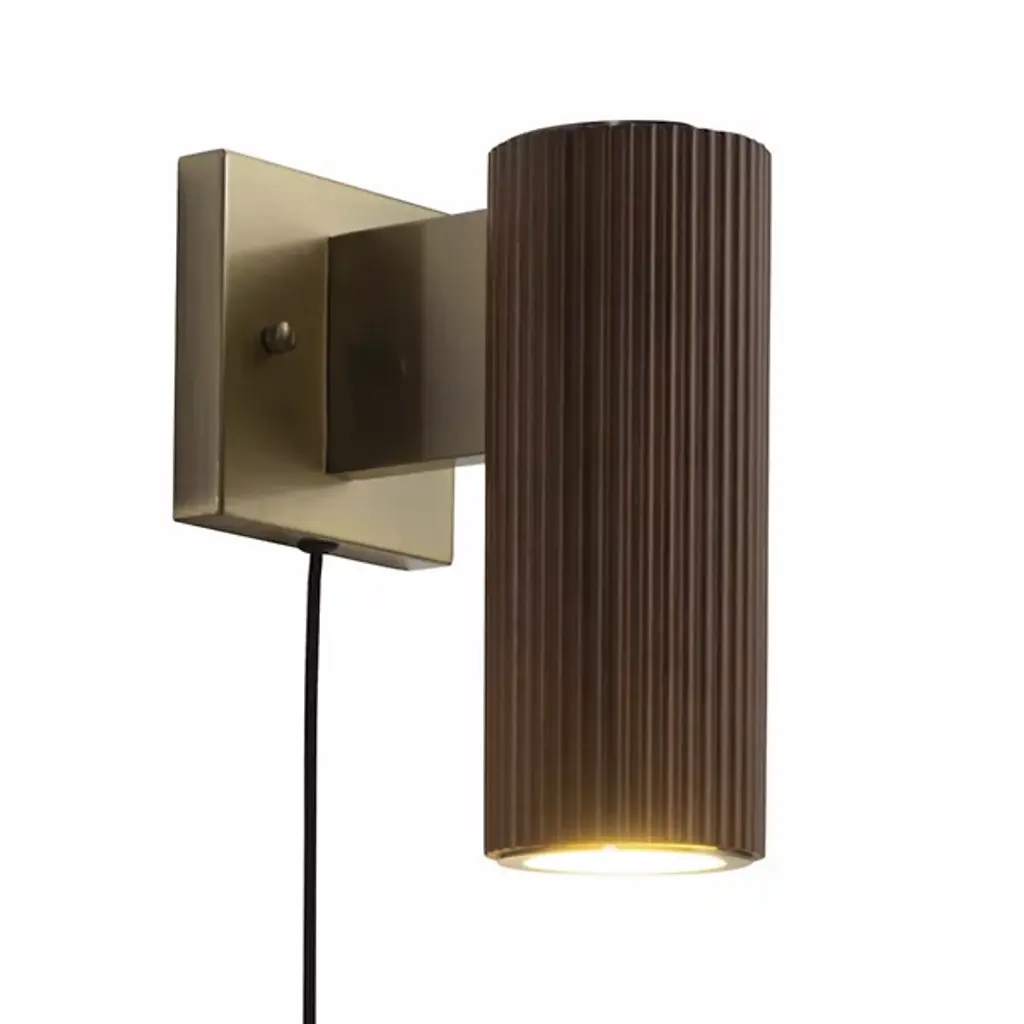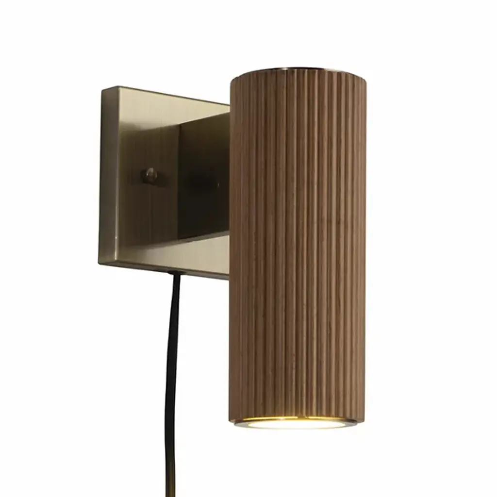 Elevate your space with the Tambo wall sconce from Nova of California. The hand-laid dark Walnut wood tambour surround, paired with weathered brass accents, exudes modern elegance. The acrylic diffuser adds a soft glow, enhancing the enduring beauty of this contract-grade sconce.