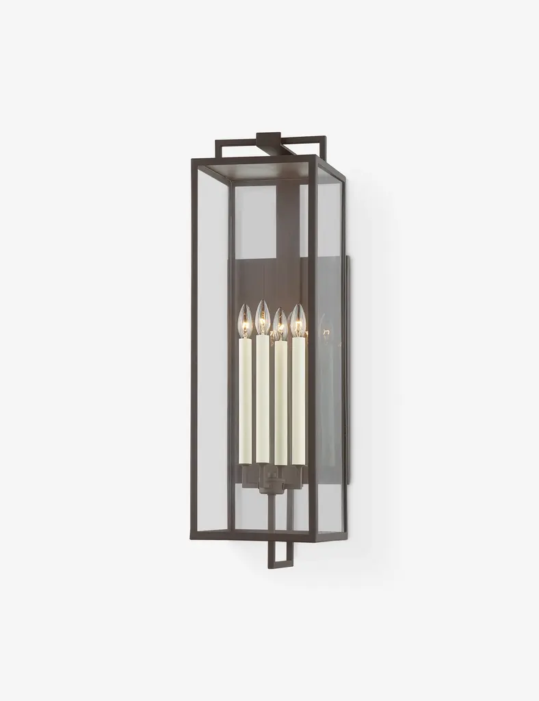 The Tanzy Medium Outdoor Wall Sconce in our Twelfth Street collection of outdoor lighting features a high-performance, weather-resistant Trilux finish that is fade resistant, crack resistant, and rust resistant. The metal surrounds seeded-glass panes, and it is certified for outdoor and damp locations.