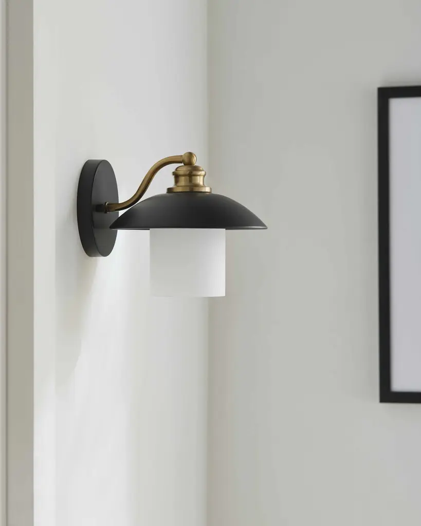 Collection: Tartanedo Colors: Black, Metallic - Brass, White Material: Fixture: Iron, Iron / Shade (Outside): Glass / Shade (Inside): Glass Styles: Traditional Made In: China Lighting Type: Wall Sconce Shade Material: Glass Shade Color: White Number of Bulbs: 1 Socket Type: E-26 Bulb Wattage: 60W