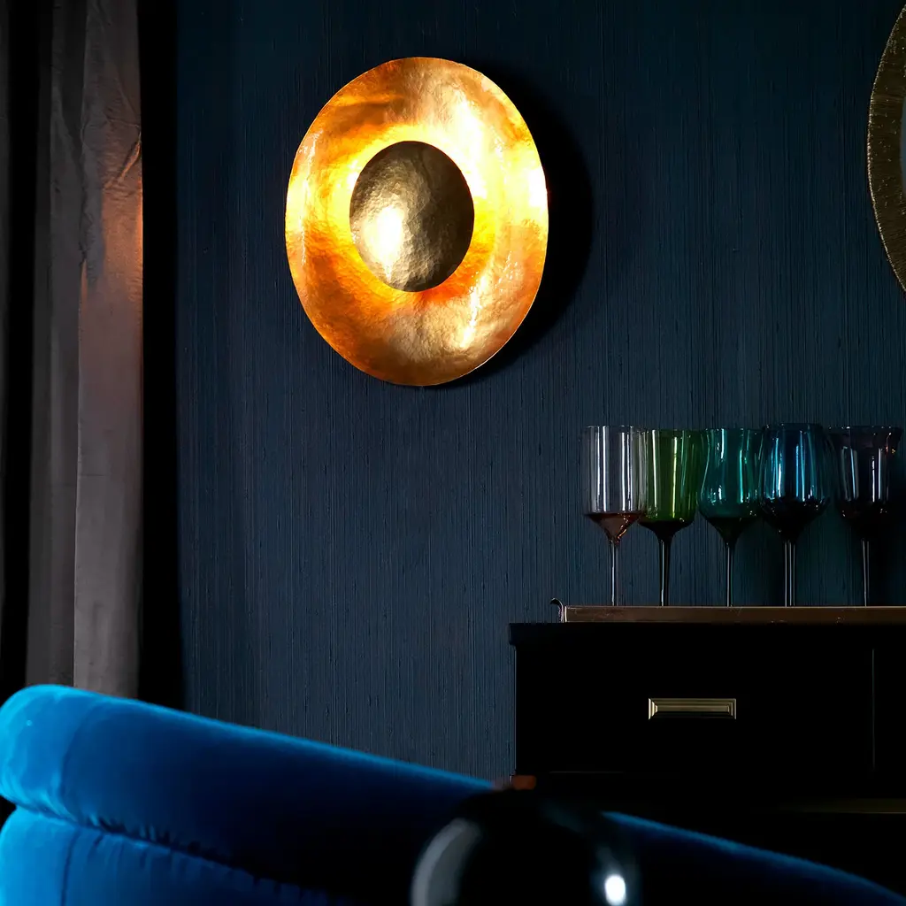 Named after its shape that evokes the silhouette of a turtle, this elegant sconce will be a superb wall decoration, while also providing extra light to an entryway, powder room, or bedroom. Its structure is in brass with a natural finish and features a larger oval base containing a smaller one, both splendidly adorned with a hammered surface that adds one-of-a-kind reflections to its surroundings.