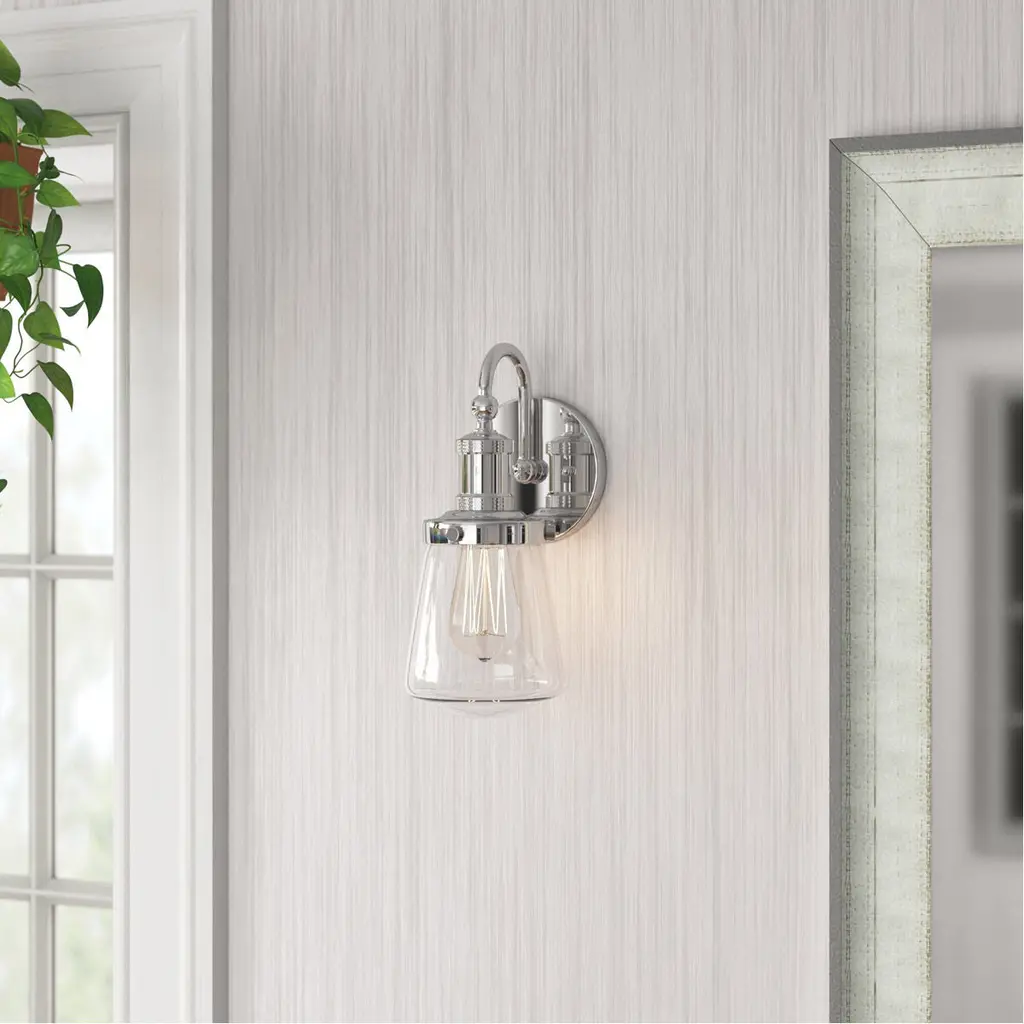 Taylor bath vanities offers clear glass shades for a clean, fresh look that has taken hold in today's home interior light fixtures. The protective chrome finish adds sophistication to this light fixture and allows the filament style light bulb to play a part in the design. These light fixtures come with everything you need for easy installation with the shades in the up or down position. Made from durable steel for long-lasting style in your home.