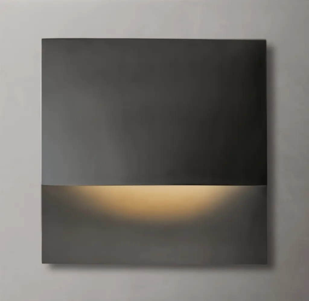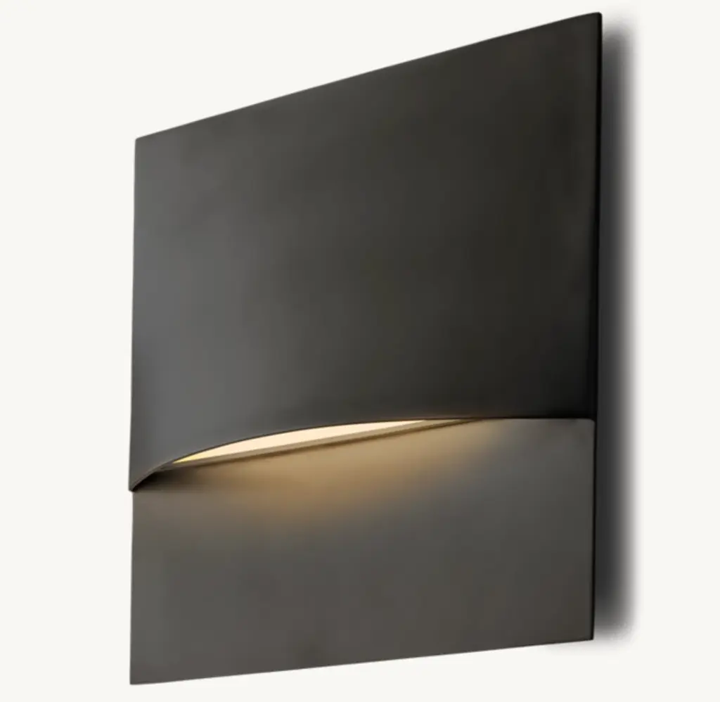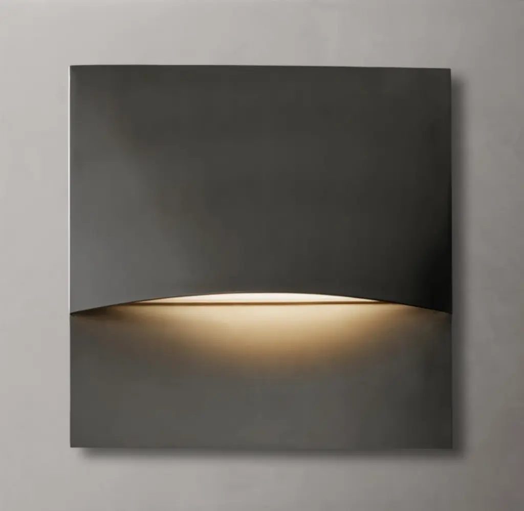 Casting a warm, linear downlight, Taza's crisp geometric form merges with a gently arched contour for a subtle floating effect. Designer Ian Fowler offers a range of striking postmodern silhouettes in this radiant collection, handcrafted by artisans of solid brass and lightly textured to enhance the metal's tonal beauty.