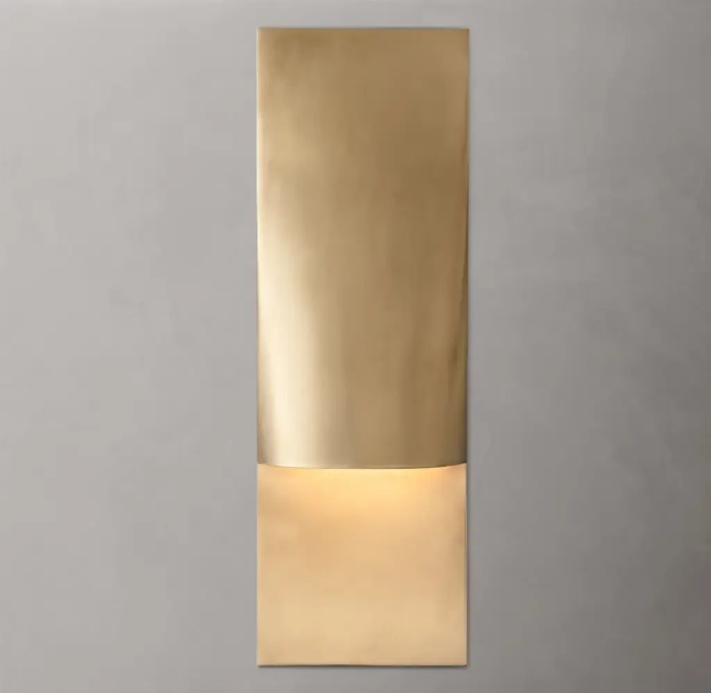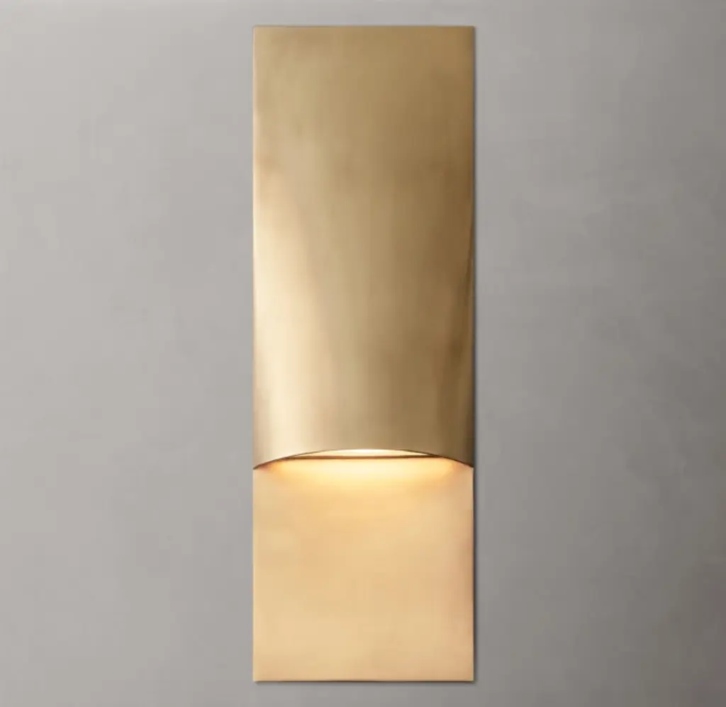 Casting a warm, linear downlight, Taza's crisp geometric form merges with a gently arched contour for a subtle floating effect. Designer Ian Fowler offers a range of striking postmodern silhouettes in this radiant collection, handcrafted by artisans of solid brass and lightly textured to enhance the metal's tonal beauty.