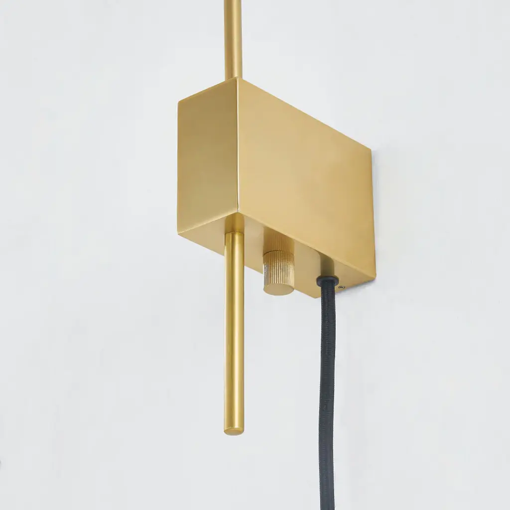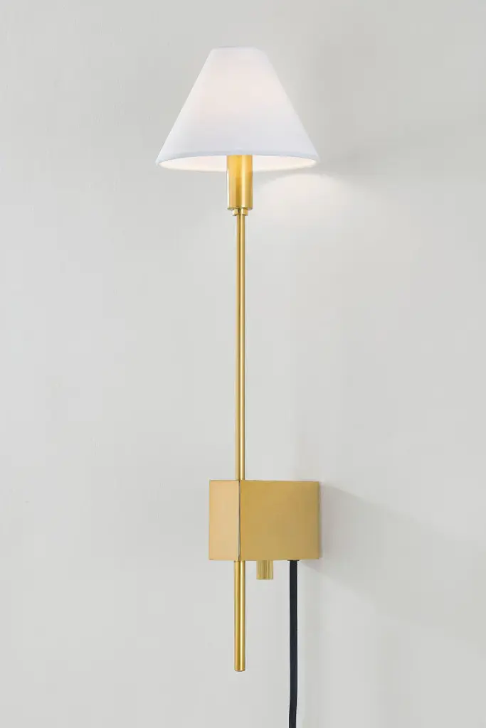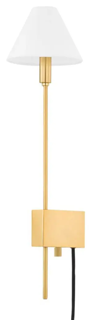 Full of character, this plug-in sconce cleverly plays with proportions. A notably elongated, slender arm in Aged Brass supports a petite tapered white linen shade, exploring linear elegance while maintaining a classic silhouette. Enhancing its functionality, the backplate features a full-range dimmer, allowing for complete customization.Features• Overall product dimensions are 6.25" W x 6.25" D x 24" H• Compatible with E12 candelabra base for quick and easy installation• Durable steel construction for long-lasting quality and use• ETL Damp rated for your safety and convenience in humid spaces• ON/OFF switch for easy accessibility and convenient control of lighting directly from fixture• 1-year limited manufacturer warranty for added assurance and peace of mindDimensions:Wall Sconce• Assembled Product: 6.25 inches wide x 6.25 inches deep x 24 inches high• Shade Height: 4.25 inchesRequirements• Maximum Voltage: 120 volts