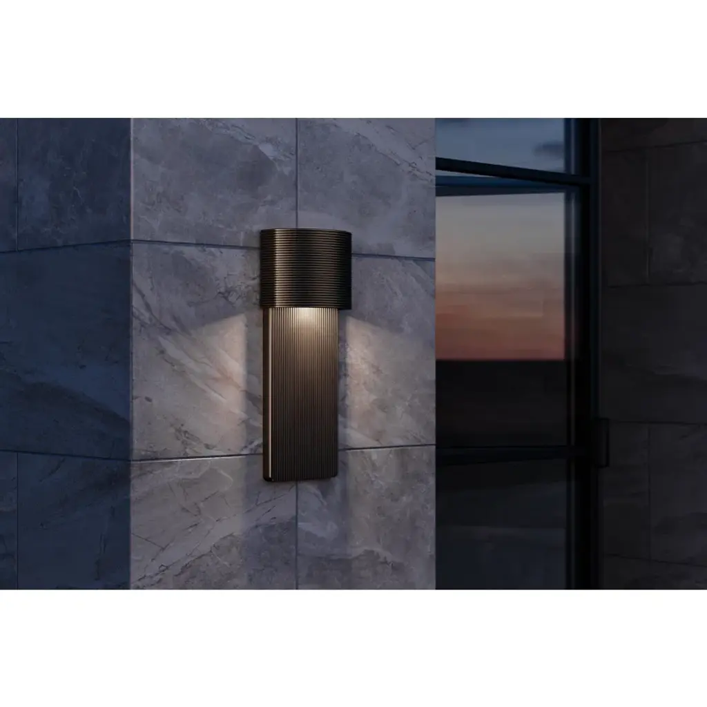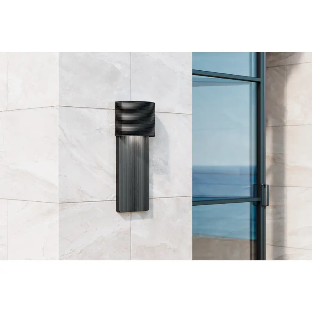 Strikingly modern, is sure to make a statement on any exterior. Crafted from aluminum and finished in soft black or graphite, 's rigid frame is given movement through horizontal and vertical ribbing. The textured surface allows light to be cast indirectly, creating a soft glow against the surface. Available in two sizes. Wet-rated and dark sky compliant.