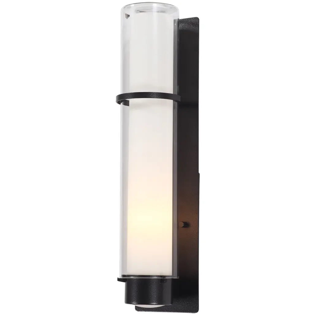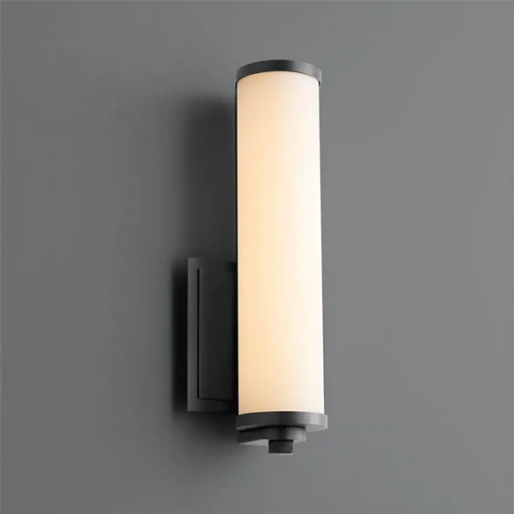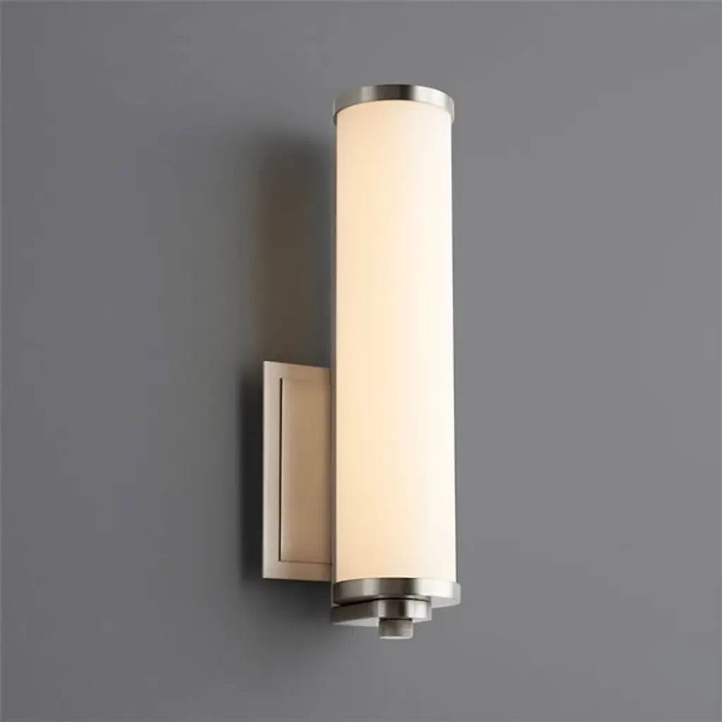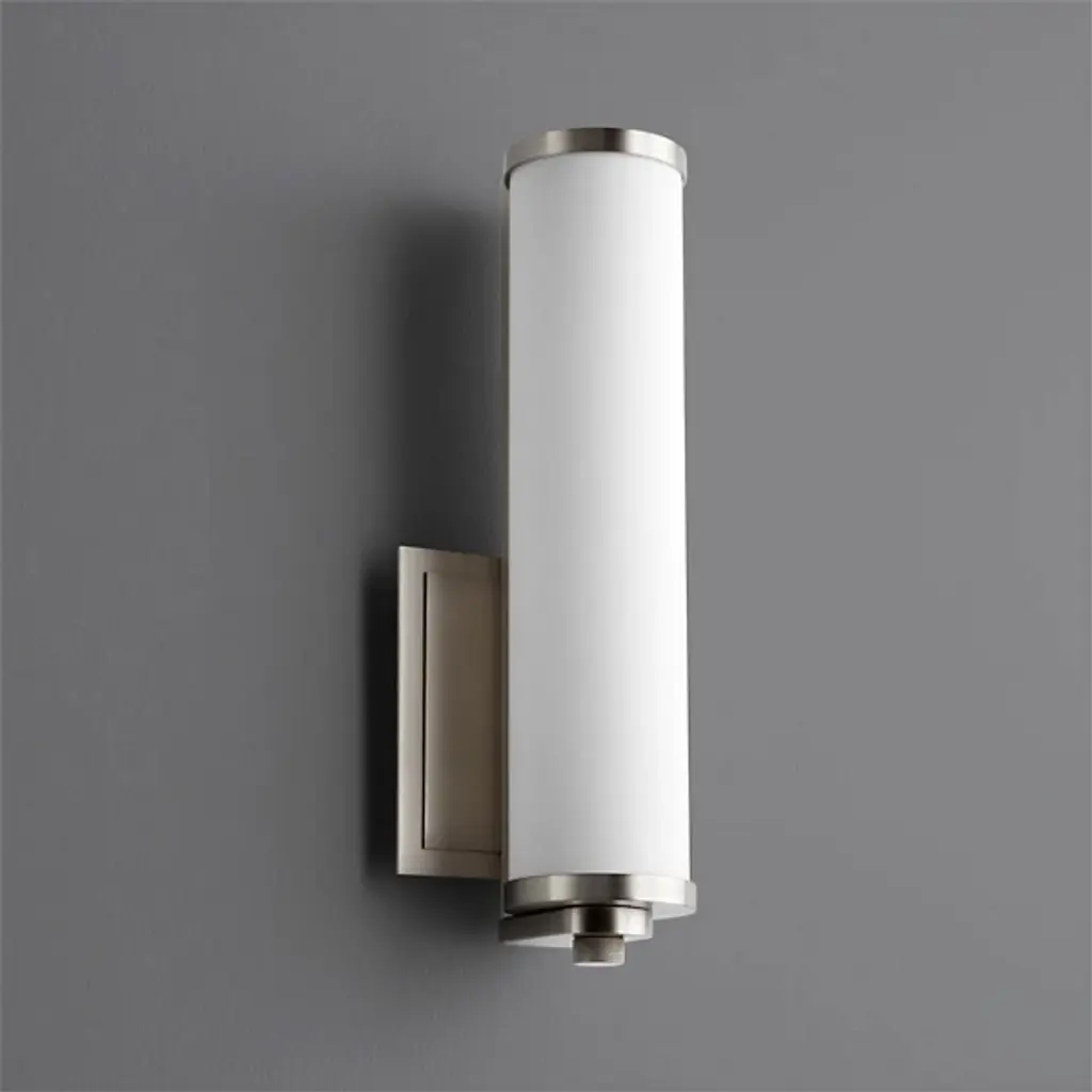The Tempus LED Wall Sconce by Oxygen Lighting lends a classic look with a modern update. Mounted to the wall by a steel square backplate, a cylindrical shade made of matte white acrylic glows warmly with the light of its integrated LED lamping inside. Steel trim accents support the shade and offer a sleek contrast, while its rounded finials add character to an otherwise understated design. Ideal for brightening a bathroom, hallway, or bedroom, this sconce brings a soft and stylish accent to its environment.