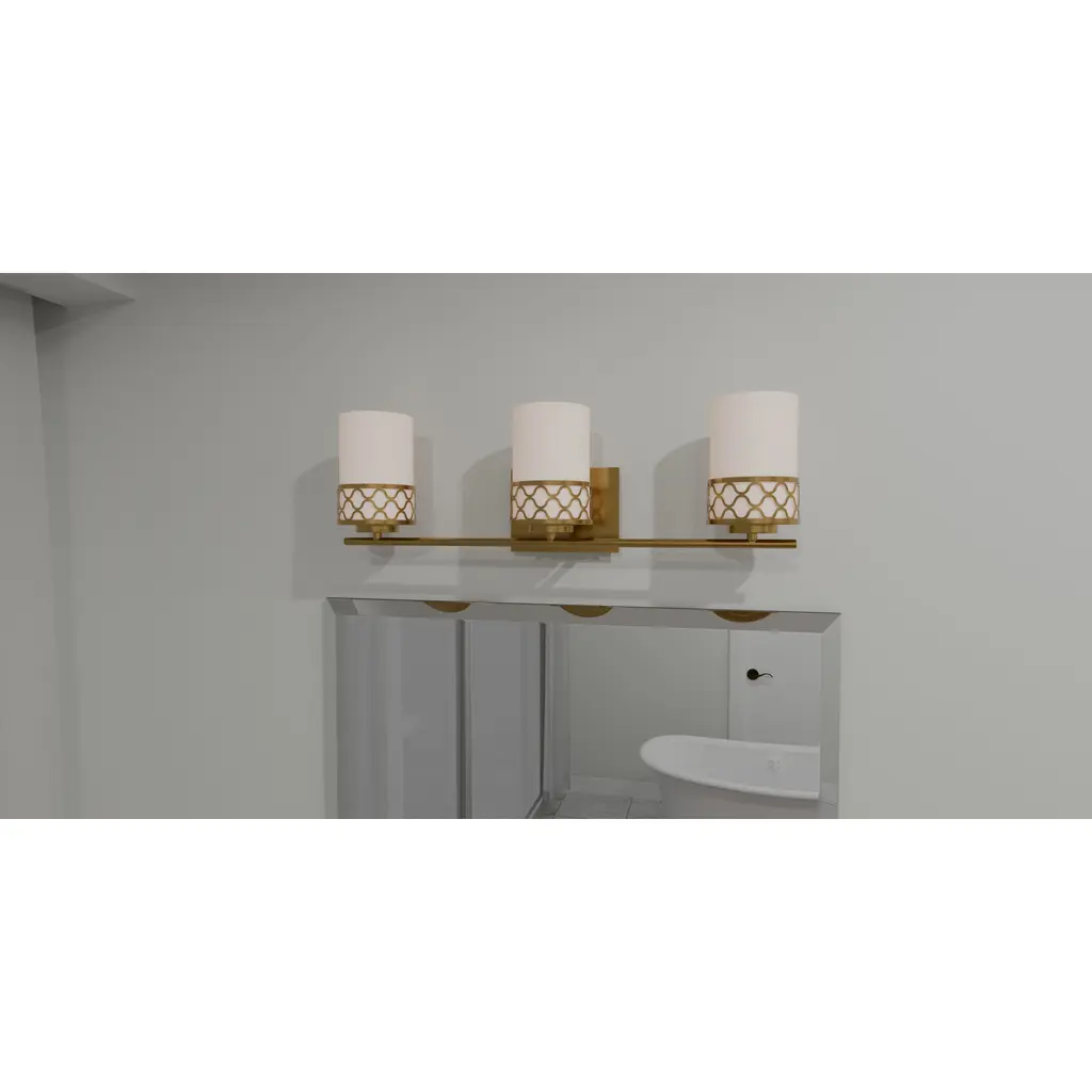 Add a touch of modern luxury to your bathroom with Tenley. The opal etched glass shades are wrapped in a delicate geometric pattern, inspired by the cool curving lines of Moroccan architecture. An aged brass finish adds sophistication and shine, making Tenley bath lights the perfect statement over any vanity.