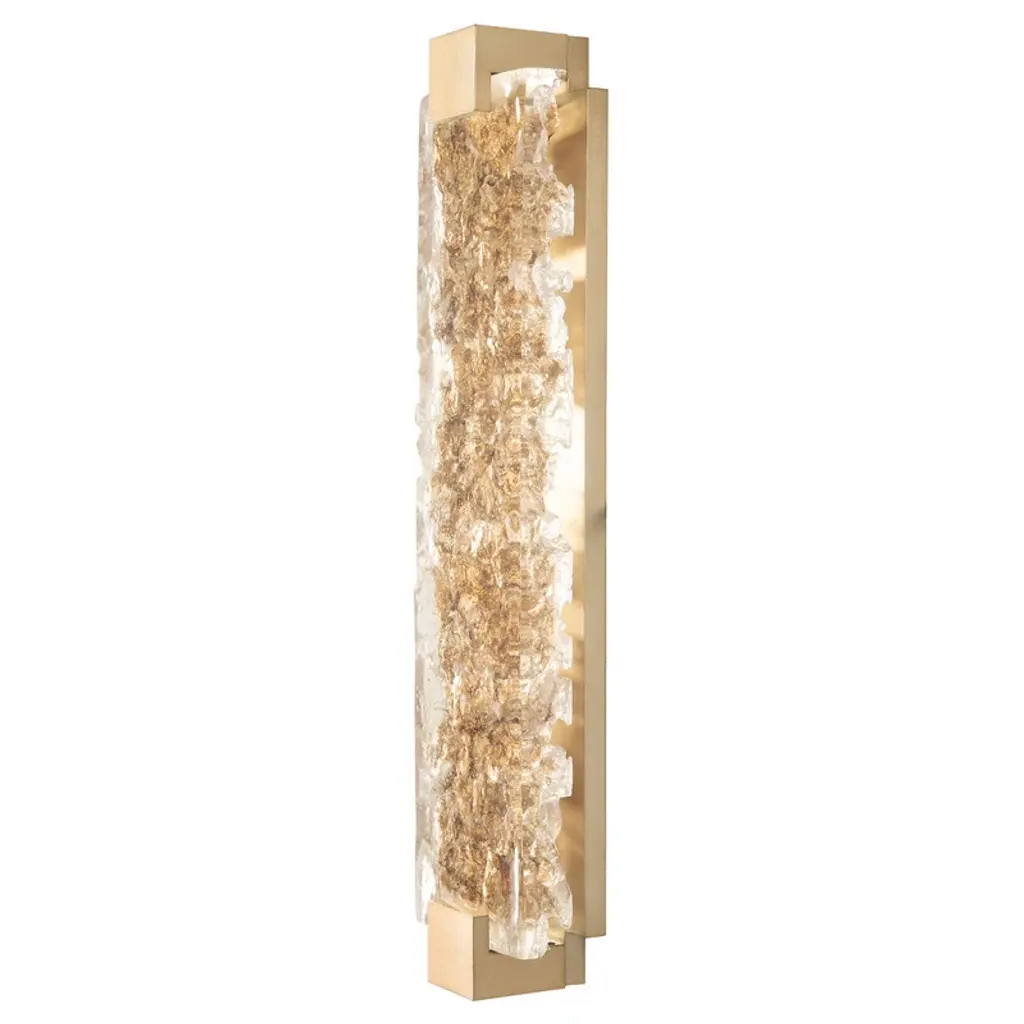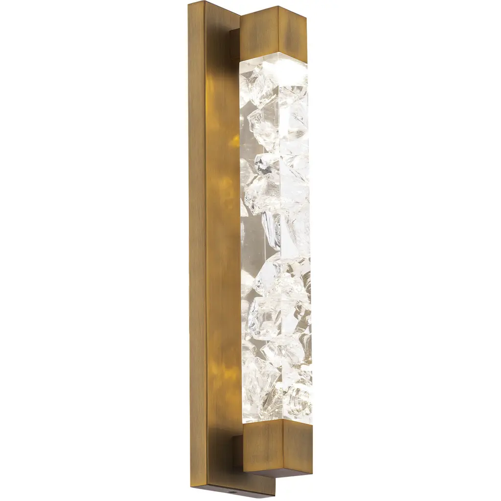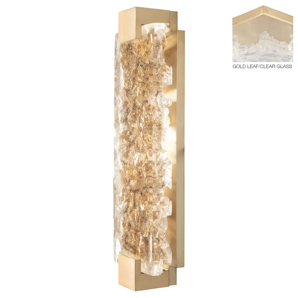 The indoor/outdoor sconce features a three-dimensional contrast of deep textured and polished cast glass. This stunning landscape of glass is illuminated by waterproof LEDs.