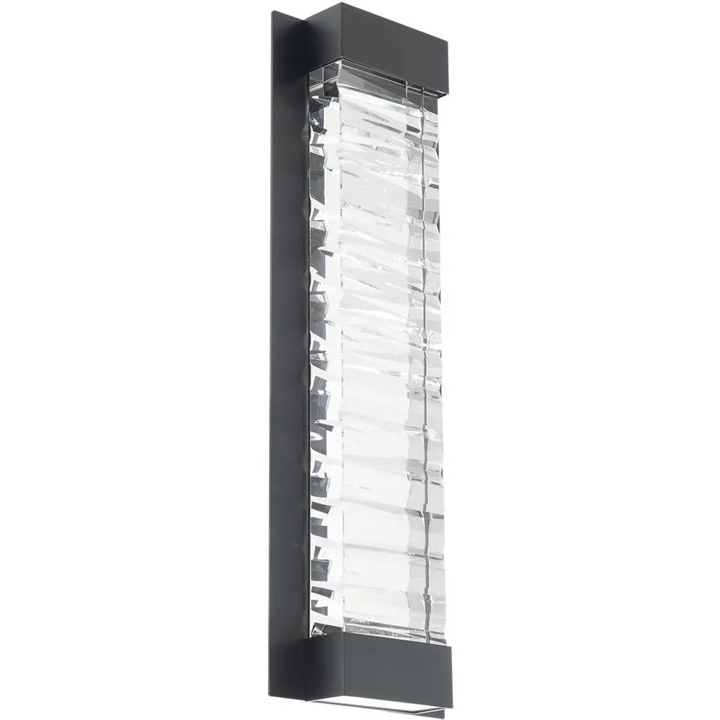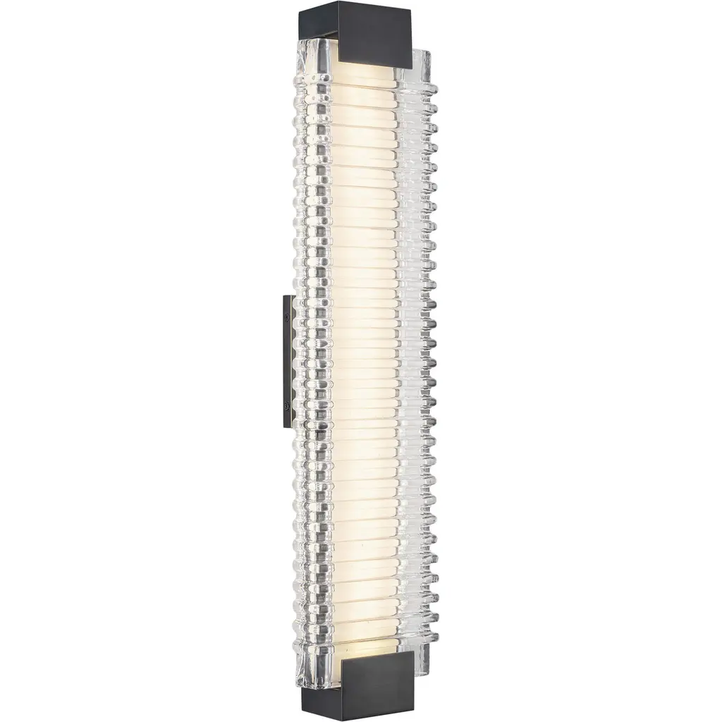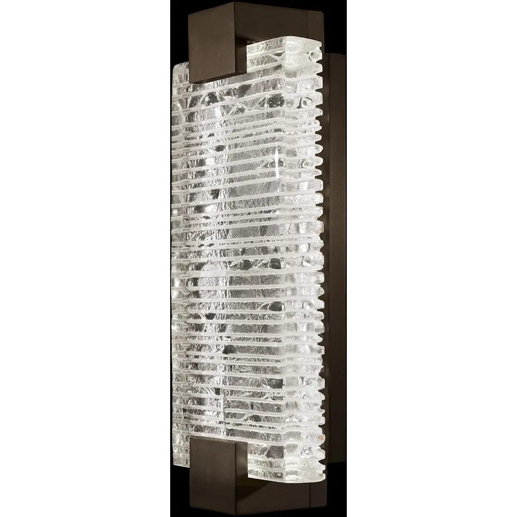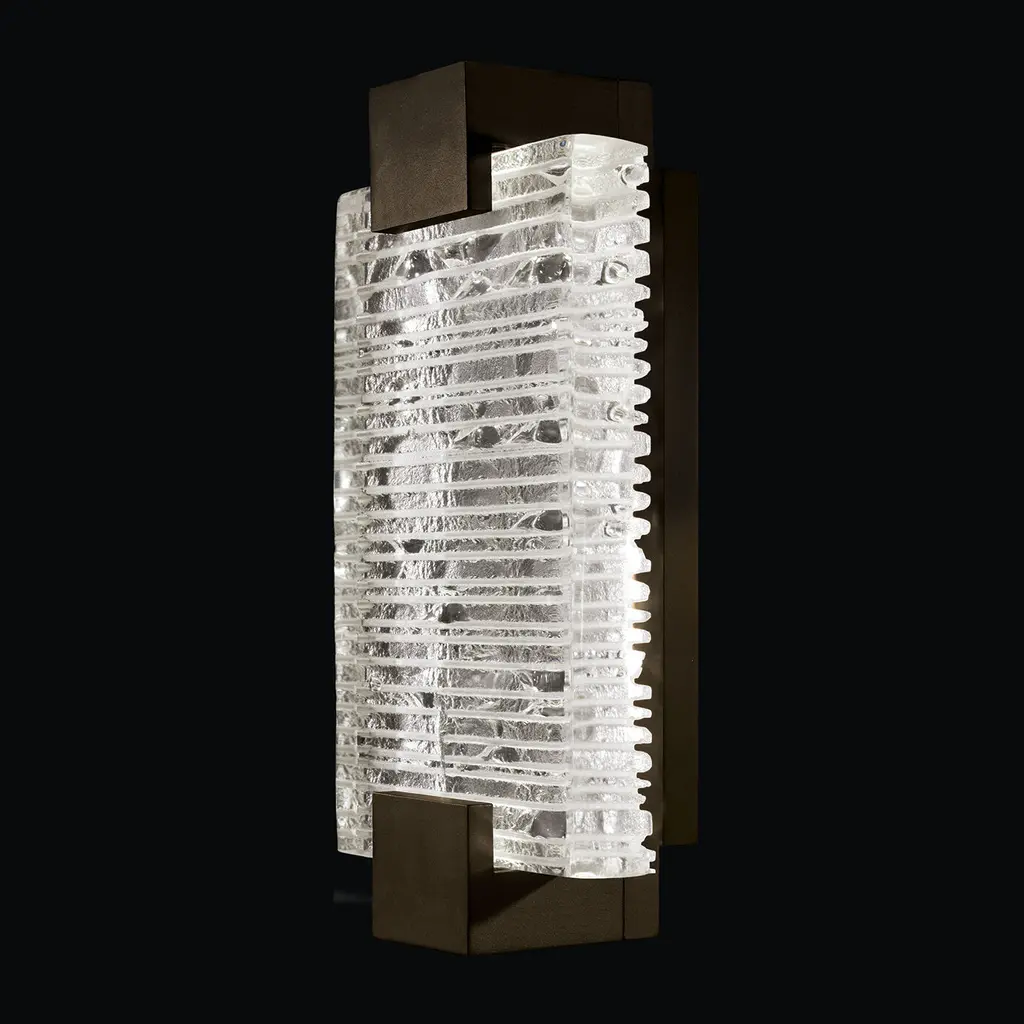 Sconce featuring Rake cast glass. Inspired by Zen patterns formed with tiny pebbles, Rake combines monumental cast glass with deep hand carved patterns, perfectly captured by an array of hidden waterproof LEDs, giving the glass a truly contemporary feel to an ancient pattern. Choice of four finishes, champagne tinted gold leaf finish or silver leaf for indoor only, and a bronze (shown) or hand rubbed black iron for indoor and outdoor use.
