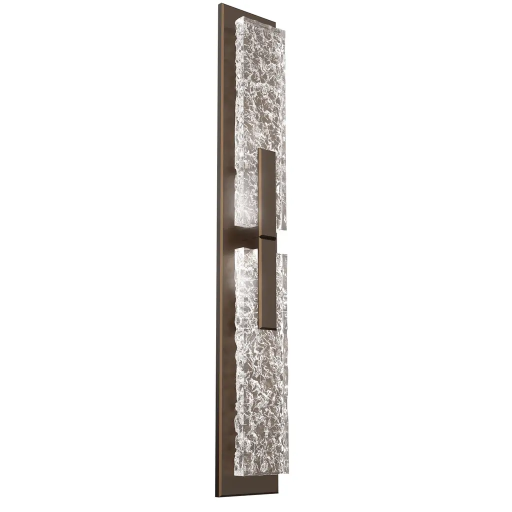 Sconce featuring Rake cast glass. Inspired by Zen patterns formed with tiny pebbles, Rake combines monumental cast glass with deep hand carved patterns, perfectly captured by an array of hidden waterproof LEDs, giving the glass a truly contemporary feel to an ancient pattern. Choice of four finishes, champagne tinted gold leaf finish or silver leaf for indoor only, and a bronze (shown) or hand rubbed black iron for indoor and outdoor use.