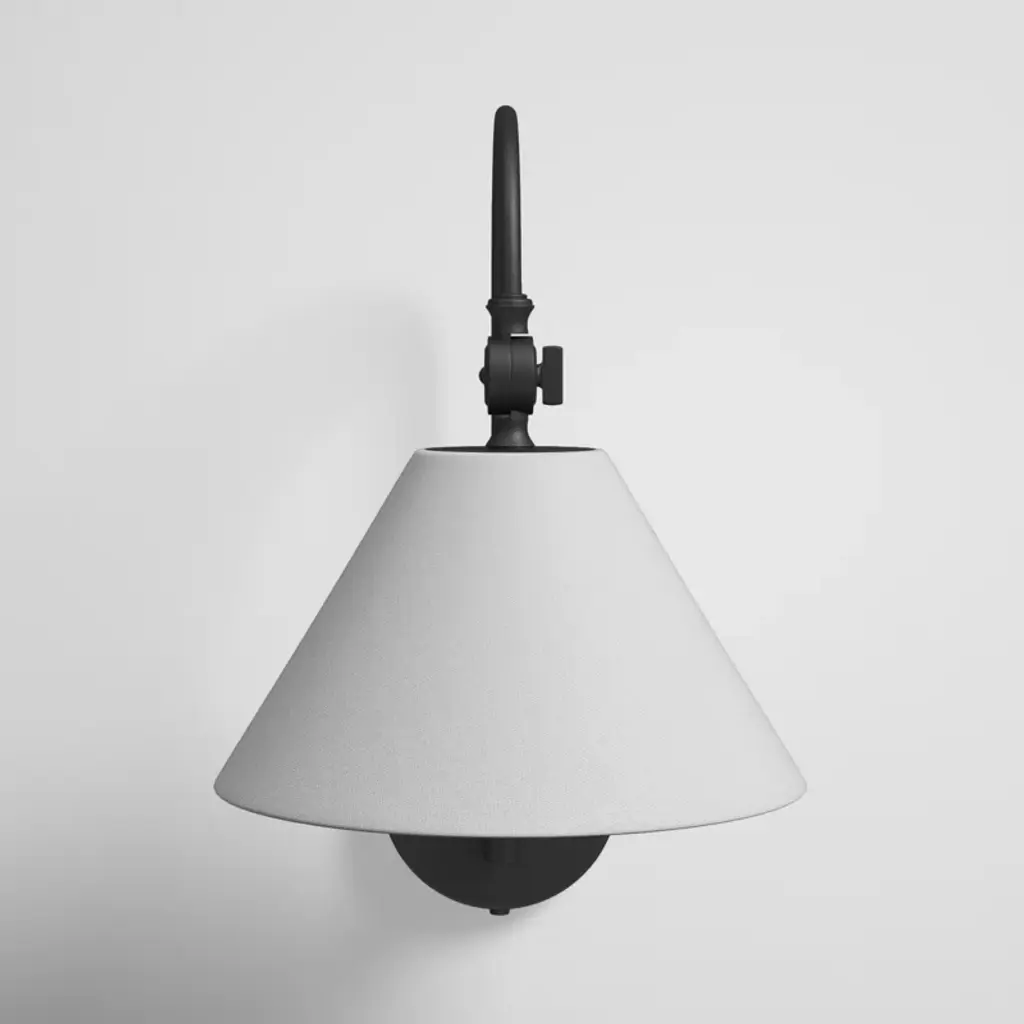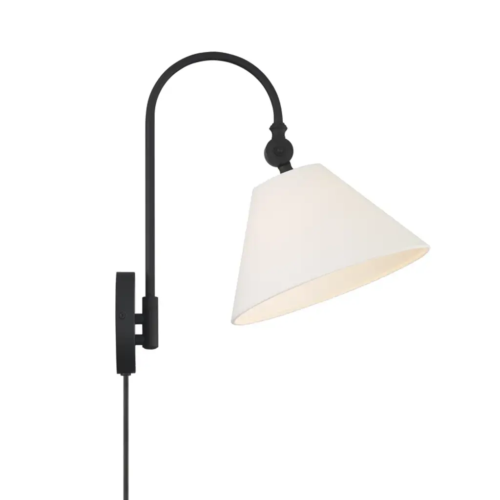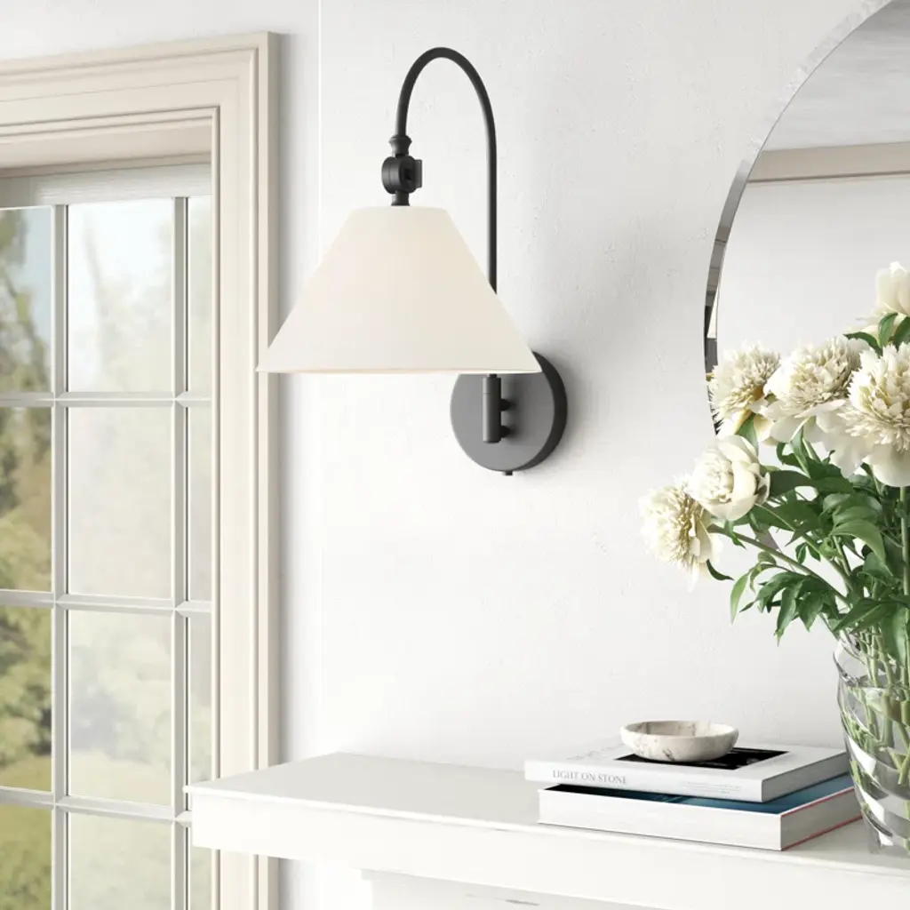 This 1-light adjustable wall sconce brings convenient illumination with a classic style touch. A dramatic curving arm is topped with a white fabric shade that can be adjusted to meet your changing lighting needs. Natural brass finish. This sconce can be hard-wired or plugged in to a wall outlet. 16" height, 10" width. Wall extension ranges from 10" to 13". Max 60 watt bulb, standard size A19 bulb recommended. LED bulb compatible. Damp area rated.