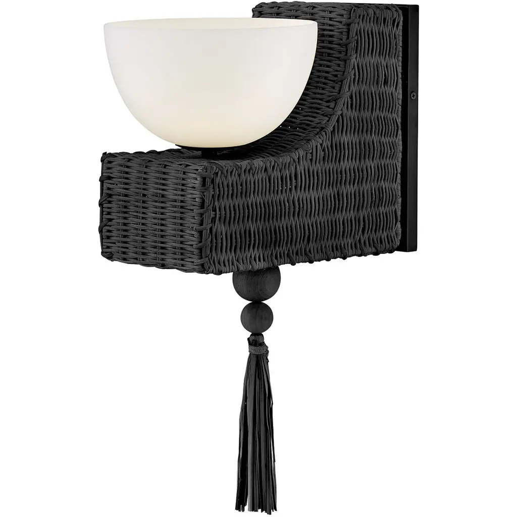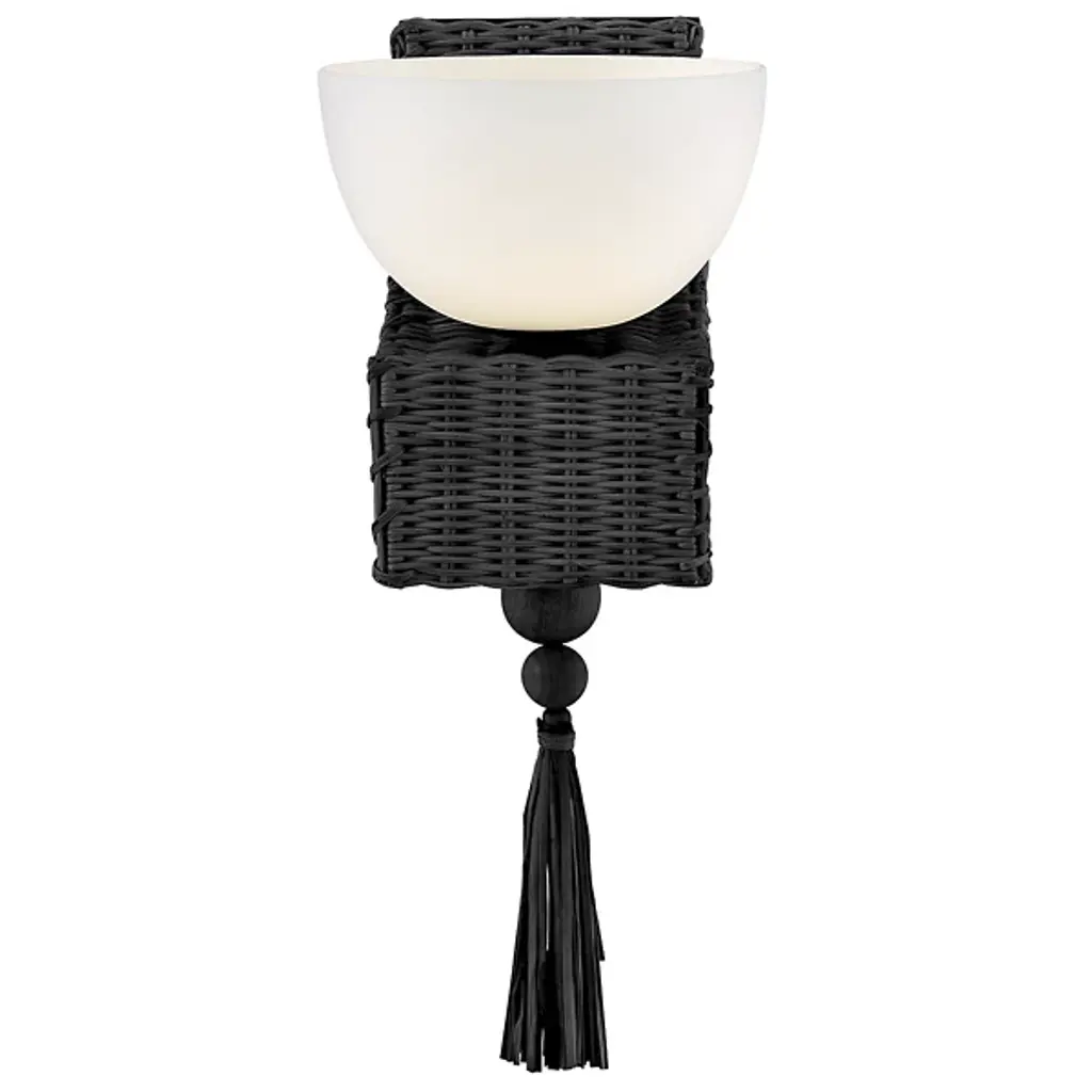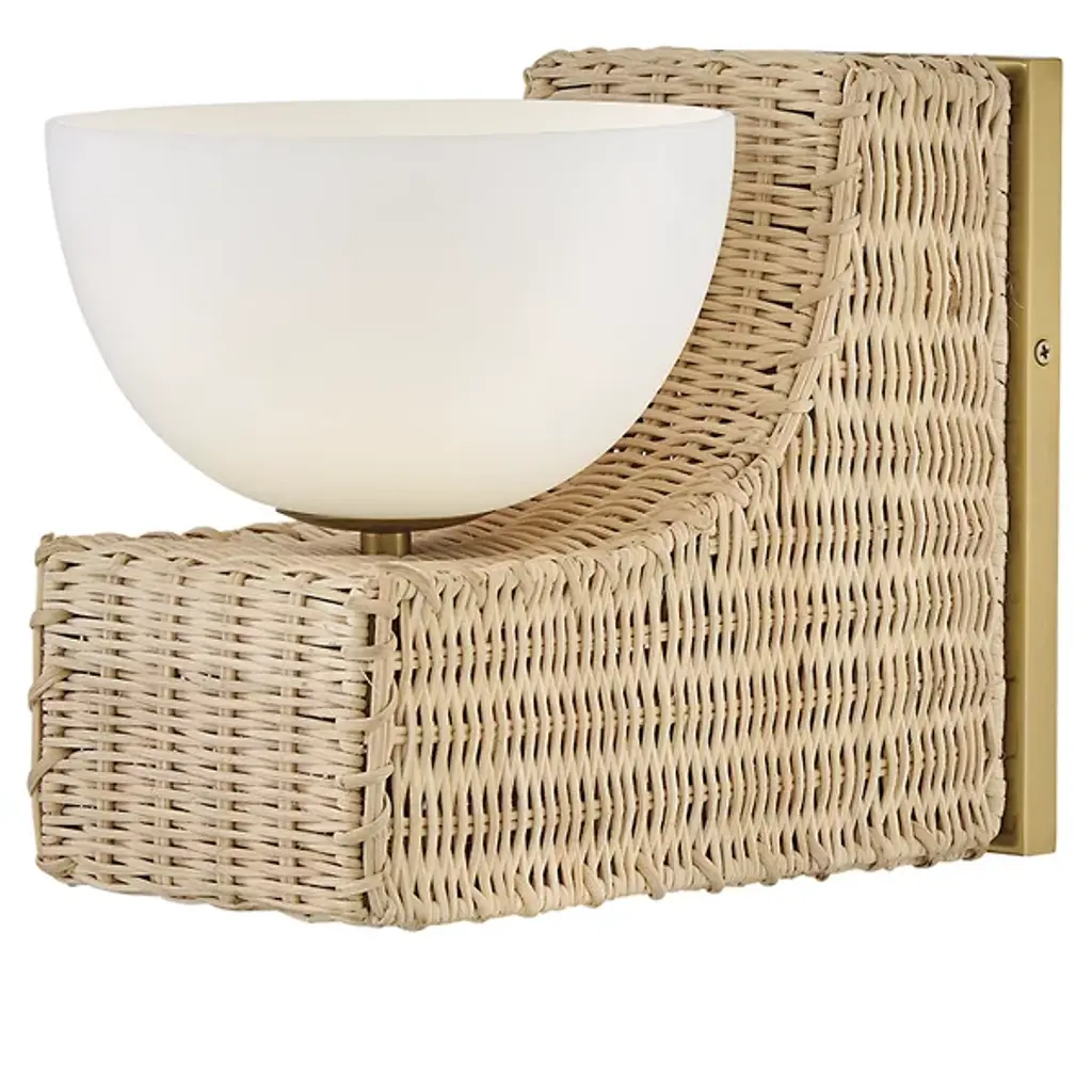 The Thalia Bath Wall Sconce from Hinkley draws inspiration from a California coastal landmark, incorporating natural raffia in a whimsical and unexpected woven pattern. The shallow opal glass bowl gently filters light, while a removable decorative tassel adds personality to the design. This steel-constructed sconce brings a relaxed coastal essence to restroom spaces. The upward-facing orientation produces a balanced glow, while its damp location rating ensures lasting performance in bathroom environments.