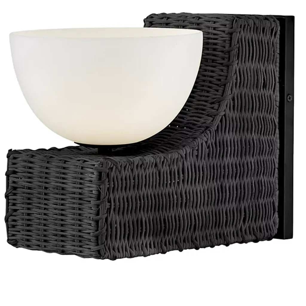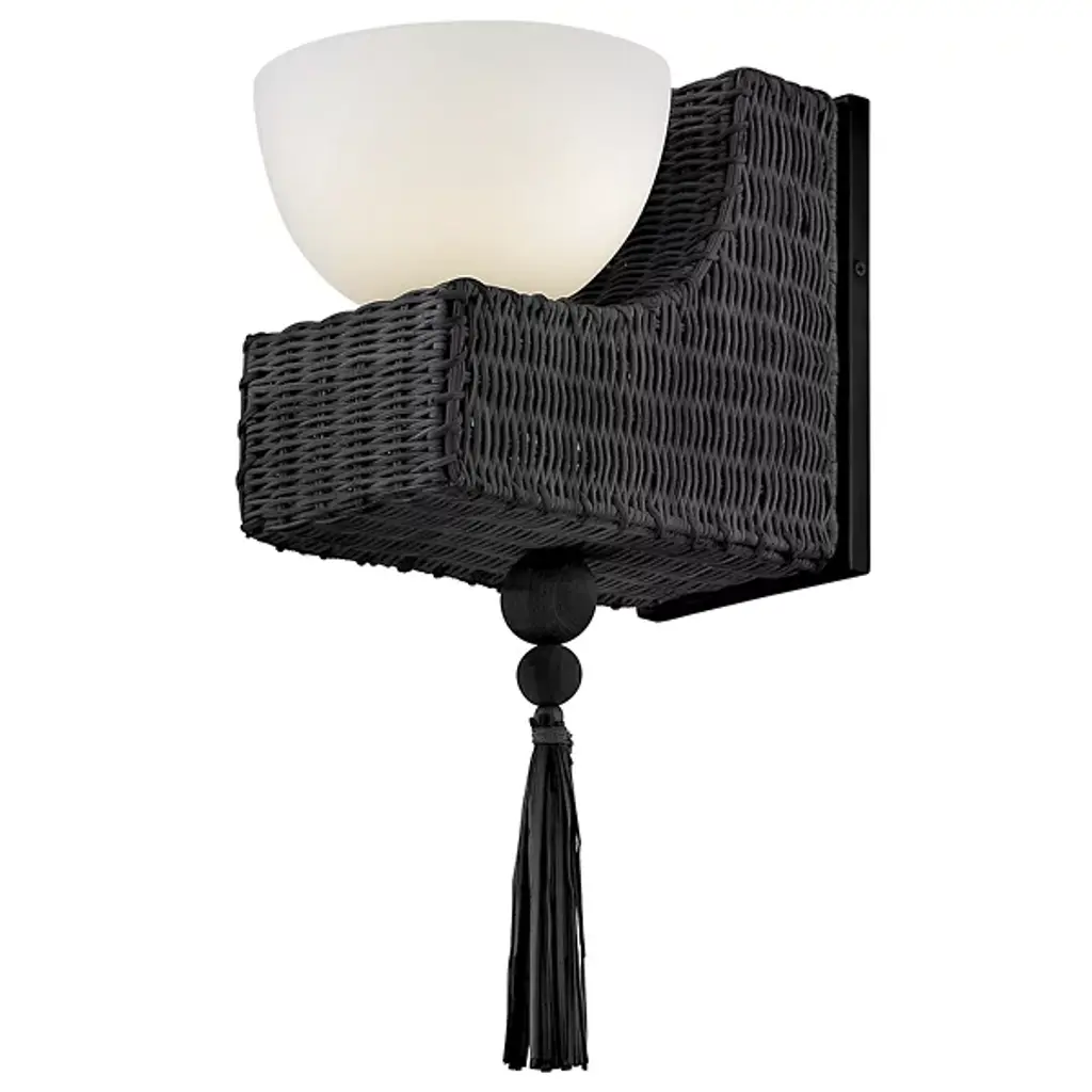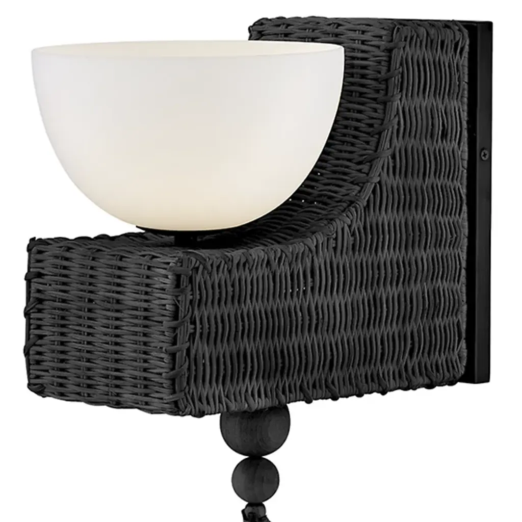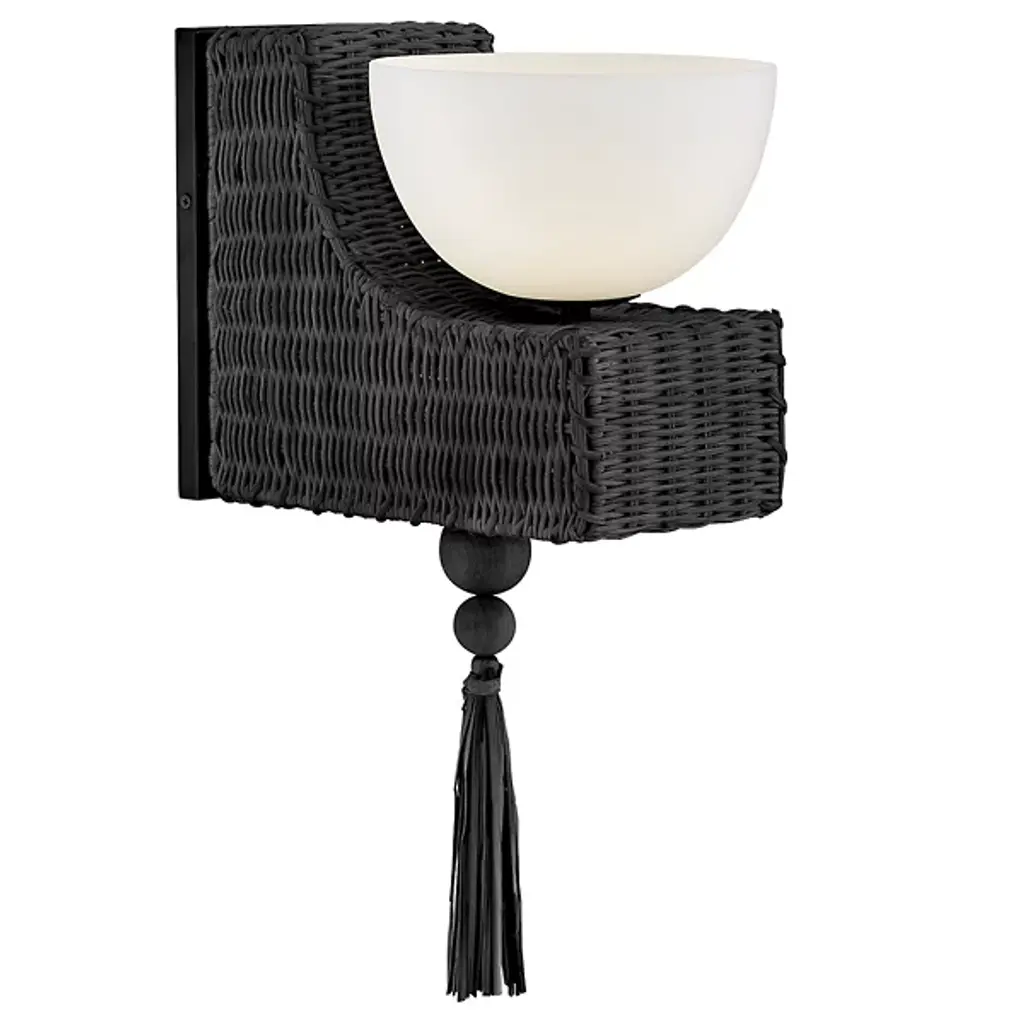 The Thalia Bath Wall Sconce from Hinkley draws inspiration from a California coastal landmark, incorporating natural raffia in a whimsical and unexpected woven pattern. The shallow opal glass bowl gently filters light, while a removable decorative tassel adds personality to the design. This steel-constructed sconce brings a relaxed coastal essence to restroom spaces. The upward-facing orientation produces a balanced glow, while its damp location rating ensures lasting performance in bathroom environments.