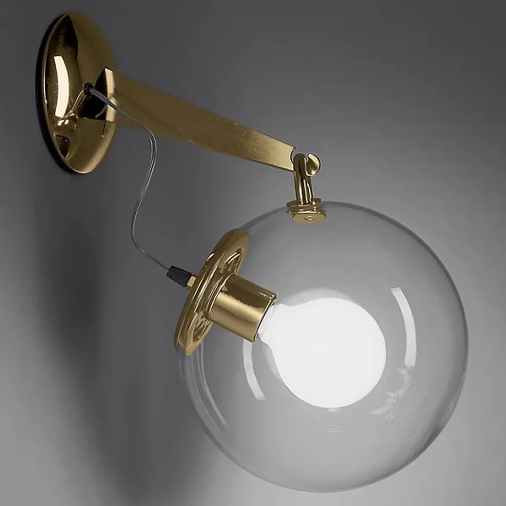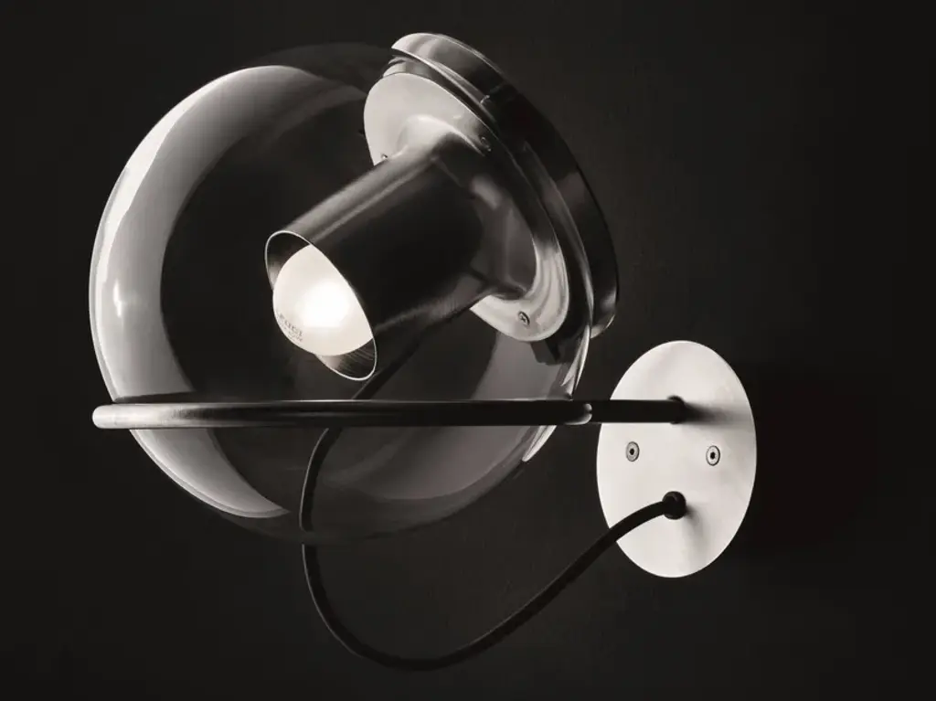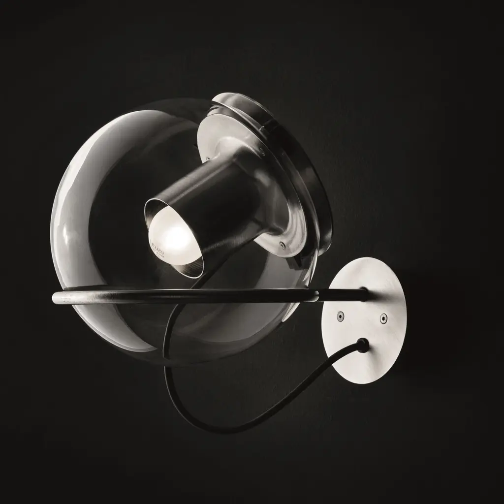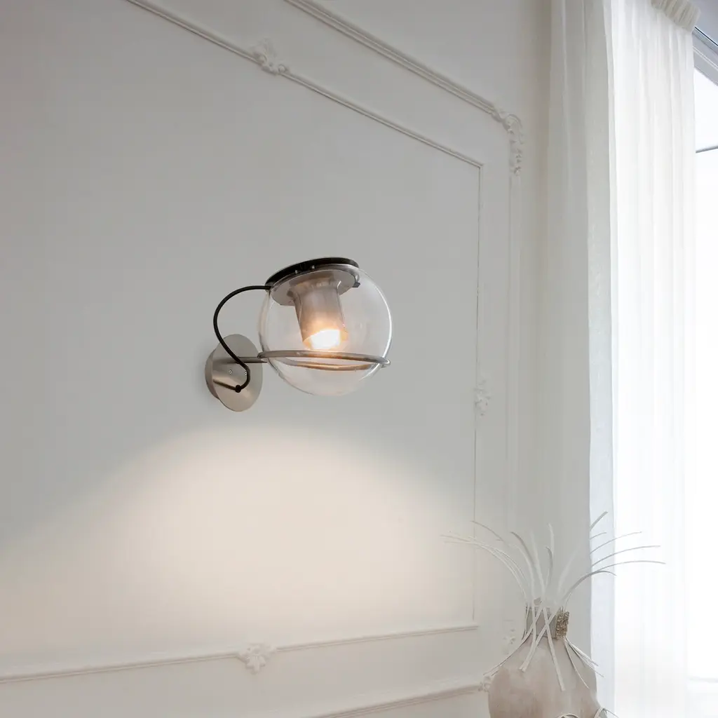 The Globe Wall Lamp by Oluce, designed by Joe Colombo in 1964, features a minimalist, transparent blown-glass sphere that encases a cylindrical metal reflector. This design balances direct and diffused light, with the internal reflector focusing illumination outward while enhancing the glass’s soft glow. The lamp is crafted with a satin nickel or satin gold finish.