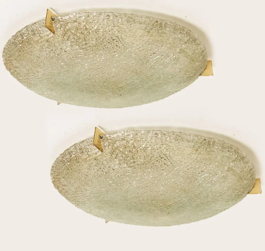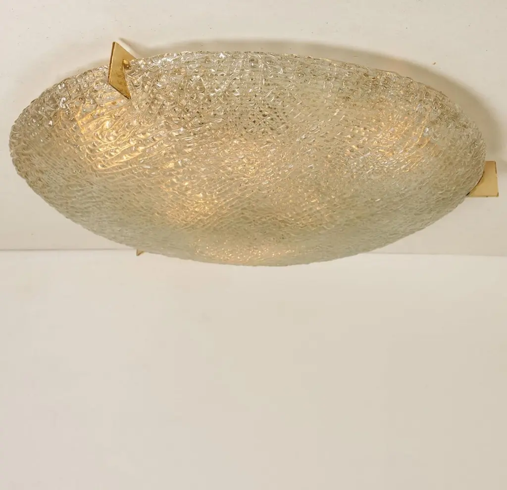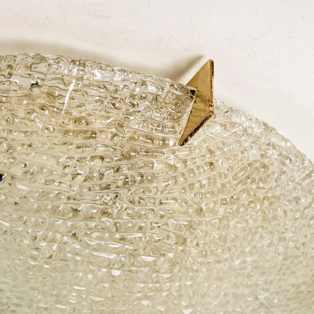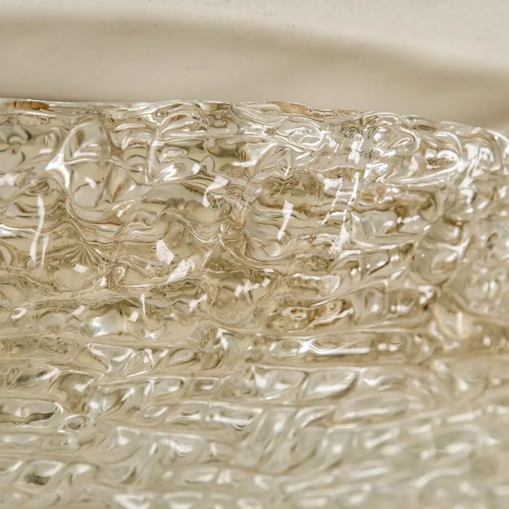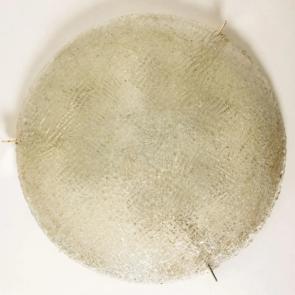 High quality modern thick textured ice glass flush mount. Made by the company Hillebrand, Germany in circa 1965. The flush mount features an impressive huge round handmade glass dish. The back plate is made of white metal. Can also work as an impressive wall light.In very good condition. With back plate and mounting hardware. Held in place by brass screws. Can be replaced by chrome clamps.The light requires six E27 screw fit light bulbs. Cleaned well-wired and ready to use.please notice the price is for 1 pieces. 2 pieces available.Hillebrand is a German manufacturer of high-end lighting fixtures. The companies shows the same quality as fixtures of companies like Kalmar, Limburg and Doria.