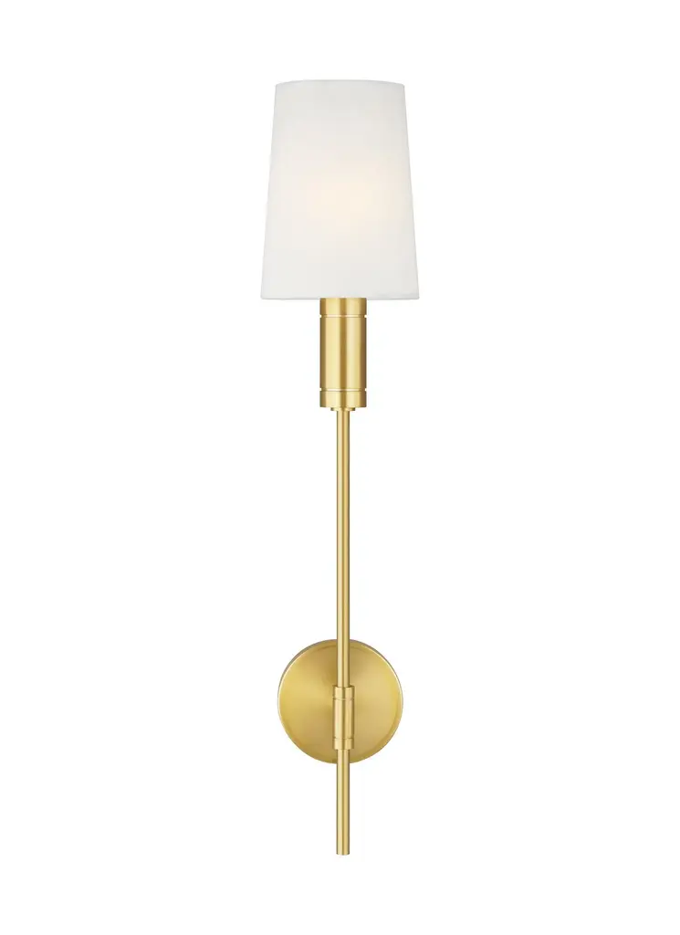 As the name suggests, Beckham Modern from TOB by Thomas O'Brien for Visual Comfort Studio Collection pairs vertical lines and globes with sophisticated, modern glamour. Crafted of steel with Burnished Brass or Polished Nickel finish, these chandeliers and one, two or six -light wall sconces emanate soft, opulent light, lending a sculptural glow wherever they are placed. Designer: Thomas O'Brien Extension: 6 5/8 Backplate: D:4 1/2'' DP:1/2'' OB UP:21 7/8'' Round Shade/Glass: white linen fabric shade Shade Diameter: 5.5 Lamping: 1 A19 Medium 60 watt light bulb Voltage: 120 Bulb Included: No Safety Rating Location: damp