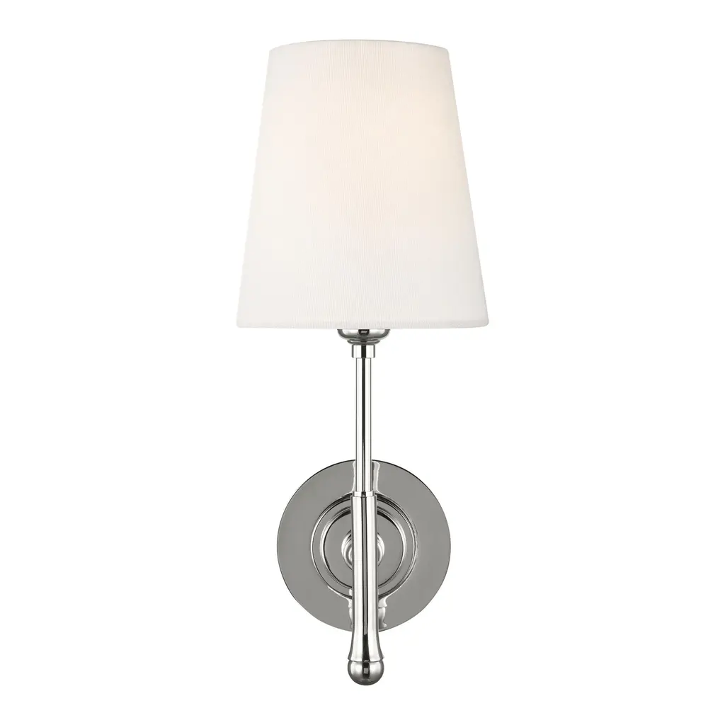 The Thomas O'Brien Capri Wall Sconce offers a timeless look, featuring a tapered White Linen shade set atop a sophisticated steel arm extending out from a round backplate. Available in Aged Iron or Polished Nickel. The Capri family also includes chandeliers with large scale arms welded into the hub, tapered, conical and globe pendants with milk glass shades and lamps. A robust and versatile series that uses classical profiles to make its distinctive finial and other fine details, from white linen shades to unique finishes. Features