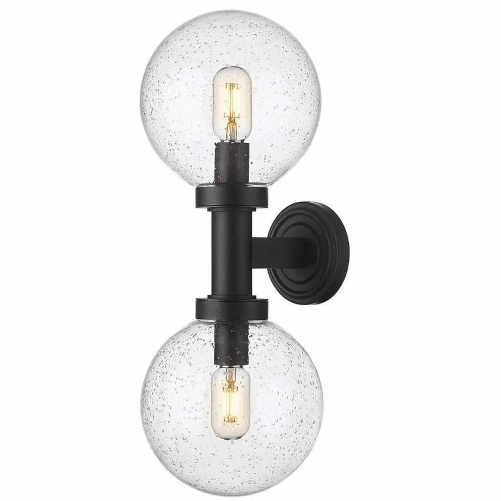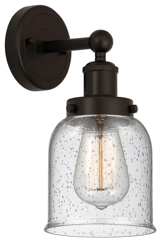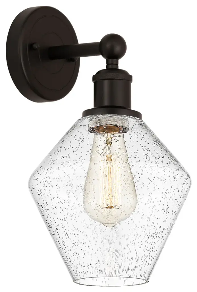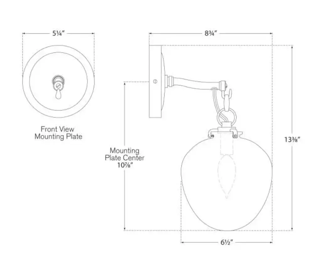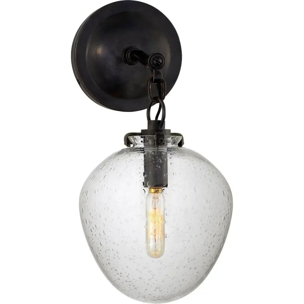 Katie Small Acorn Sconce in Bronze with Seeded Glass Designer: Thomas O'Brien Height: 13.4" Extension: 8.75" Backplate: 5.25" Round Mounting: Hardwire Shade Detail: Seeded Glass Socket: E12 Candelabra Wattage: 40 C11 Safety Rating Location: DAMP