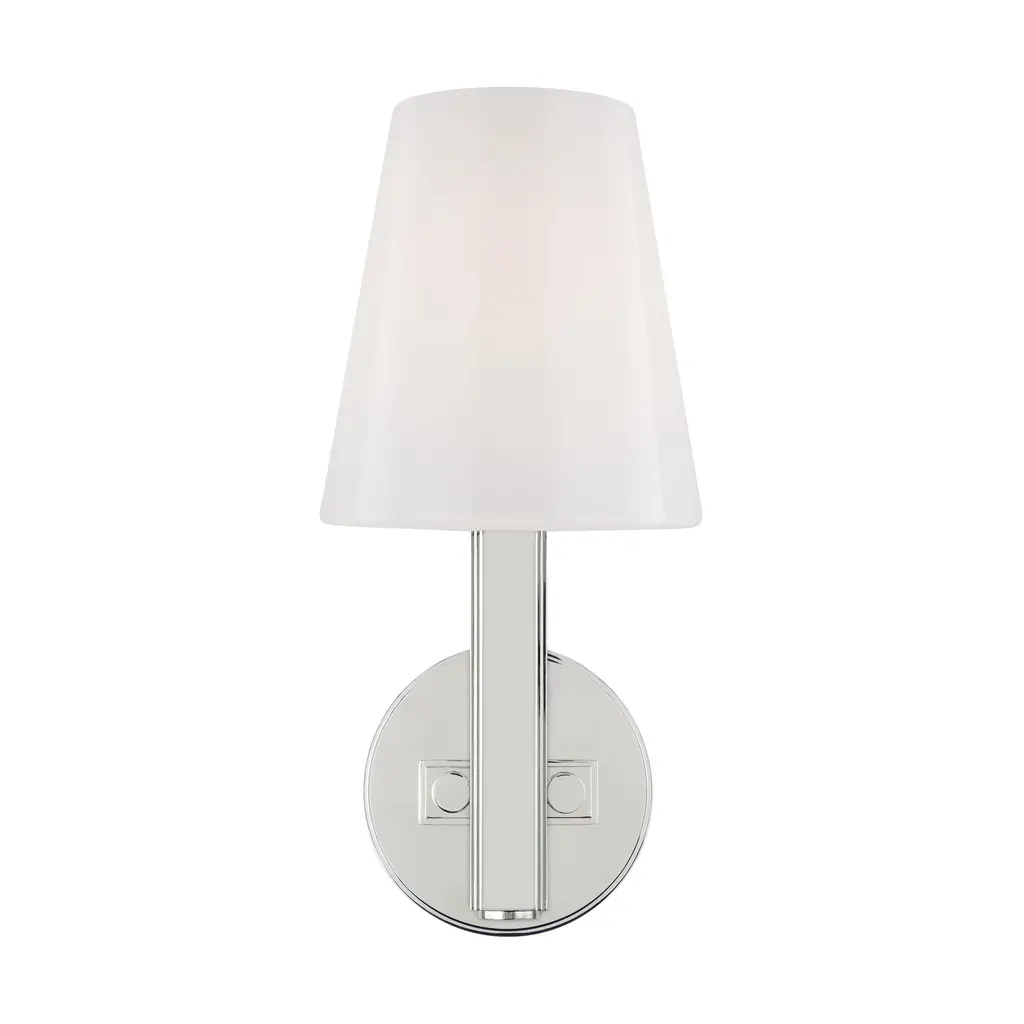 Mirroring the masterful design aesthetic of bridging traditional and modern styles, the Thomas O'Brien Logan TV1111 Wall Sconce is a compact, yet visually striking luminary ready to brighten up any room in your home. Featuring a tapered milk white glass shade atop a slim arm set into a round backplate, this versatile wall sconce is suitable for a wide variety of interiors. Available in several classic finishes, this sconce is perfect for damp locations like a bathroom or well-covered patio. Features