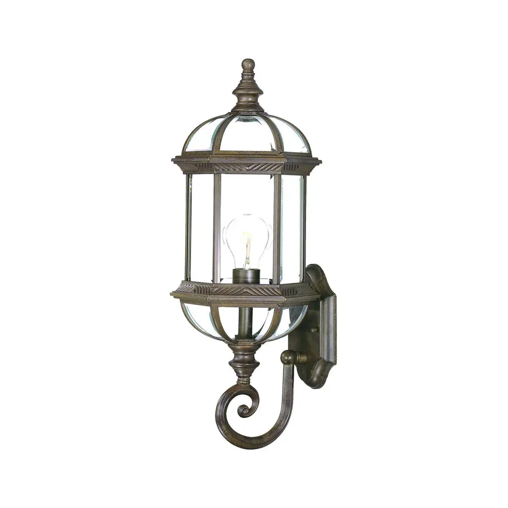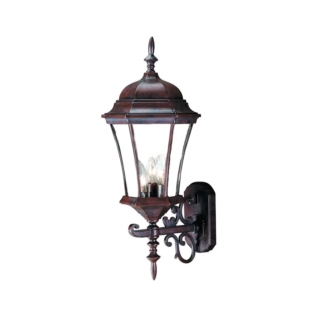 With this Three Light Brown Domed Textured Glass Lantern Wall Light you can add more style and brightness to any outdoor space of your home. The wall bracket has a medallion shape with a brown finish on top. The swing arm is a simple extended rod attached to the bottom ornament of the light and has curved spiral details around it. The light itself is designed after a carousel lantern with a two-step ornament domed roof and a straight six rod frame. The base is a simple flat diamond shape. The textured glass panels inside the frame add a nice touch of contrast against the brown color. The light has three bulbs inside it. Use it on its own or as a pair around your front or back door. 26" H x 9" W x 10" D