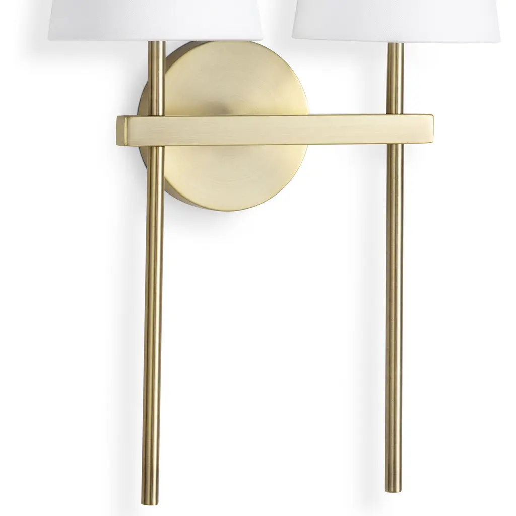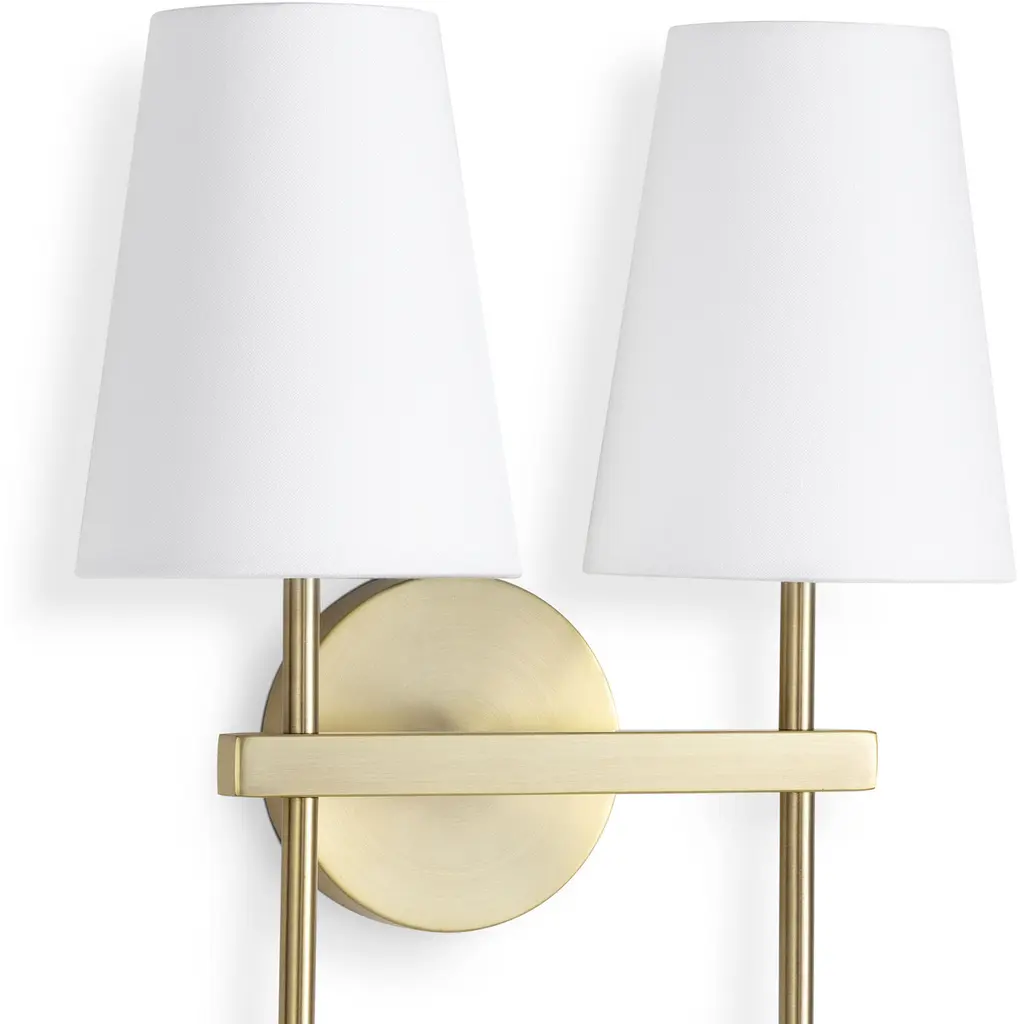 Sleek and elegant, the Toni Sconce Double is a minimalist solution that brings a touch of sophistication to any space. This double armed sconce seamlessly combines simplicity with functionality, featuring two natural linen lamp shades and a natural brass finish that radiates timeless charm. Place this versatile sconce in a bedroom, near a vanity, hallway, or kitchen to add a touch of luxe illumination.