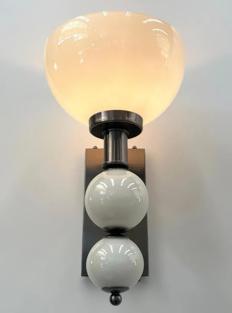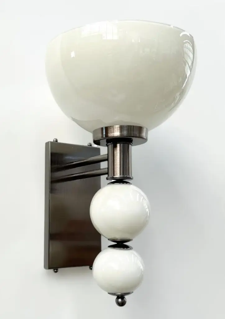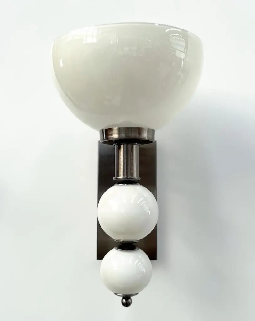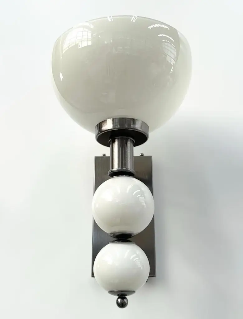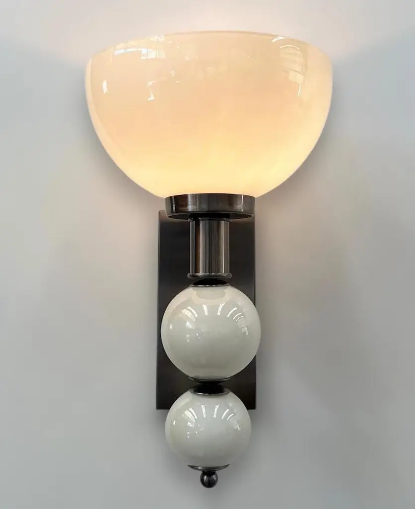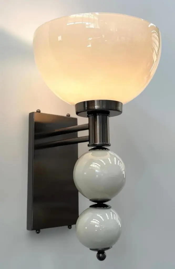 Italian wall light with hand blown cream colored Murano glass, mounted on solid brass frame in satin black nickel finish / Designed by Fabio Bergomi for Fabio Ltd / Made in Italy.1 light / E26 or E27 type / max 60W Measures: Height 16 inches, width 10 inches, depth 11 inchesOrder Only / This item ships from ItalyPlease inquire for custom options / pricing / current lead timesOrder Reference #: FABIOLTD W623 CREAMThe listed price applies to the following finishes : Bronzed, Polished Chrome, Satin Chrome, Polished Nickel, Satin Nickel, Polished Black Nickel, Satin Black Nickel, Polished Copper, Satin CopperOther finishes are available : Unlacquered Natural Brass, Unlacquered Polished Brass, Lacquered Polished Brass, Lacquered Satin Brass
