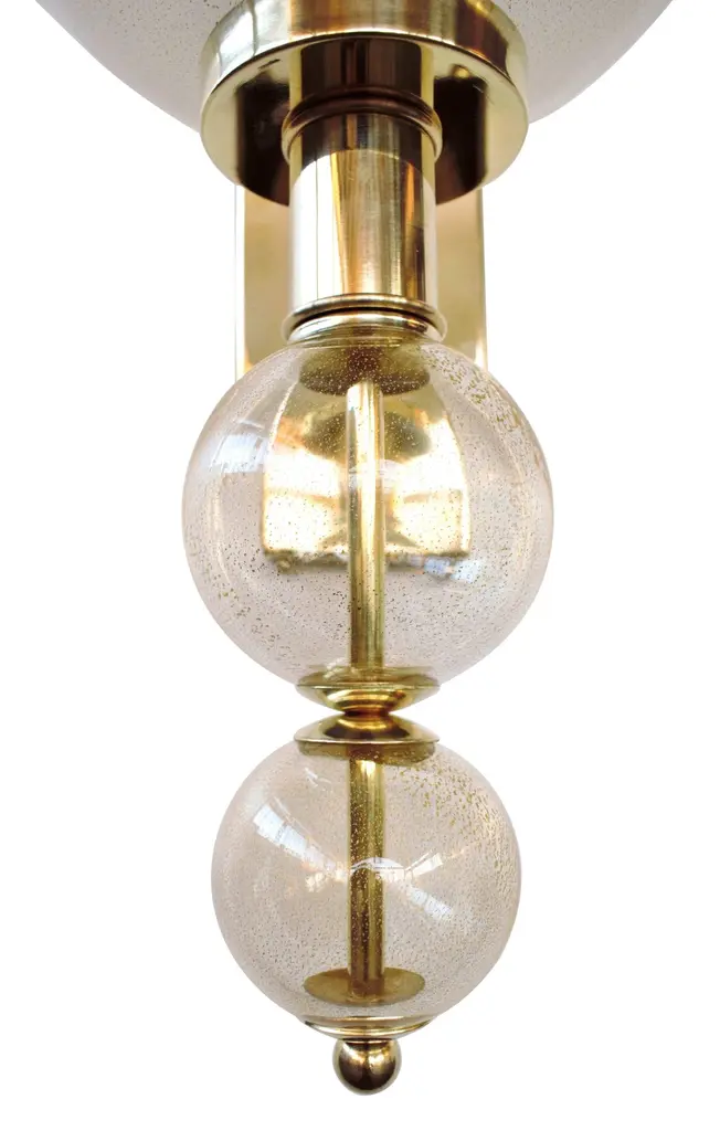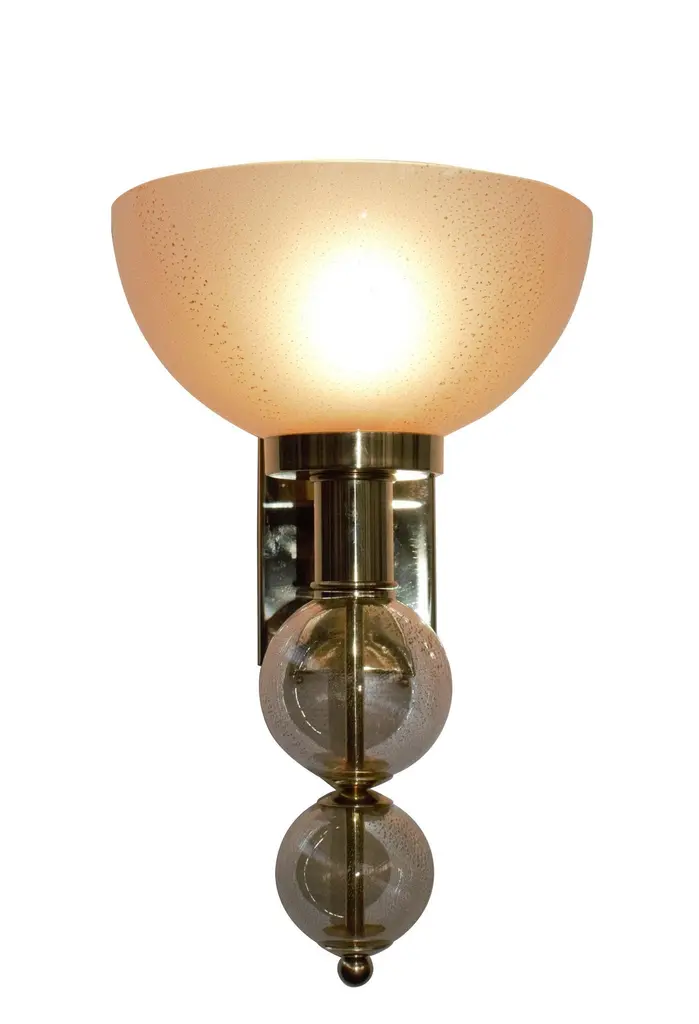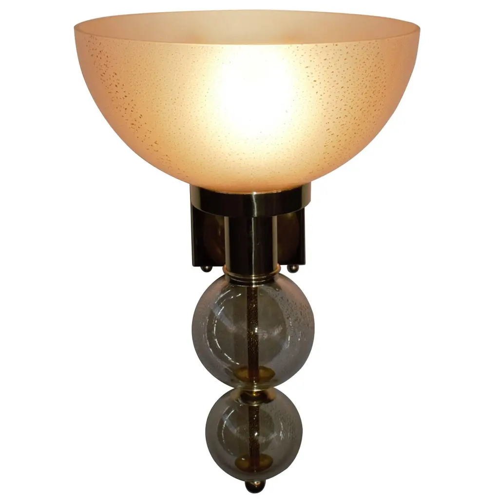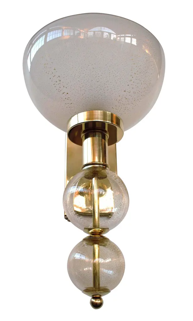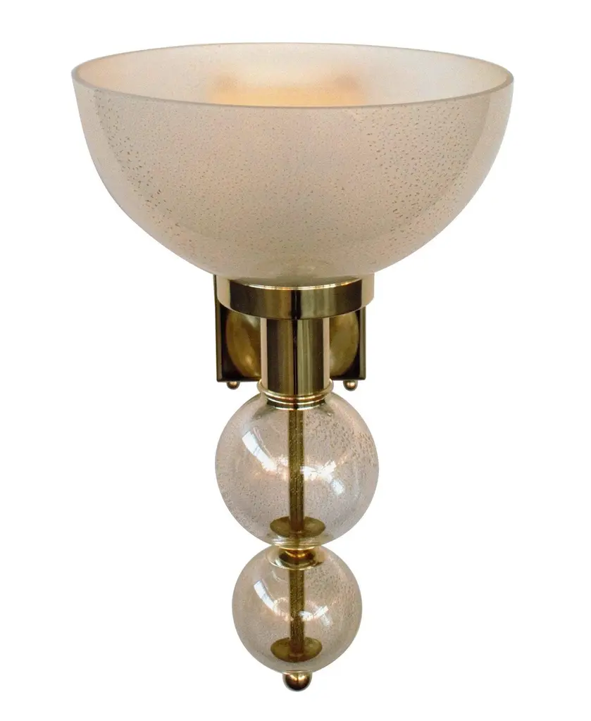 Italian wall light with clear and frosted Murano glass hand blow with gold flecks inside the glass, mounted on polished finish brass frame / Designed by Fabio Bergomi for Fabio Ltd / Made in Italy1 light / E26 or E27 type / max 40W Measures: Height 16 inches / Width 10 inches / Depth 11 inches Order Only / This item ships from ItalyPlease inquire for custom options / pricing / current lead timesOrder Reference #: FABIOLTD W366 GOLDThe listed price applies to all Brass finishes : Unlacquered Natural Brass, Unlacquered Polished Brass, Lacquered Polished Brass, Lacquered Satin BrassOther finishes available with upcharge of $100: Bronzed, Polished Chrome, Satin Chrome, Polished Nickel, Satin Nickel, Polished Black Nickel, Satin Black Nickel, Polished Copper, Satin Copper