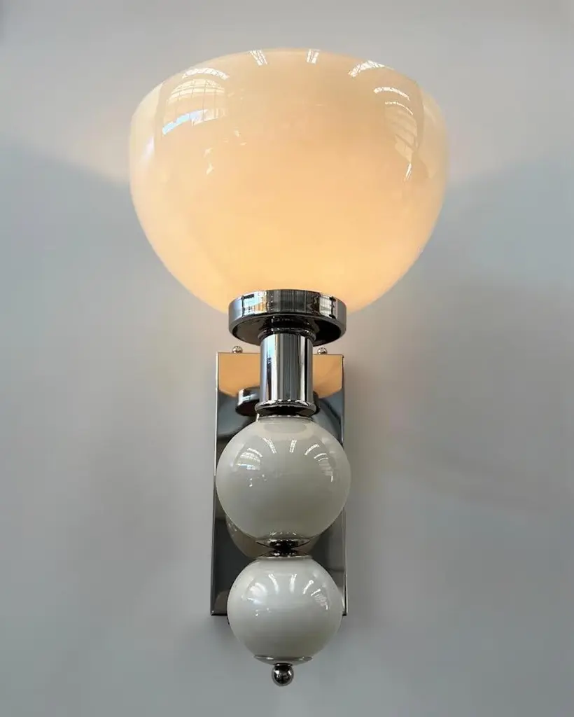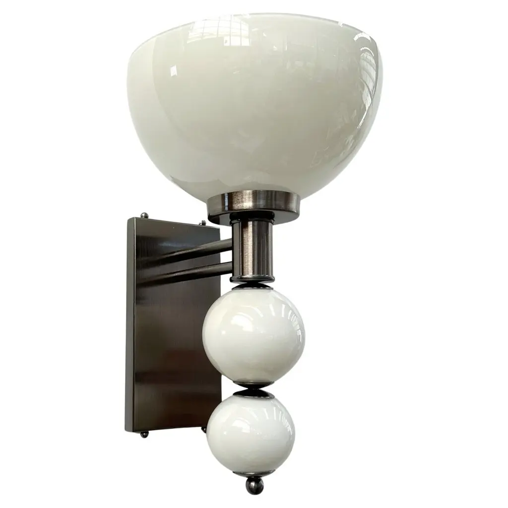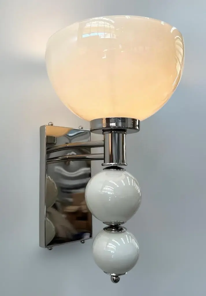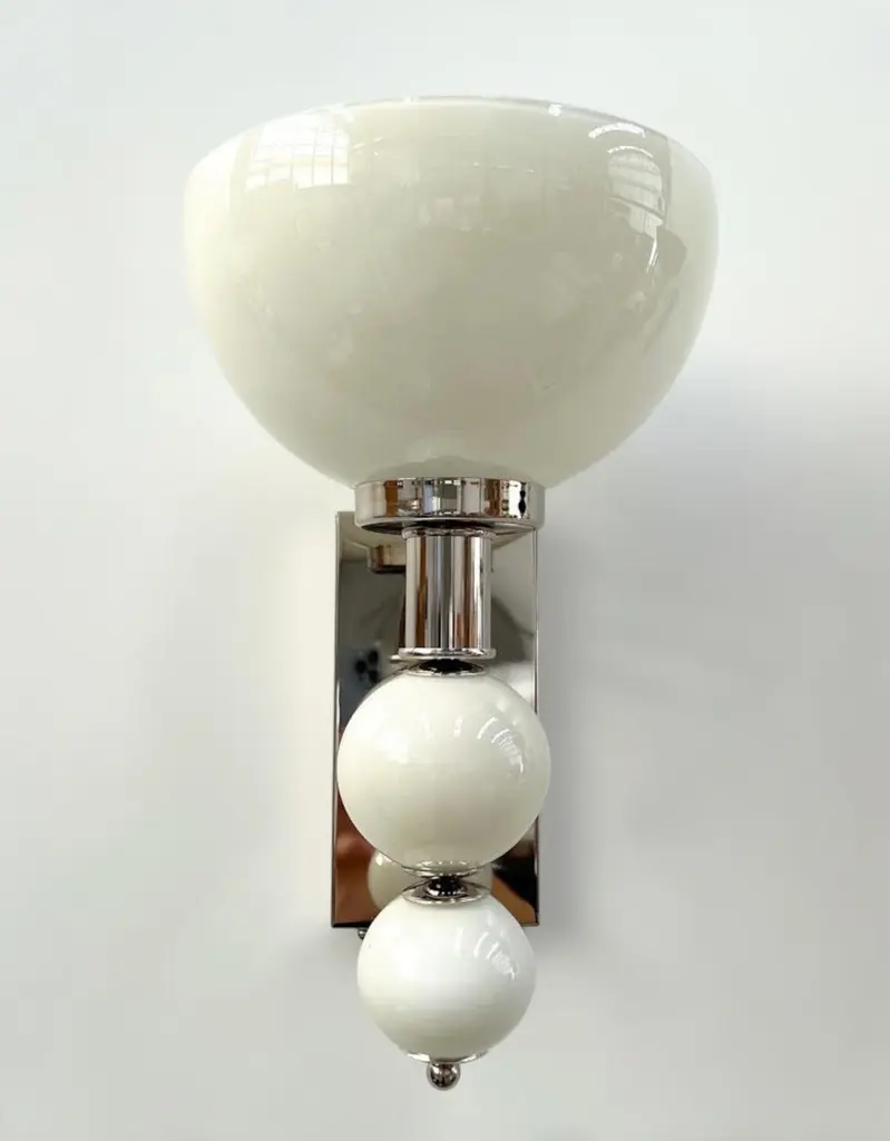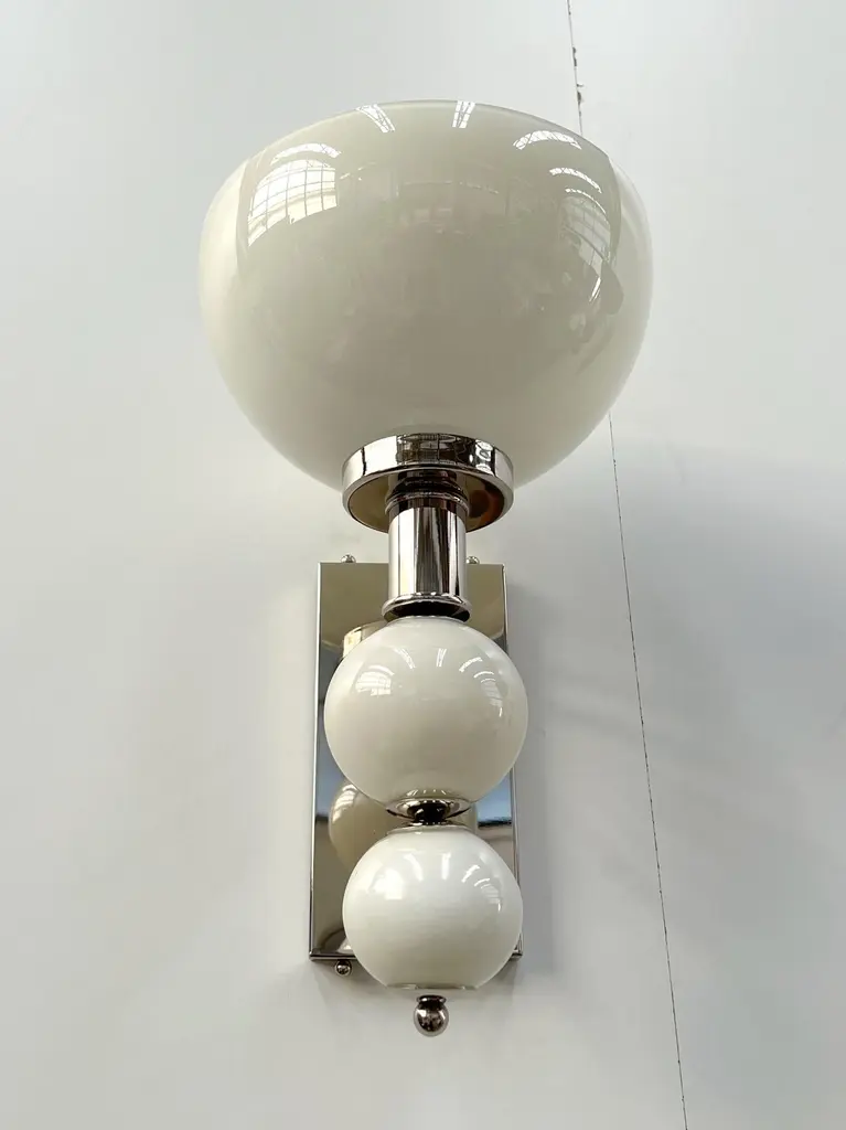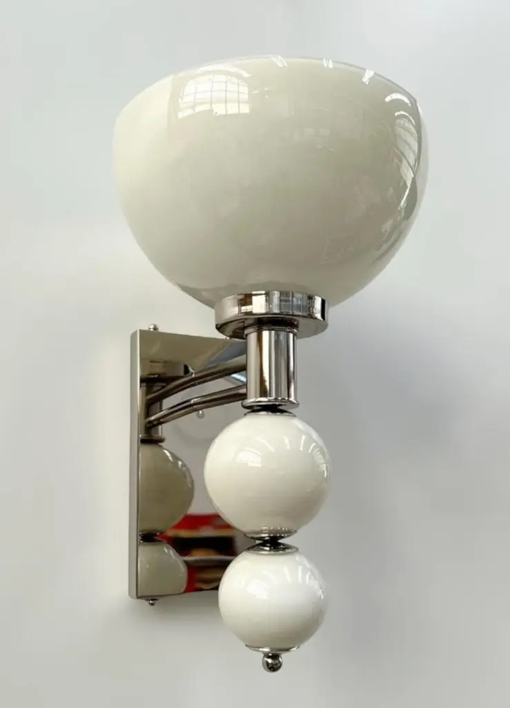 Italian wall light with hand blown cream colored Murano glass, mounted on solid brass frame in polished nickel finish / Designed by Fabio Bergomi for Fabio Ltd / Made in Italy.1 light / E26 or E27 type / max 60W Measures: Height 16 inches, width 10 inches, depth 11 inchesOrder Only / This item ships from ItalyPlease inquire for custom options / pricing / current lead timesOrder Reference #: FABIOLTD W622The listed price applies to the following finishes : Bronzed, Polished Chrome, Satin Chrome, Polished Nickel, Satin Nickel, Polished Black Nickel, Satin Black Nickel, Polished Copper, Satin CopperOther finishes are available : Unlacquered Natural Brass, Unlacquered Polished Brass, Lacquered Polished Brass, Lacquered Satin Brass