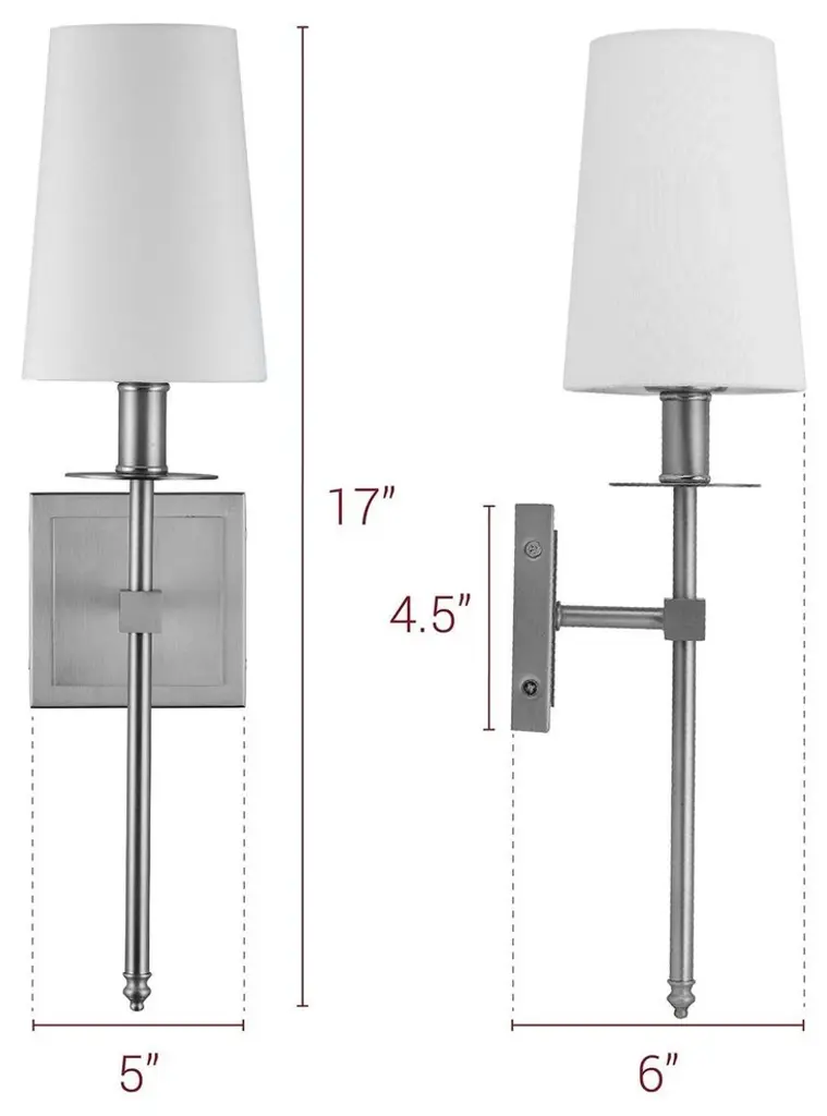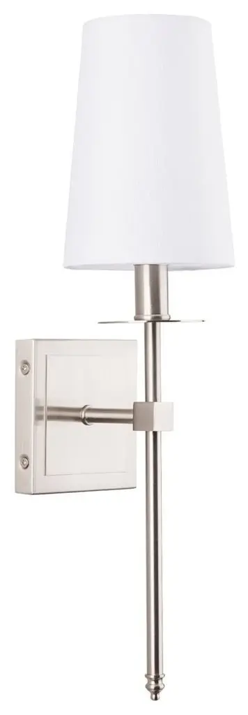 The Torcia wall sconce, made by Linea di Liara, brings a touch of contemporary sophistication perfect for bathrooms, bedrooms, corridors, entryways and living areas.- 17" high x 5" wide, extends 6" from the wall. Backplate is 4.5" in diameter. Features a 8" high x 5" diameter white fabric shade- Features an E26 socket that is compatible with a variety of incandescent, LED, CFL and halogen bulbs (60W max, sold separately). Fully dimmable when used with a dimmable bulb and compatible dimmer switch- Features a universal mounting plate compatible with most 4" octagonal, round and square or 2" x 4" junction boxes (must be hardwired, installation by a licensed electrician recommended)- This Linea di Liara product is UL listed, and is backed by a 1 year limited manufacturer''s warranty- Suitable for damp locations.