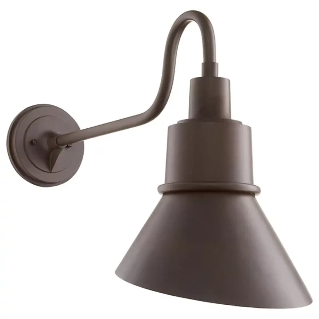A sleek, modern piece, the Torrey Outdoor Wall Sconce from Quorum International brings a crisp demonstration of light to the comfort of your yard. A simple disc-shaped wall mount extends a smooth, waving arm that presents with an S-like shape. It connects to the tiered hood that gradually widens into a sharply angled shade. A single bulb rests within, spreading a full, focused glow to the outdoor space. Rated for wet locations, this fixture is hardy enough to survive rainy weather, ensuring your space stays illuminated for years to come.