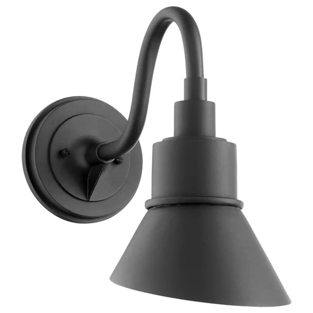A sleek, modern piece, the Torrey Outdoor Wall Sconce from Quorum International brings a crisp demonstration of light to the comfort of your yard. A simple disc-shaped wall mount extends a smooth, waving arm that presents with an S-like shape. It connects to the tiered hood that gradually widens into a sharply angled shade. A single bulb rests within, spreading a full, focused glow to the outdoor space. Rated for wet locations, this fixture is hardy enough to survive rainy weather, ensuring your space stays illuminated for years to come.